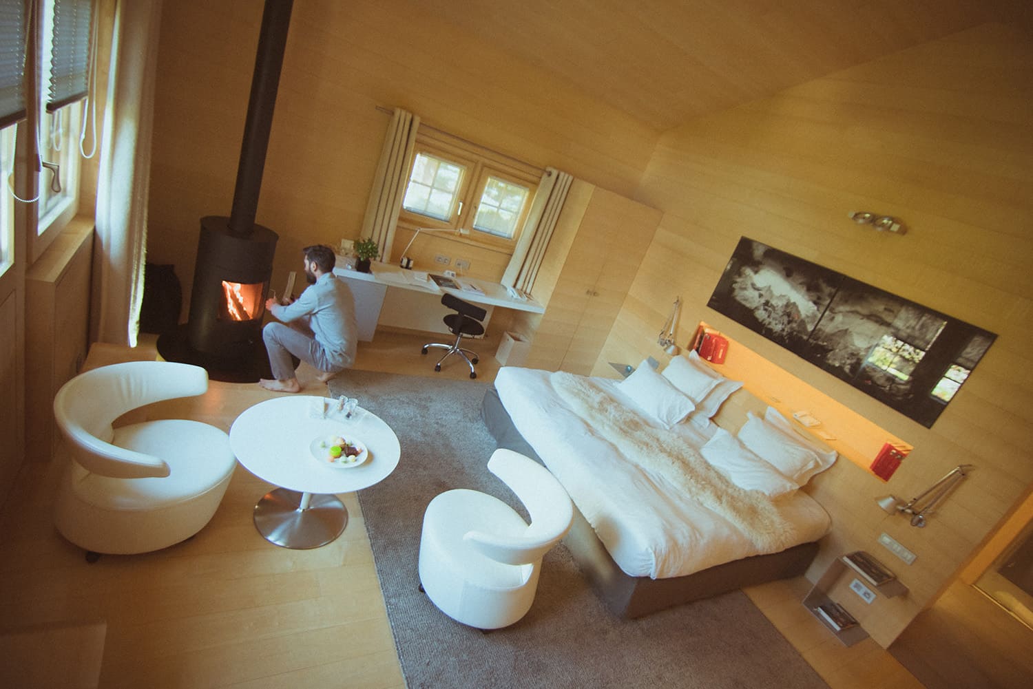 Luxury room with fireplace (40 кв. м). Балкон, спальня, ванная комната с гидромассажной ванной и душем. Дополнительно: кондиционер, камин. Расположен в основном здании. Вид на Монблан.