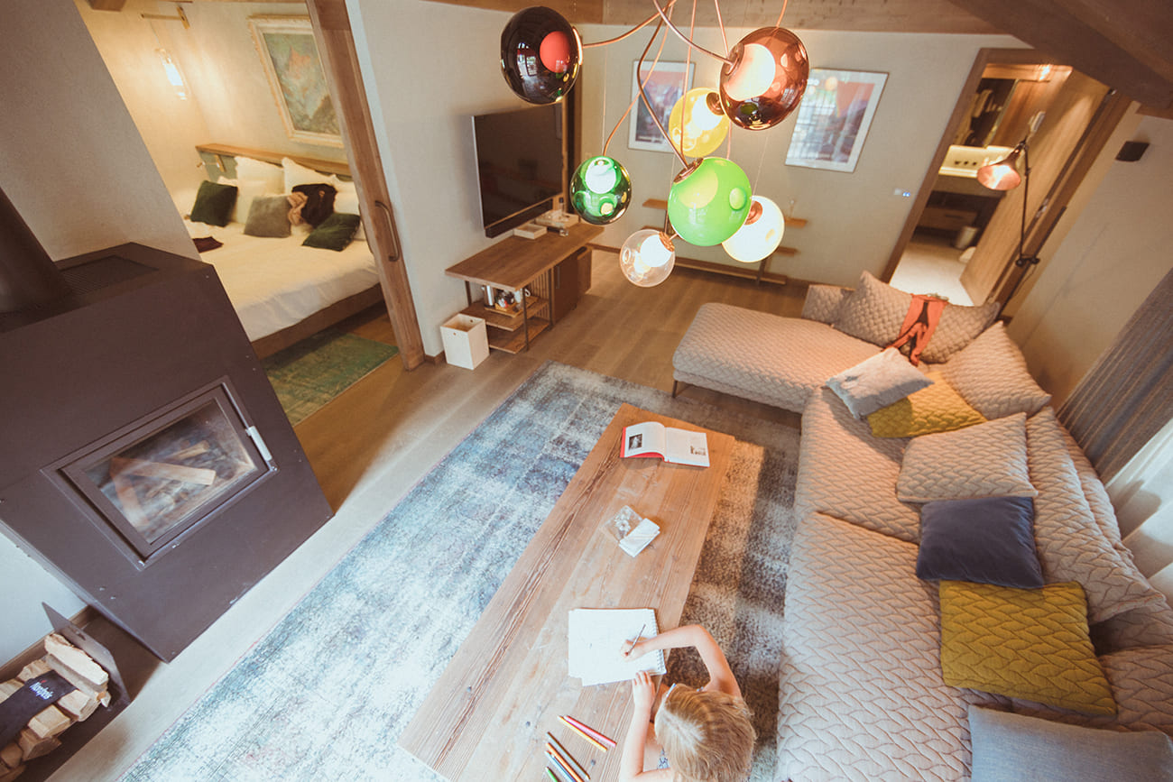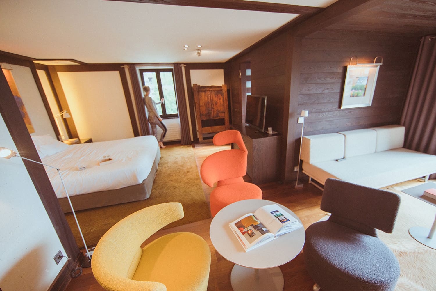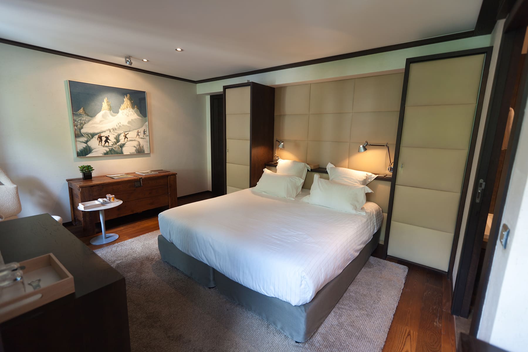Suite Martine (150 кв. м). Двухуровневый номер. 2 балкона, гостиная, 3 спальни (одна – с камином), ванные комнаты (одна - с ванной). Номер имеет открытую планировку: спальная и ванная зоны в главной спальне не разделены. Расположен на 2 этаже над рестораном La Maison Carrier. Вид на Монблан.