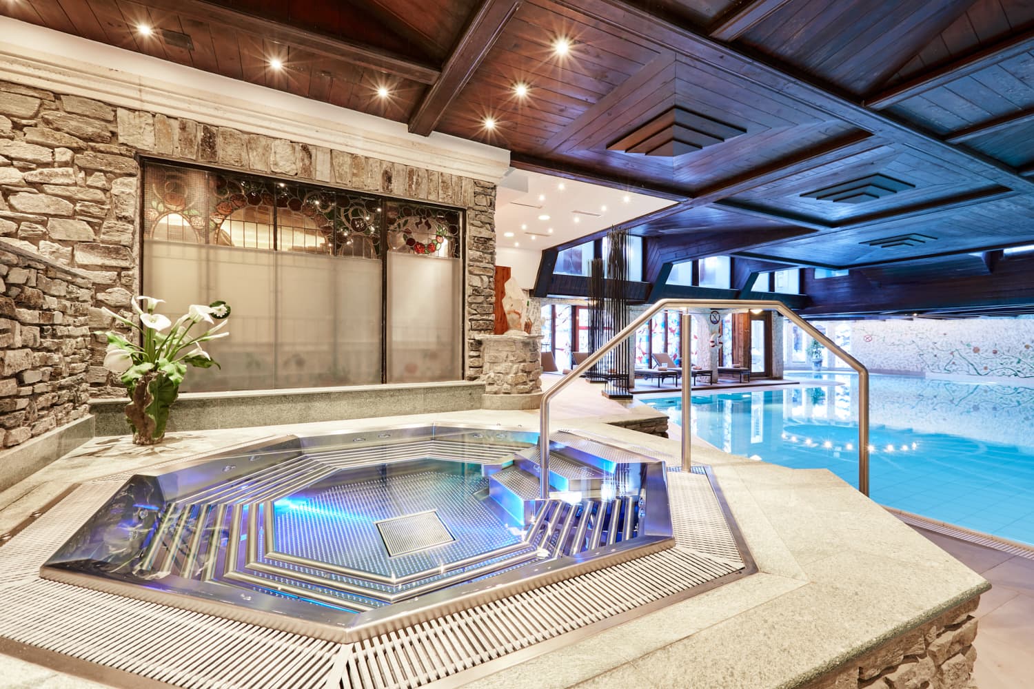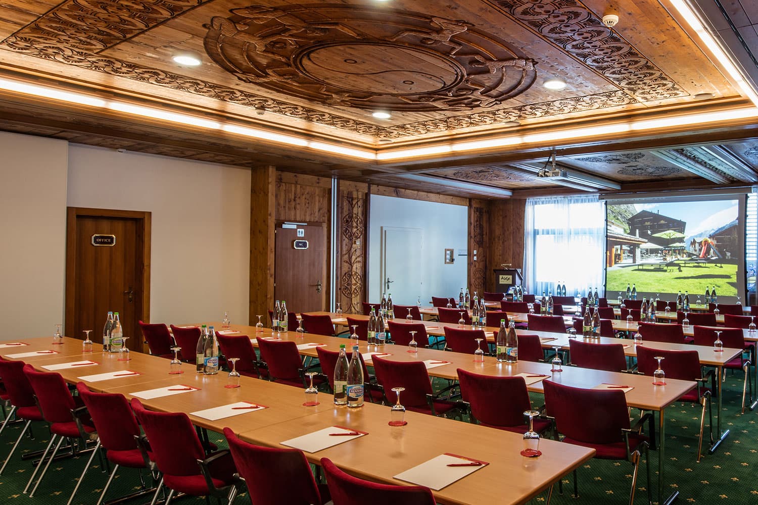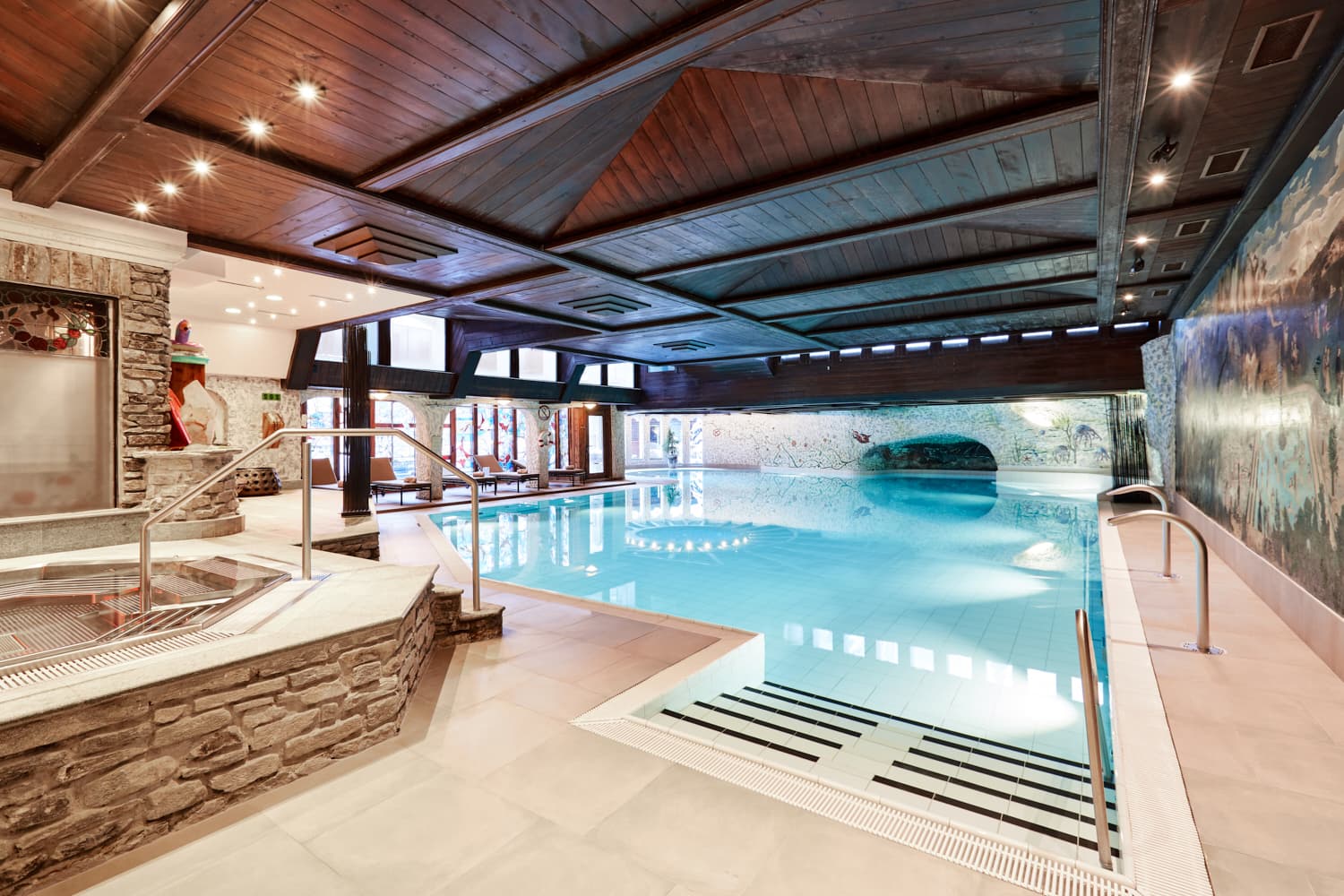 3 ресторана, 2 бара, винный погреб, салон для курения, SPA-центр (закрытый бассейн, три процедурных кабинета, сауна, финская сауна, парная, тепидарий, санариум, тропический душ, джакузи, массаж, процедуры по уходу за лицом и телом – в зимний сезон), тренажерный зал, закрытый теннисный корт, йога, аэробика, бадминтон, сквош, конференц-залы, помещение для хранения лыж.