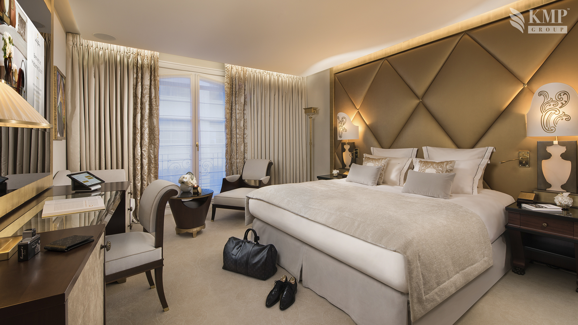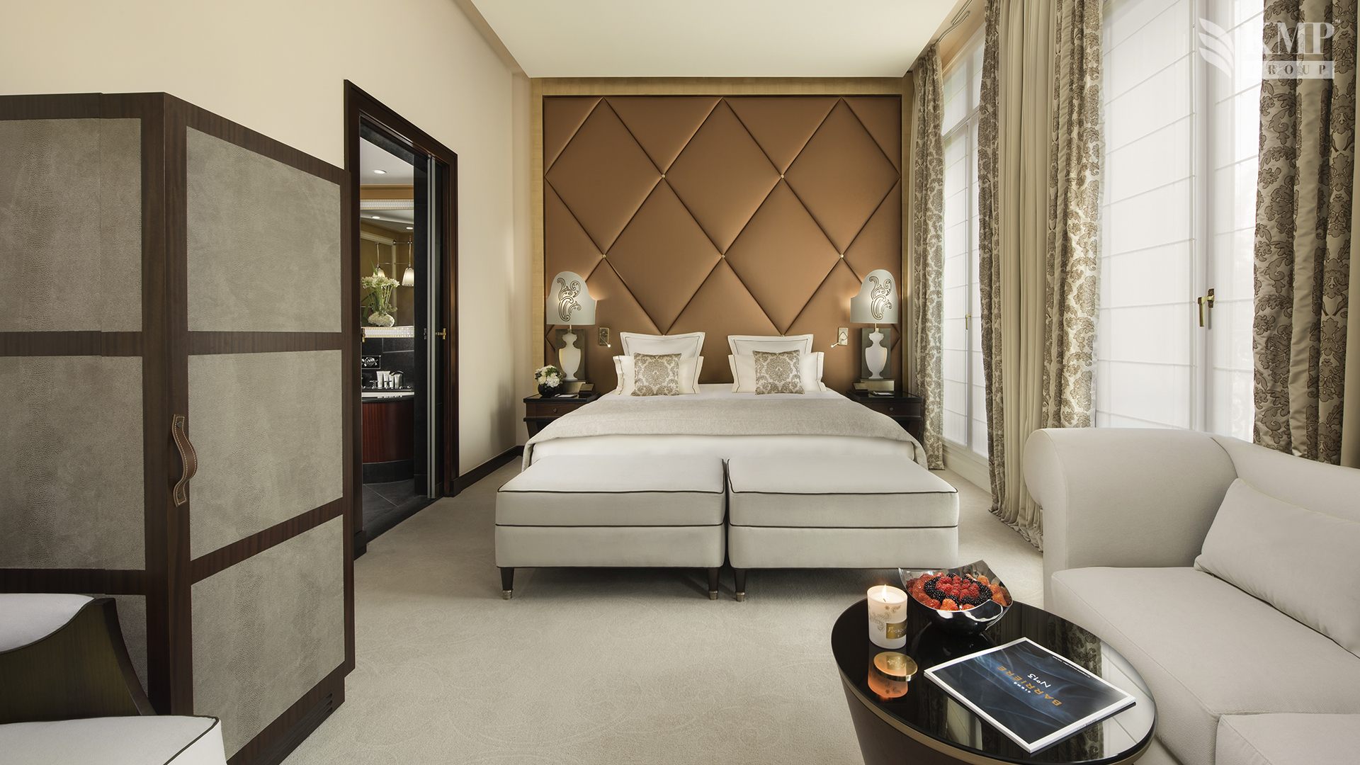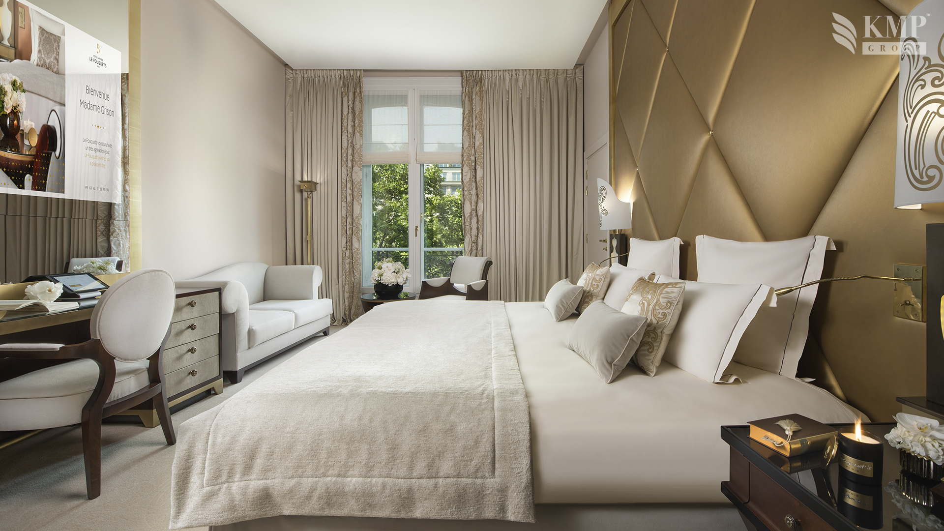 Superior suite (75 кв. м). Гостиная, спальня с кроватью king-size, гардеробная, ванная комната с ванной и душевой кабиной. Расположены на верхних этажах. Вид на улицу Avenue George V.