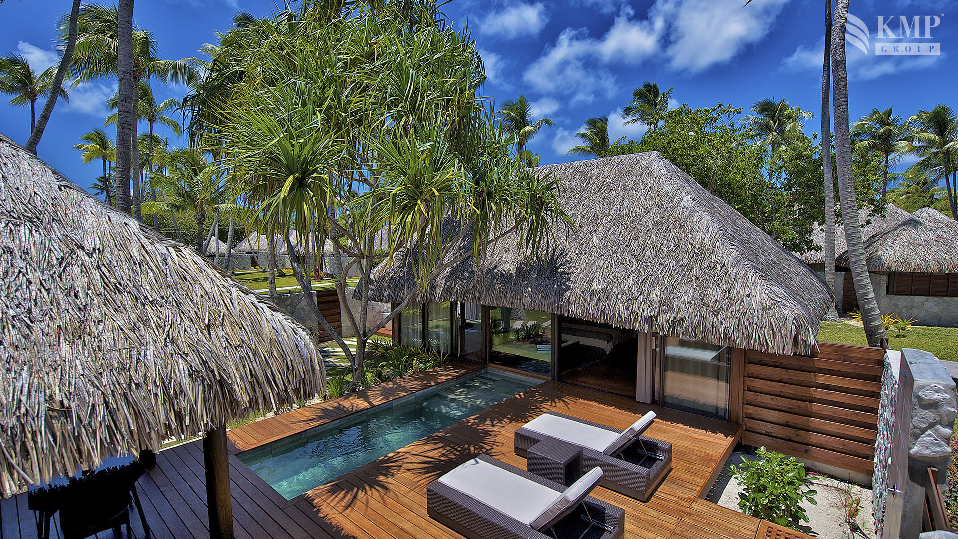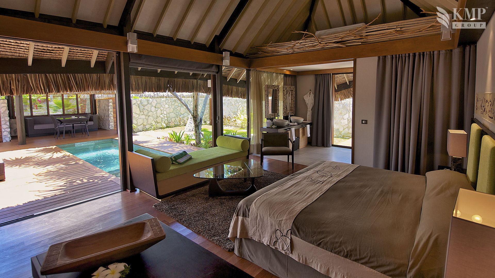 Junior suite with pool (69 кв. м). Частный сад и терраса (общая площадь – 116 кв. м), открытый персональный бассейн, беседка (9 кв. м), гостиная, спальня с кроватью king-size, ванная комната с душевой кабиной, ванна на открытом воздухе. Виллы имеют открытую планировку: спальная и ванная зоны не разделены. Расположены в кокосовой роще.