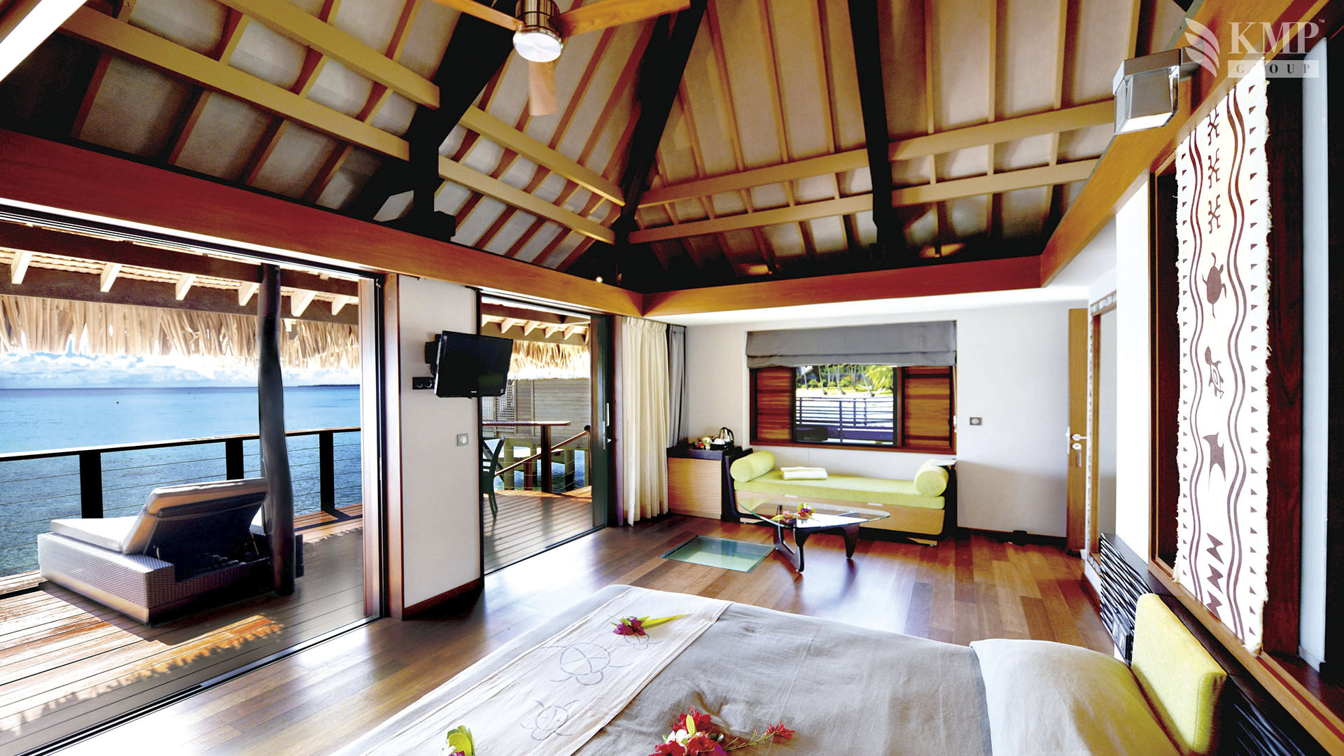 Overwater bungalow (45 кв. м). Терраса (29 кв. м), спальня с гостиной зоной (кровать king-size), ванная комната с ванной и душем. Виллы имеют открытую планировку: спальная и ванная зоны не разделены. Расположены на сваях над водой. Спуск в воду. Вид на море.