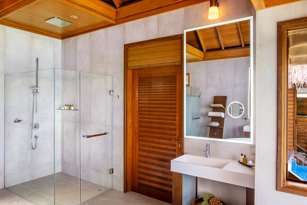 В числе удобств всех просторных бунгало терраса для загара, большой телевизор с плоским экраном и спутниковыми каналами, а также динамик Bluetooth Bang & Olufsen. В собственных ванных комнатах установлен тропический душ и отдельная ванна.
