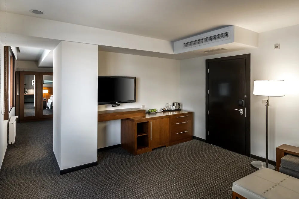 Hyatt Place Yerevan suite. Гостиная с обеденной зоной, спальня с кроватью king-size, ванная комната, гостевой туалет. Расположен на 7 этаже. Вид на соседние улицы.