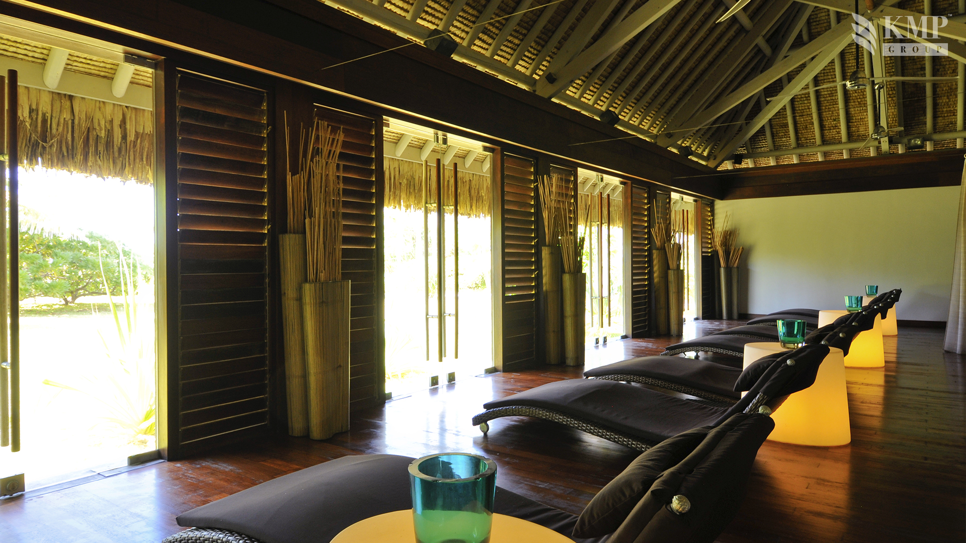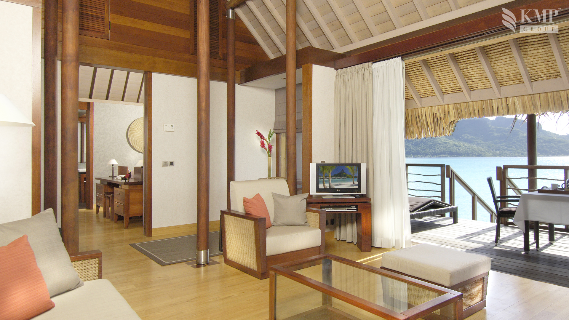 Частные виллы оборудованы кондиционерами и гостиной со стеклянным журнальным столиком. На просторной террасе стоят шезлонги. С нее можно выйти прямо к кристально чистой воде лагуны.