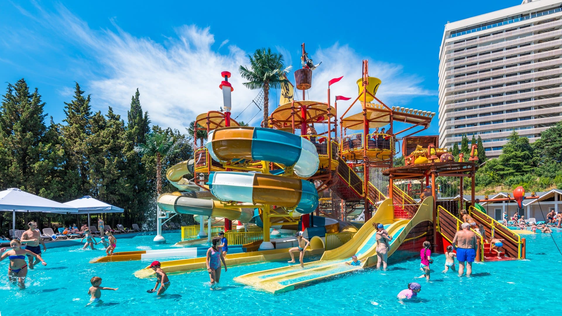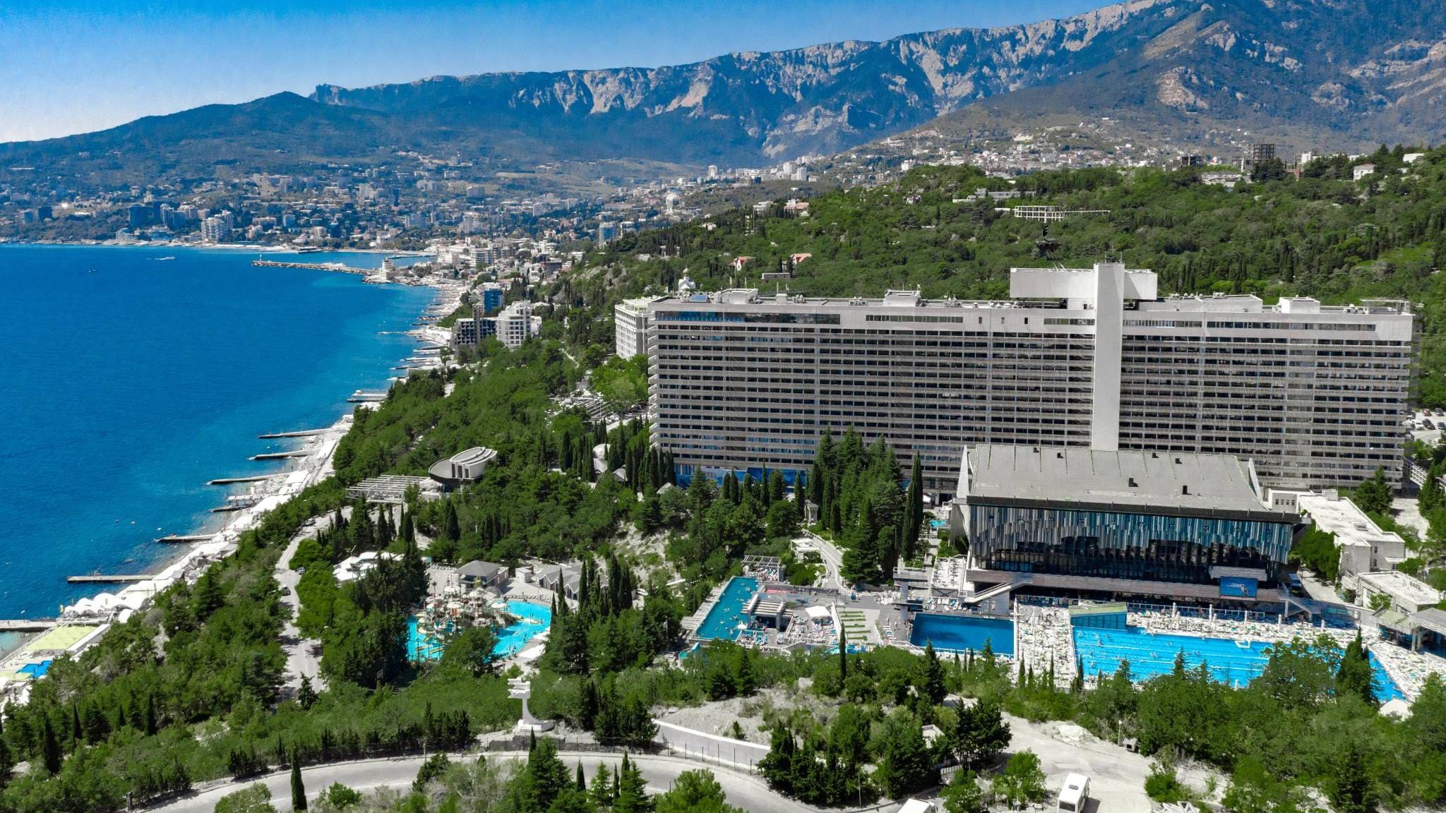 Гостиничный комплекс Интурист расположен в Массандровском парке, на берегу Черного моря. На частный двухуровневый песчаный пляж можно спуститься на лифте. К услугам гостей аквапарк с горками для взрослых и игровым комплексом для детей, большой подогреваемый открытый бассейн с морской водой, пейзажный бассейн с гидромассажной ванной и баром, бассейн с вышками для прыжков в воду, 2 бассейна для детей, оздоровительный центр, сауны, русские паровые бани и фитнес-центр на 16 этаже, а также открытые спортивные площадки.