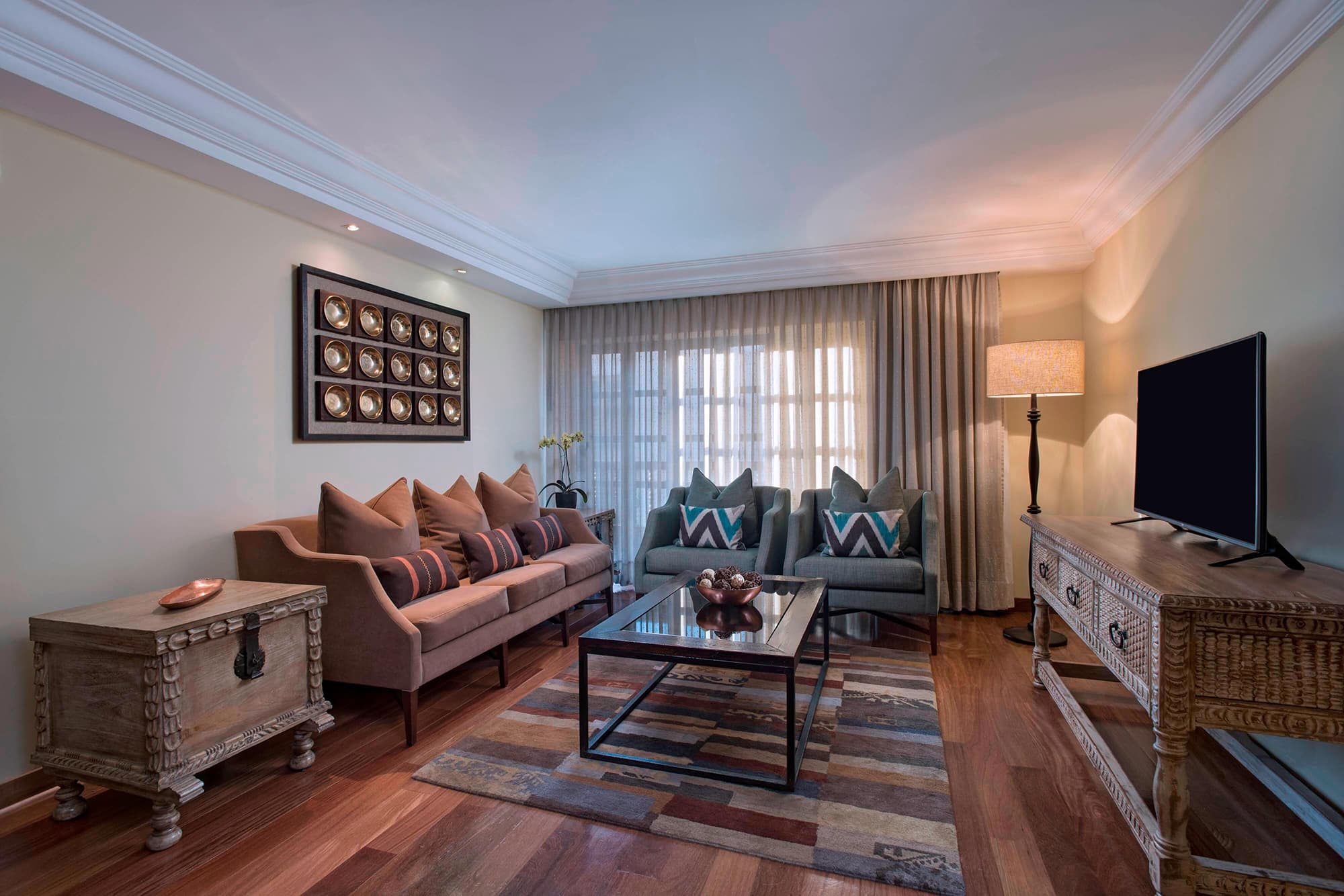 Изысканные номера отеля JW Marriott El Convento Cusco обставлены мебелью из темного дерева и мягкими креслами.