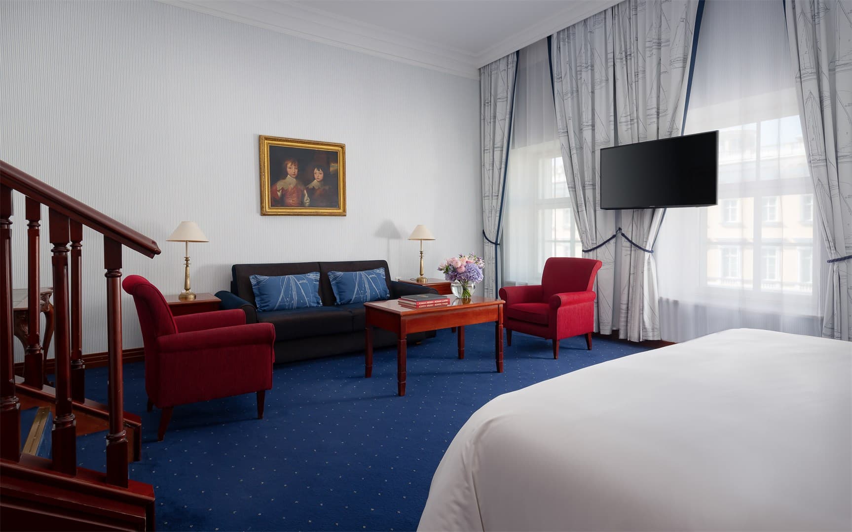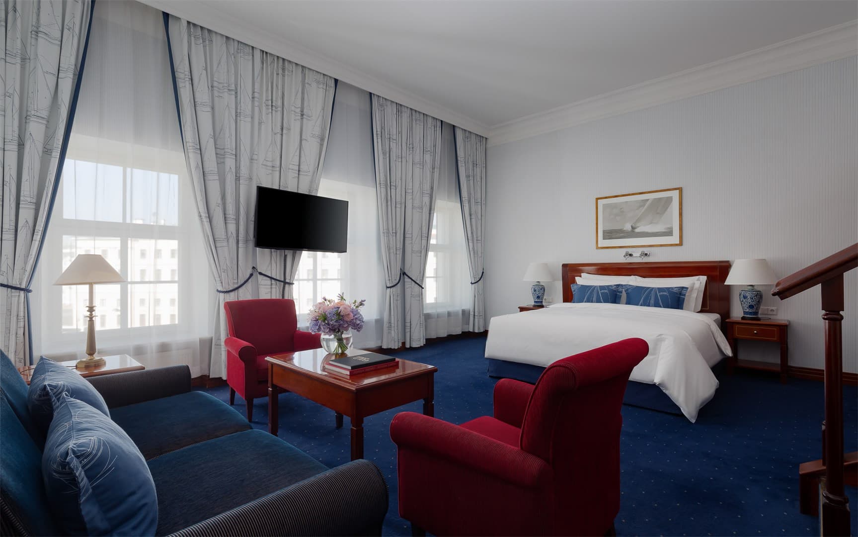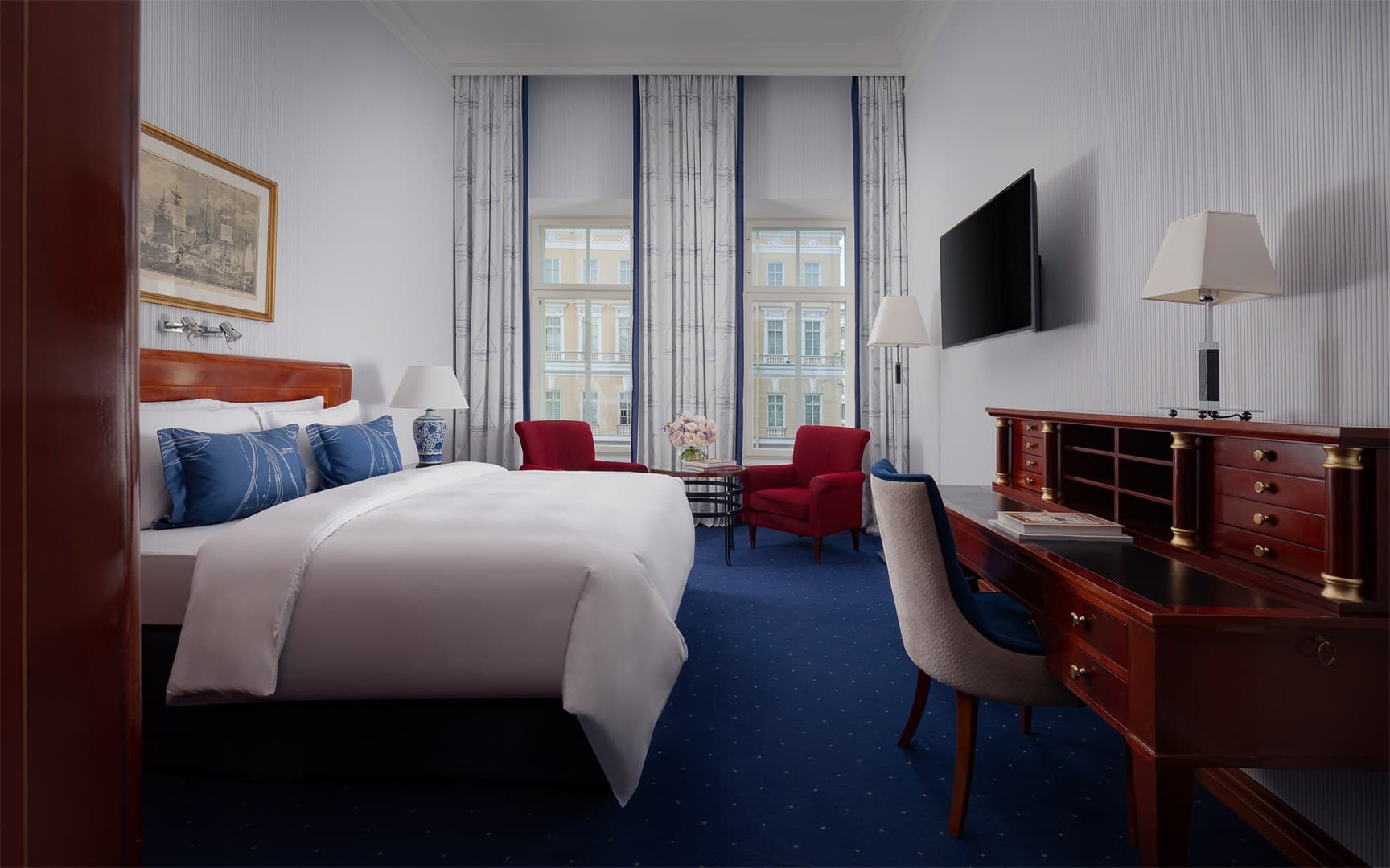 Executive suite (Представительский люкс) (65-75 кв. м): балкон (в некоторых номерах), гостиная, спальня с двуспальной или двумя отдельными кроватями, ванная комната с ванной и душевой кабиной. Вид на реку, Дворцовую площадь, Эрмитаж или внутренний двор. Возможно объединение номеров.