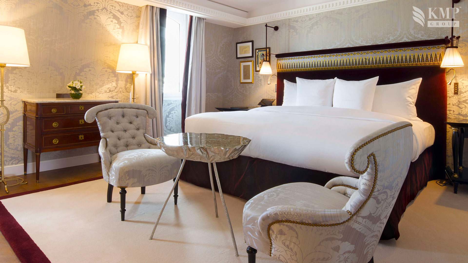 Elysee suite (170 кв. м). Балкон, гостиная, 2 спальни, 2 гардеробные, 2 ванные комнаты (каждая – с ванной и душем). Дополнительно: винный погреб, рояль. Расположен на 5 (верхнем) этаже. Панорамный вид на Елийские поля, Эйфилеву башню и город.