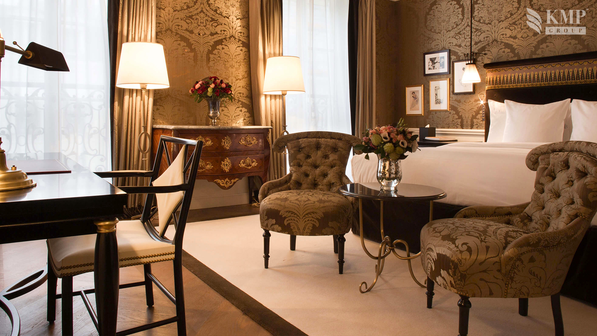 Prestige junior suite (52 кв. м). Спальня с гостиной зоной, ванная комната с ванной и душем. Вид на Елисейские поля, Эйфелеву башню и Большой дворец. Возможно объединение с номером категории Presidential suite.