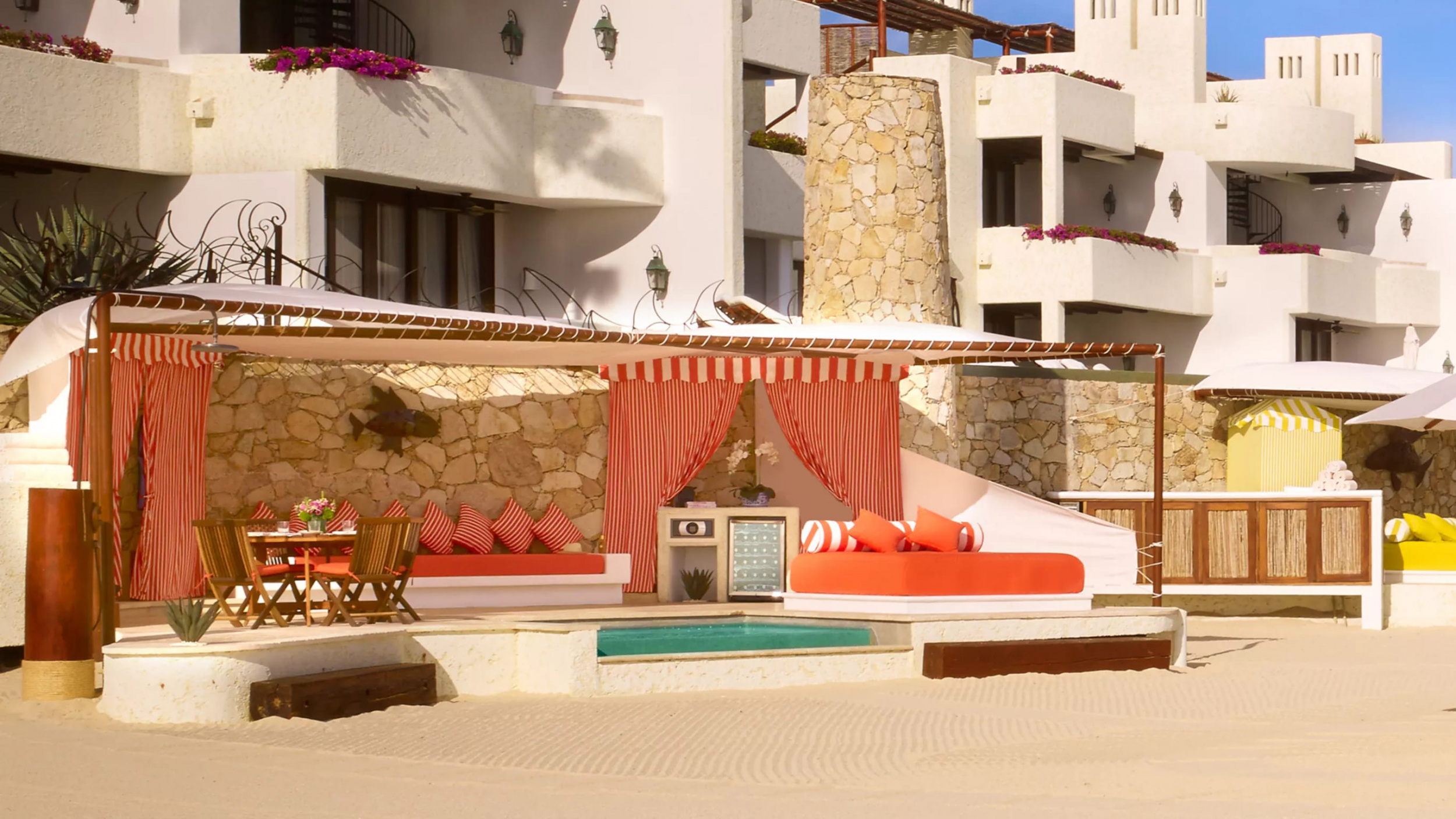 One bedroom beachfront luxury villa with wellness room (529 кв. м): внутренний дворик, 2 террасы, открытый персональный бассейн и джакузи на открытом воздухе, гостиная с обеденной и кухонной зонами (стол на 4 персоны), спальня с кроватью king-size, комната с тренажерами, гардеробная, 2 ванные комнаты (одна – с ванной и душем, вторая – с душевой кабиной), душ на открытом воздухе, гостевой туалет. Расположена рядом с пляжем. Выход на пляж. Гости данной виллы имеют особые привилегии. Услуги персонального камердинера.