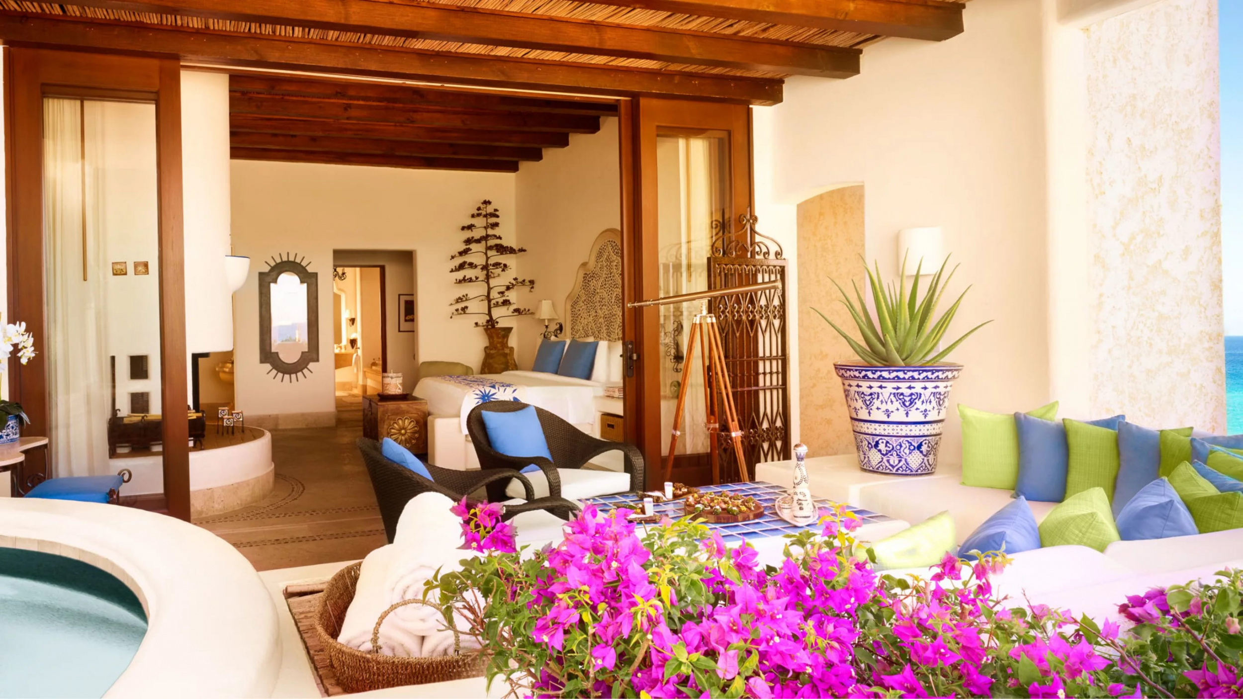 Oceanfront rooftop terrace junior suite (130 кв. м): двухуровневый номер. На первом уровне: терраса с двумя открытыми персональными бассейнами, спальня с кроватью king-size, ванная комната с ванной и душевой кабиной. На втором уровне: терраса. Дополнительно: камин. Расположены рядом с пляжем. Вид на океан. Возможно размещение гостей старше 16 лет.