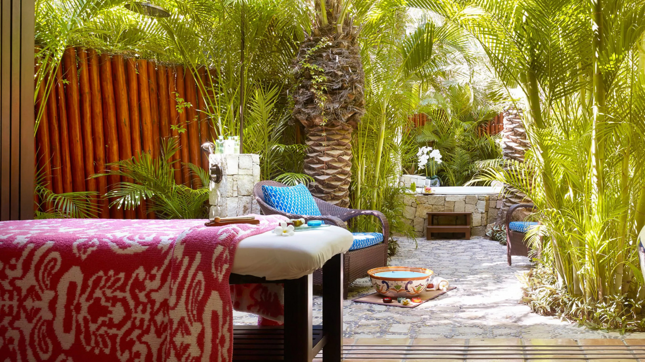 Three bedroom oceanview suite (362 кв. м): 2 патио (одно – с джакузи на открытом воздухе), гостиная, обеденная зона, кухня, винный погреб, 3 спальни (две – с кроватью king-size, одна – с двумя двуспальными кроватями), 3 ванные комнаты. Расположены на первом этаже. Вид на океан и сады. Услуги персонального камердинера.