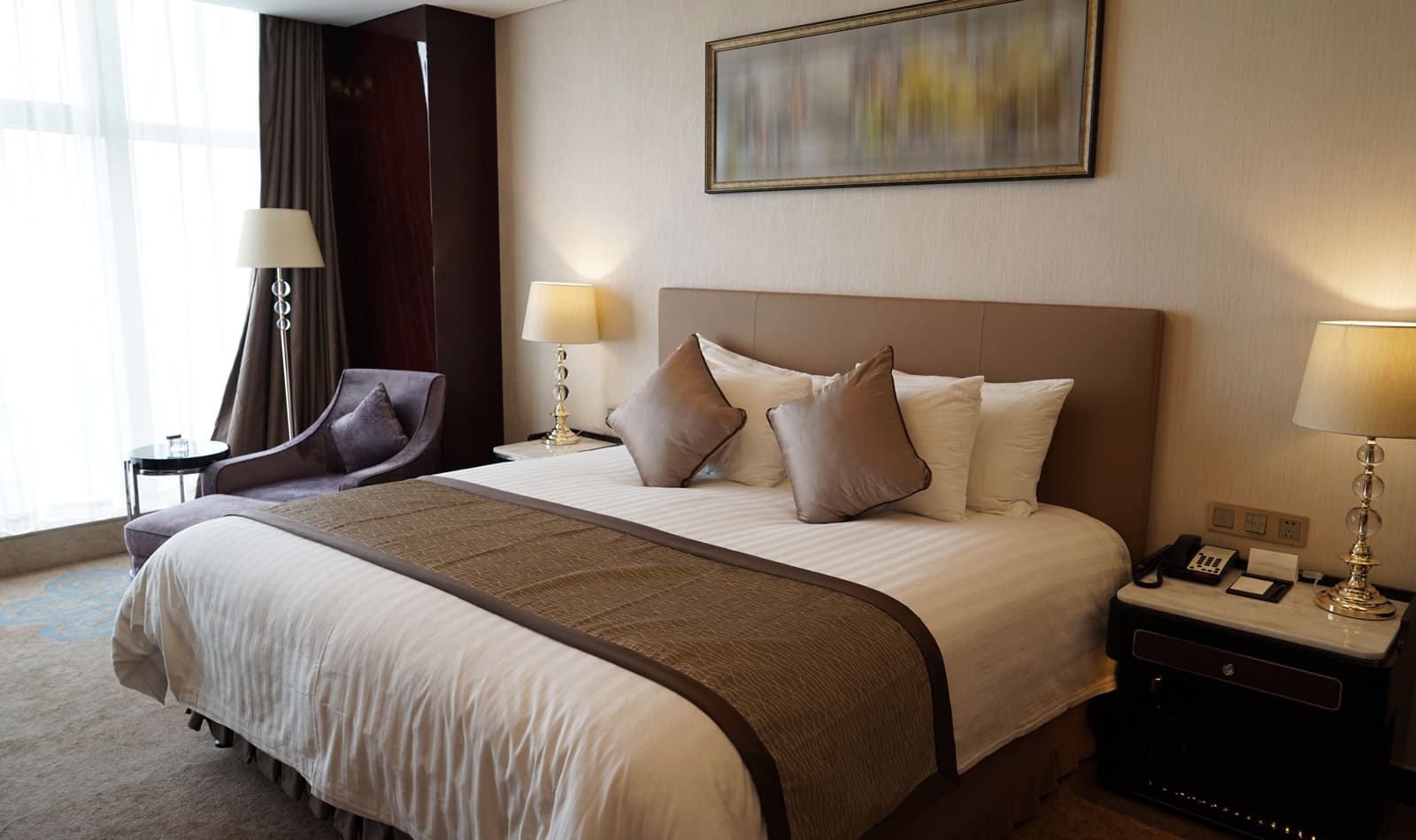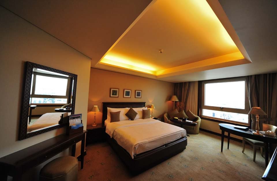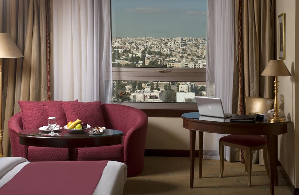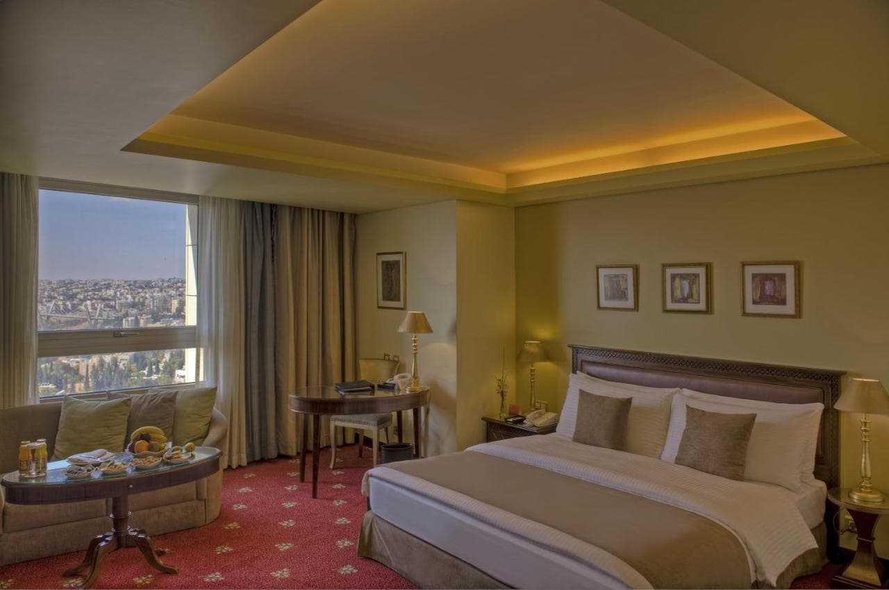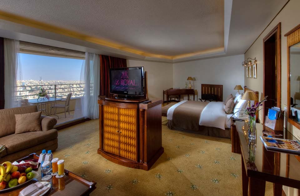 Роскошный Le Royal Hotel Amman расположен в центре иорданской столицы и представляет собой самое высокое сооружение Аммана – 31-этажную башню с захватывающим видом на город. Рядом расположен торговый центр, принадлежащий Le Royal Hotel Amman, на трех этажах которого находятся бутики, сувенирные магазинчики и три кинотеатра. В отеле 281 номер, оборудованный по последнему слову техники. Элегантные интерьеры выдержаны в теплых тонах и оформлены в классическом стиле. Пол выложен гранитной плиткой, в отделке комнат использовано натуральное дерево. Номера декорированы дорогими коврами, тканями и изысканными аксессуарами. Гостям номеров категории suite преподносят в подарок угощение – экзотические фрукты и традиционные восточные сладости.