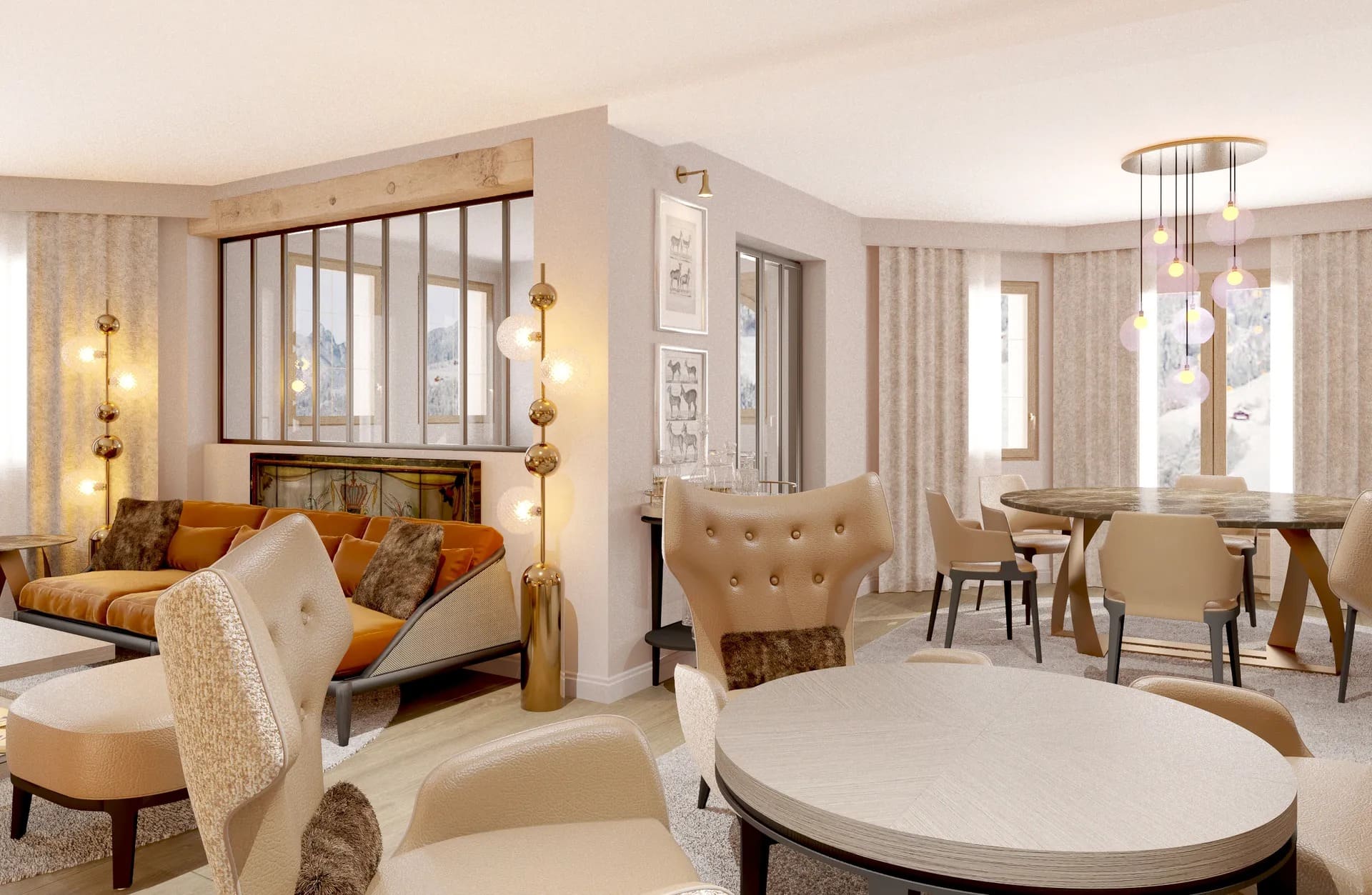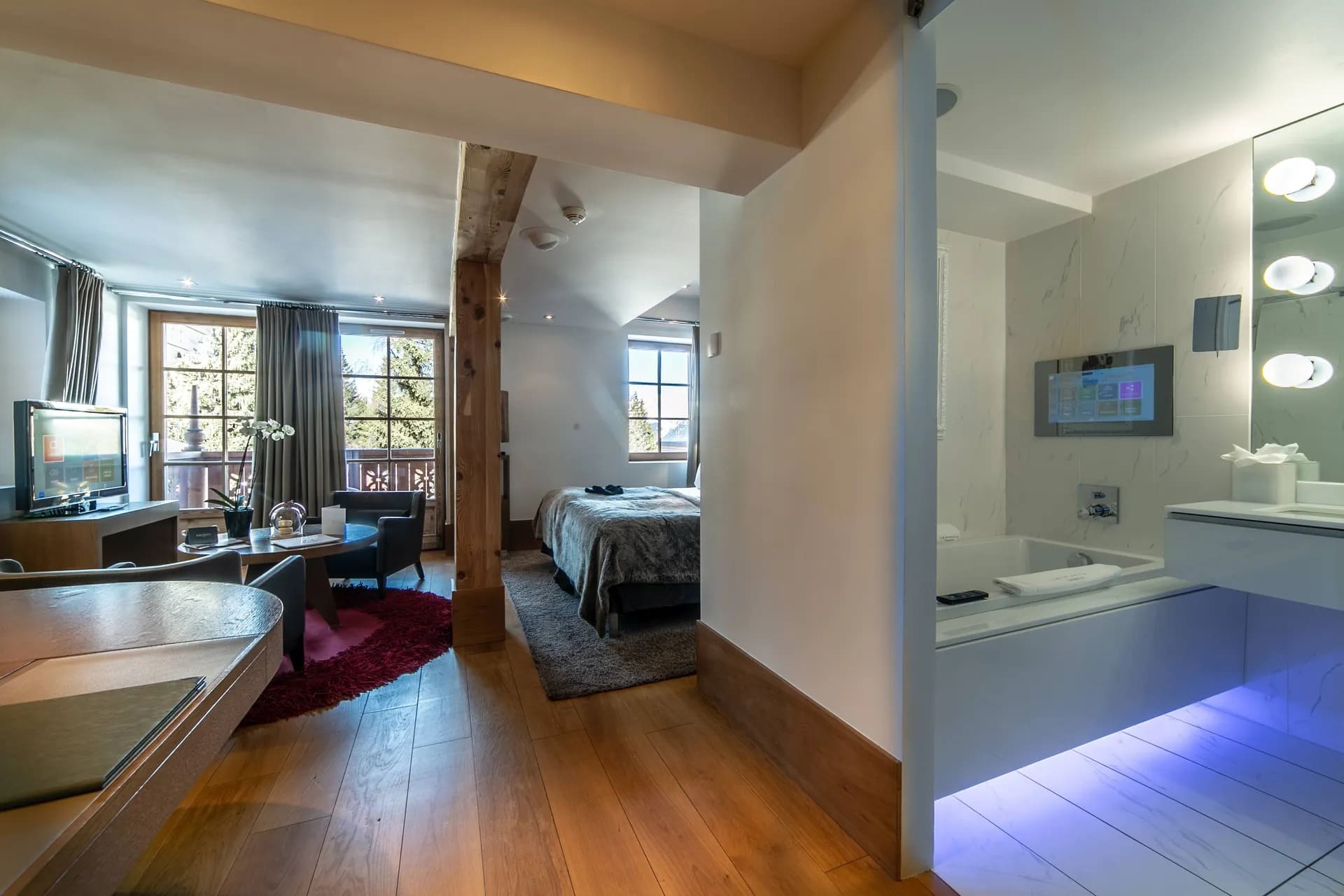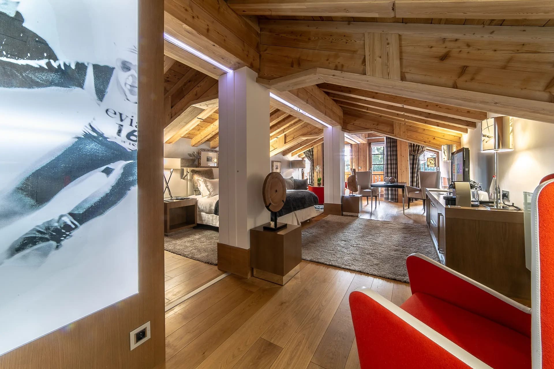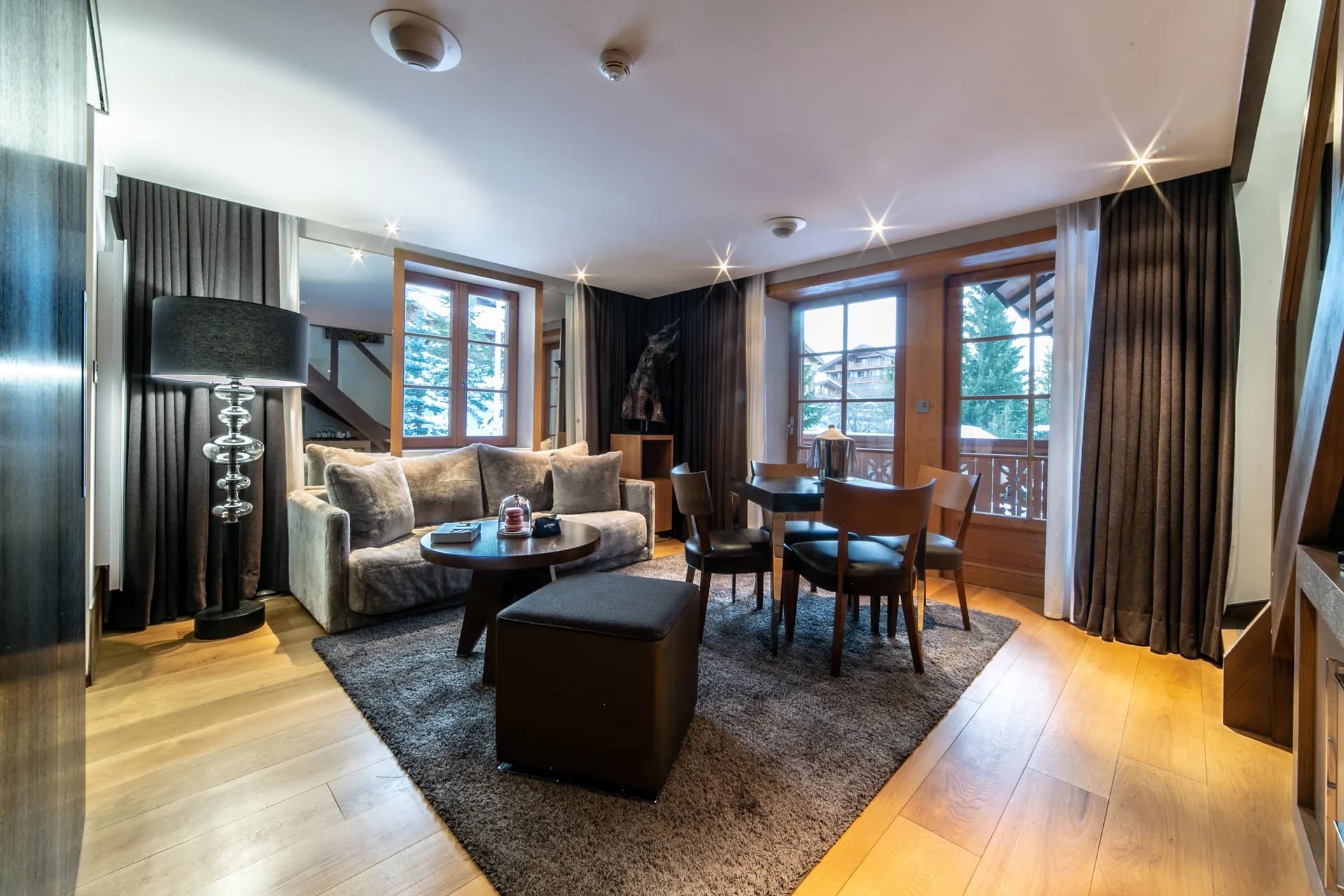 Chalet "Le Timeless" (140 кв. м). Трехэтажное шале. 2 балкона, терраса, гостиная с кухонной зоной, 2 спальни, 2 ванные комнаты (каждая с ванной и душем). Дополнительно: камин. Вид на горнолыжные склоны и горы. Шале расположено на территории отеля на юго-западной стороне.