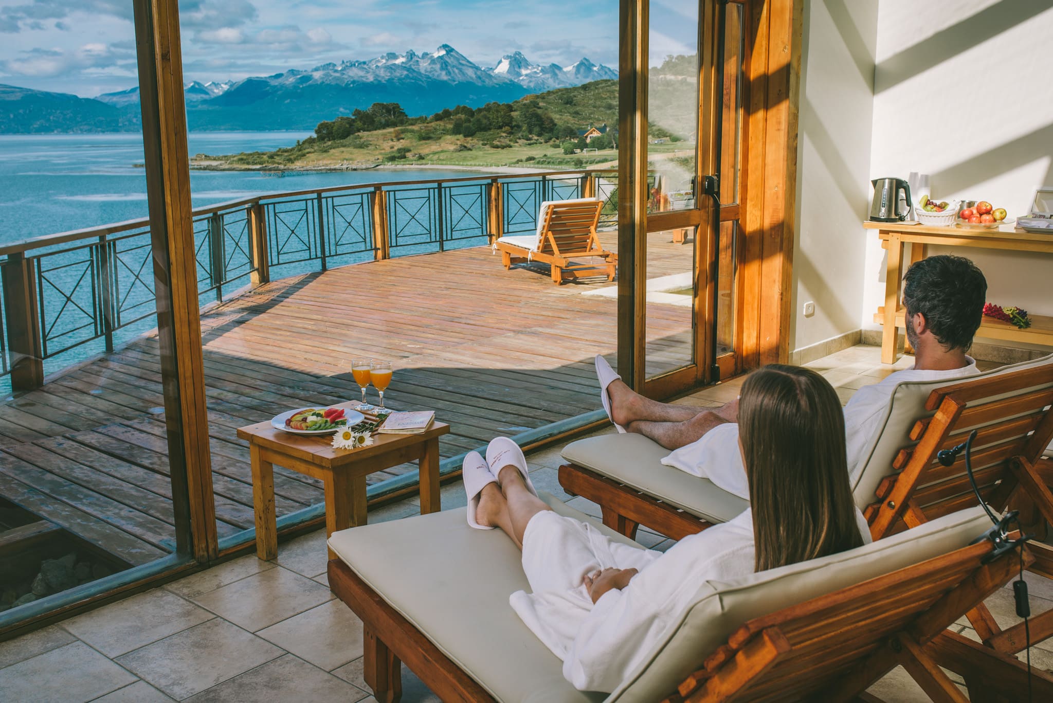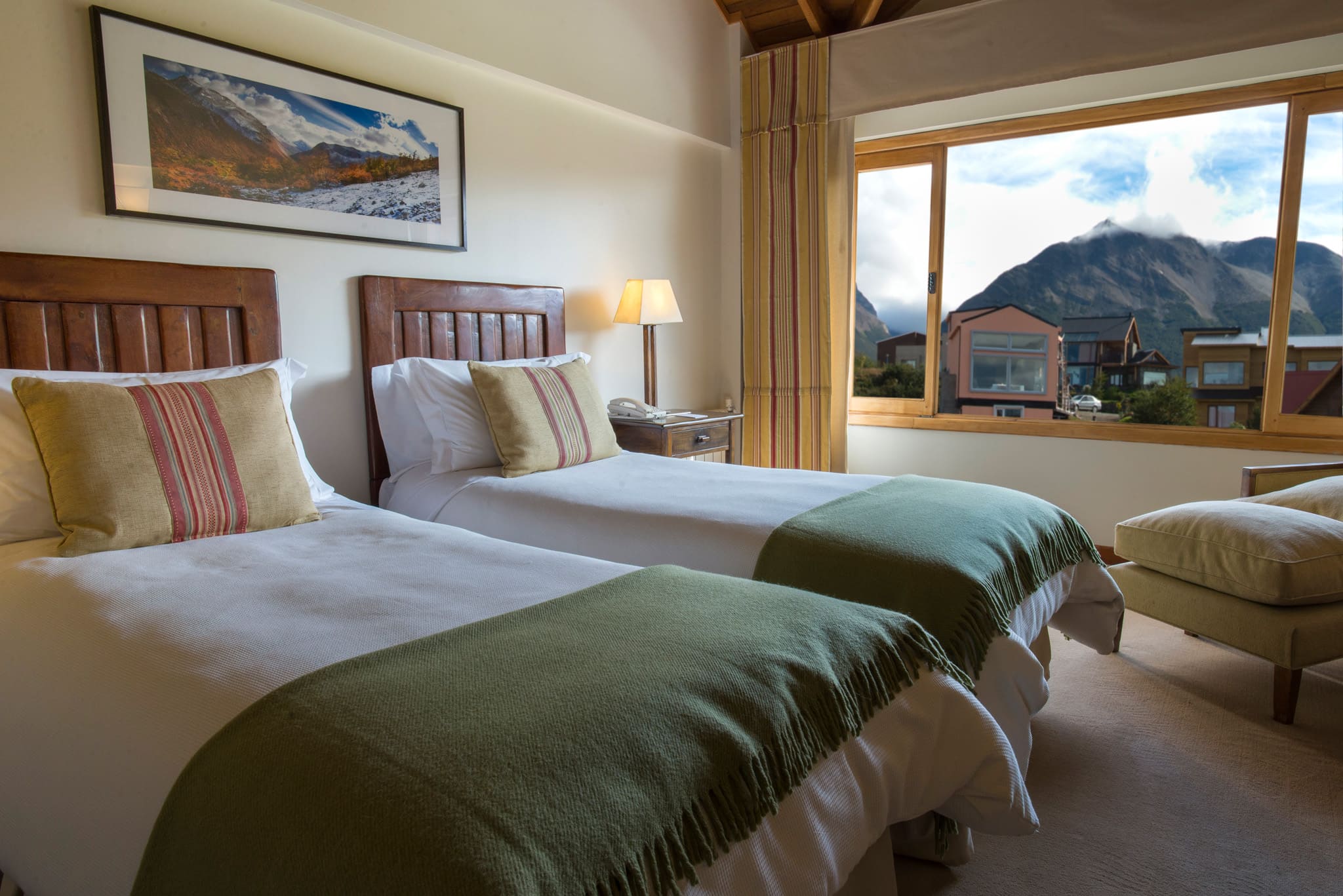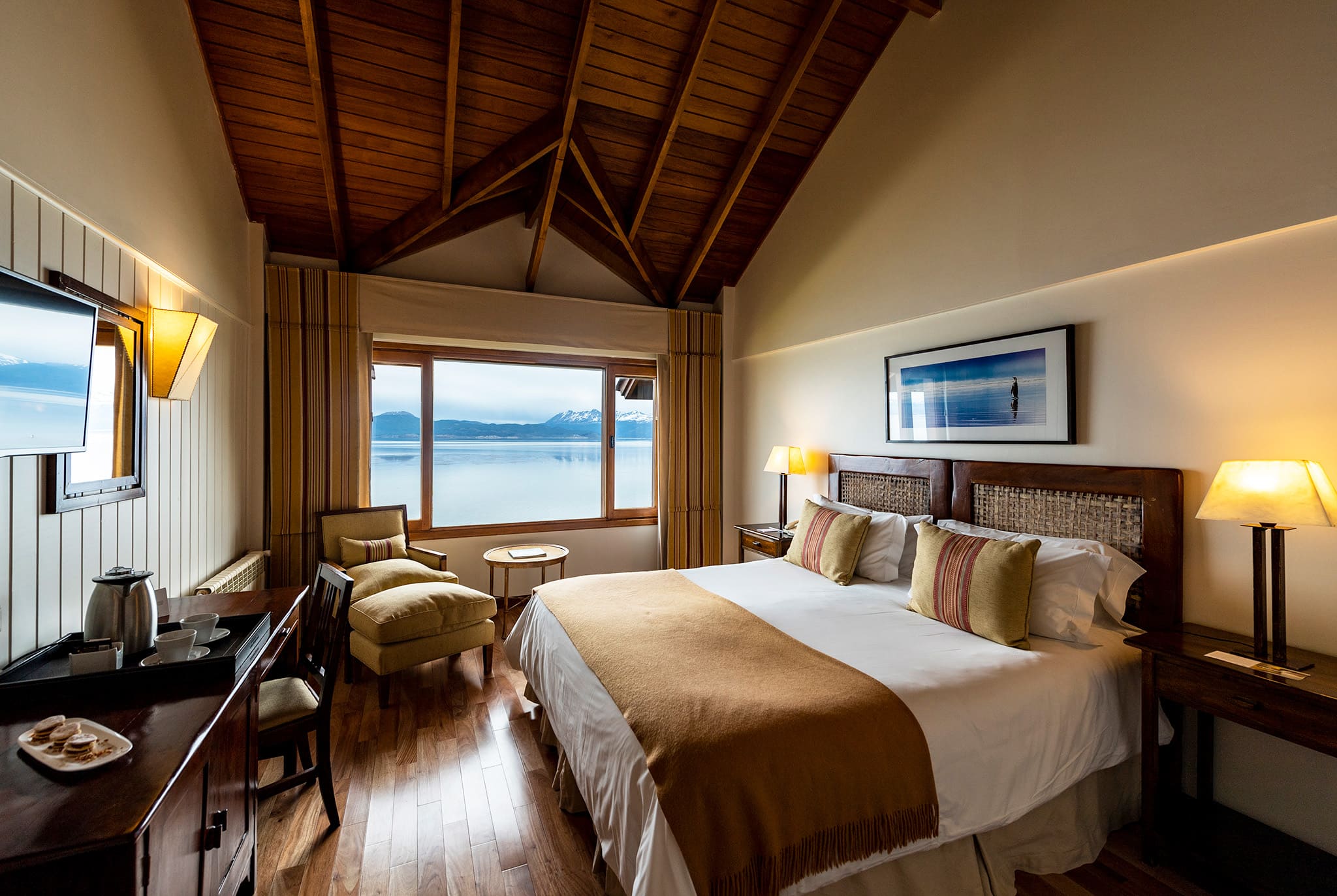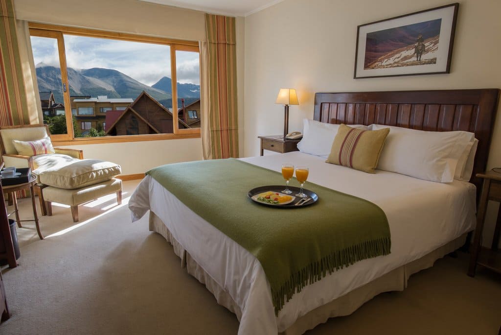 Standard room (26 кв. м). Спальня с кроватью king-size или двумя отдельными кроватями, ванная комната. Вид на горы или на пролив Бигля.