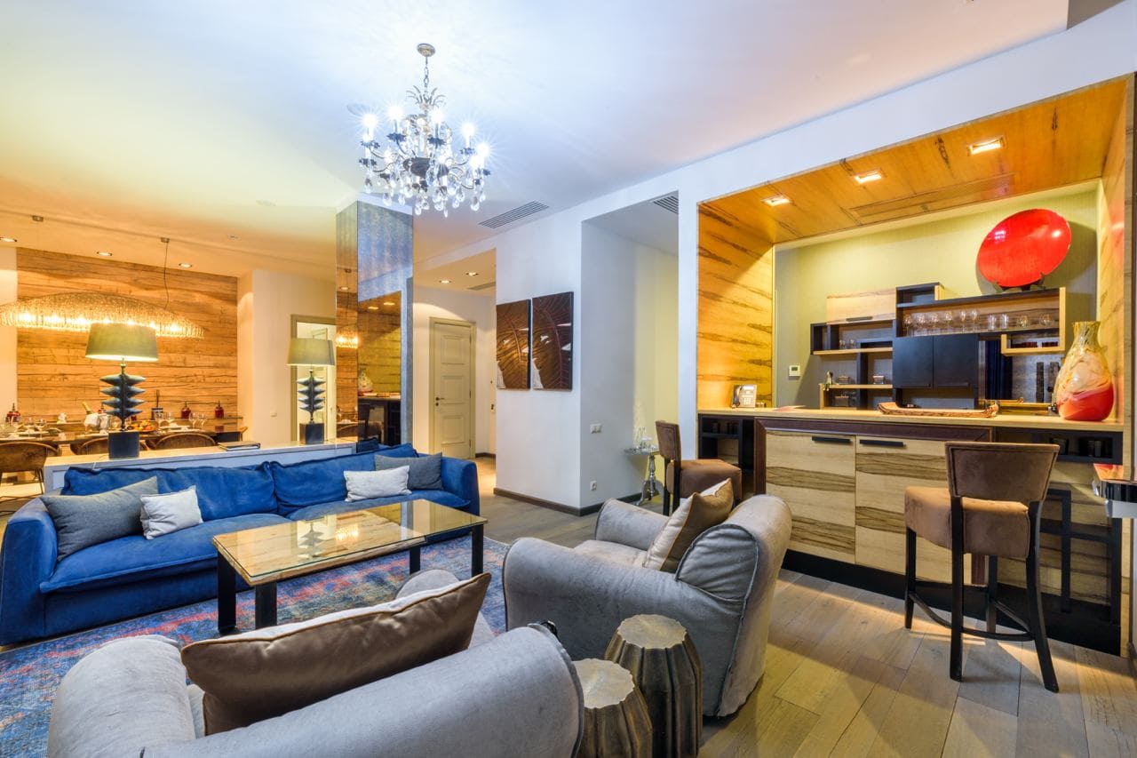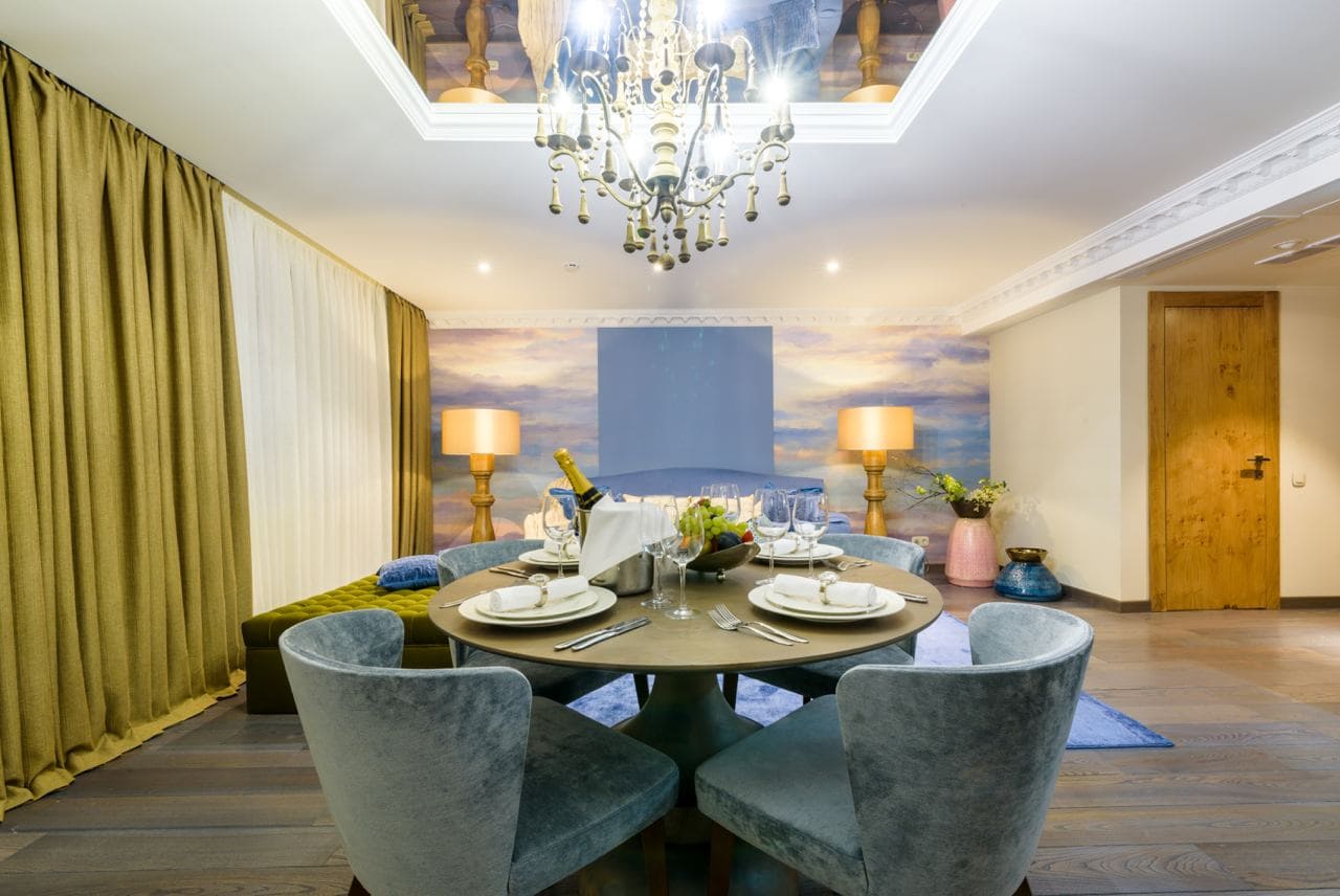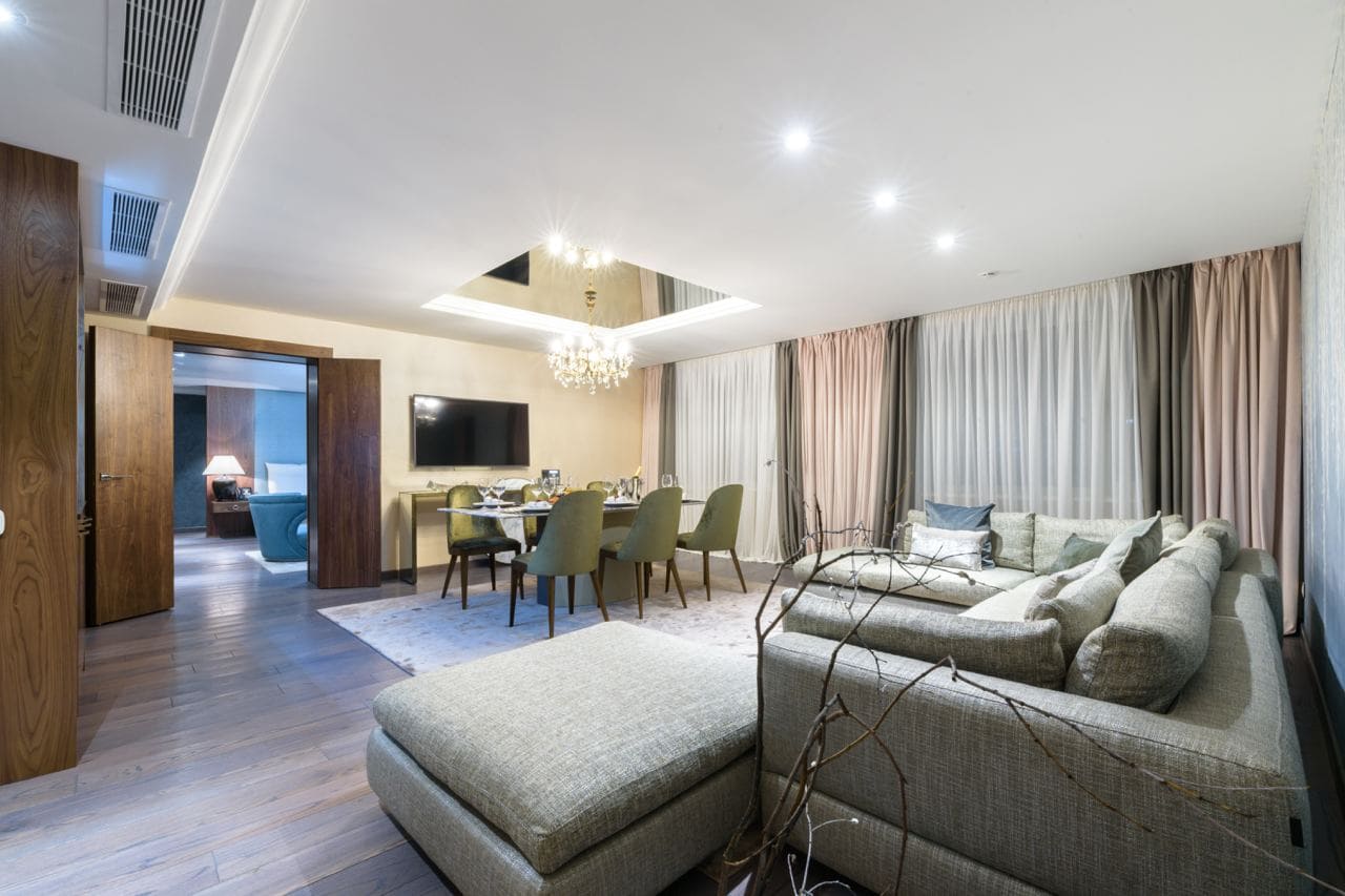 Presidential luxe (Президентский люкс) (150 кв. м): гостиная с обеденной зоной, спальня, ванная комната с ванной.