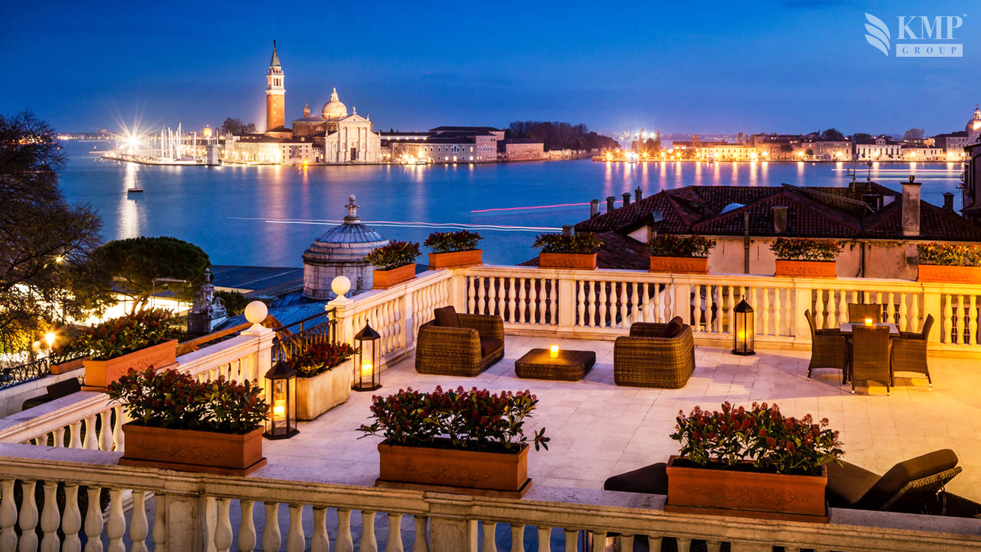 Grand lagoon suite Sansovino (60 кв. м). Терраса, гостиная, спальня с кроватью king-size, гардеробная, ванная комната с джакузи, ванной и душем. Вид на залив Сан-Марко и остров Сан-Джиорджио.