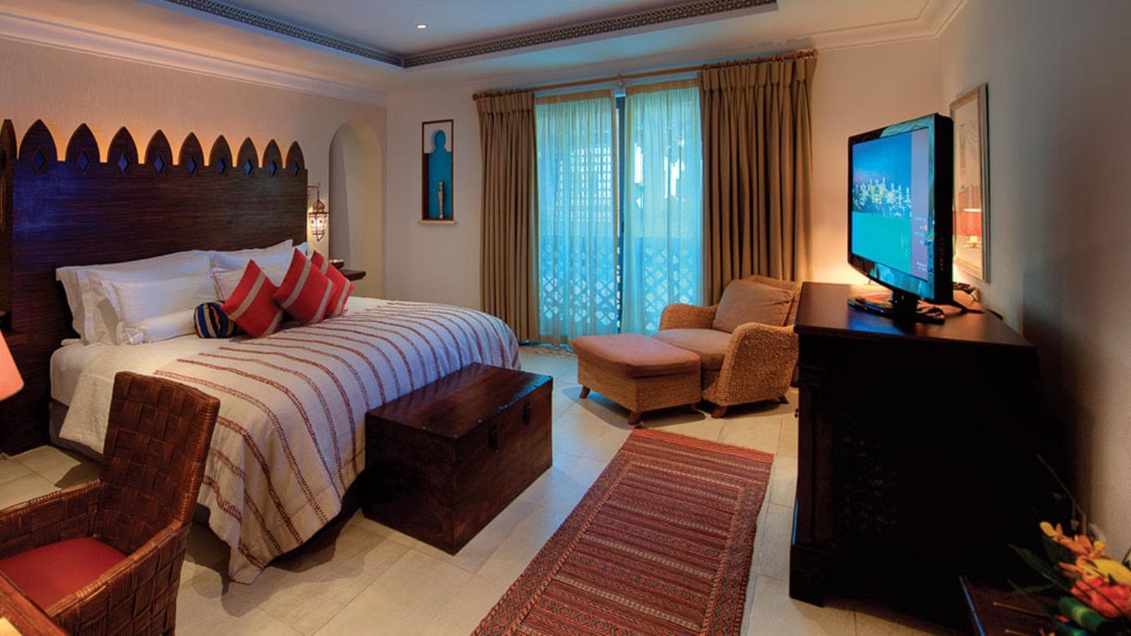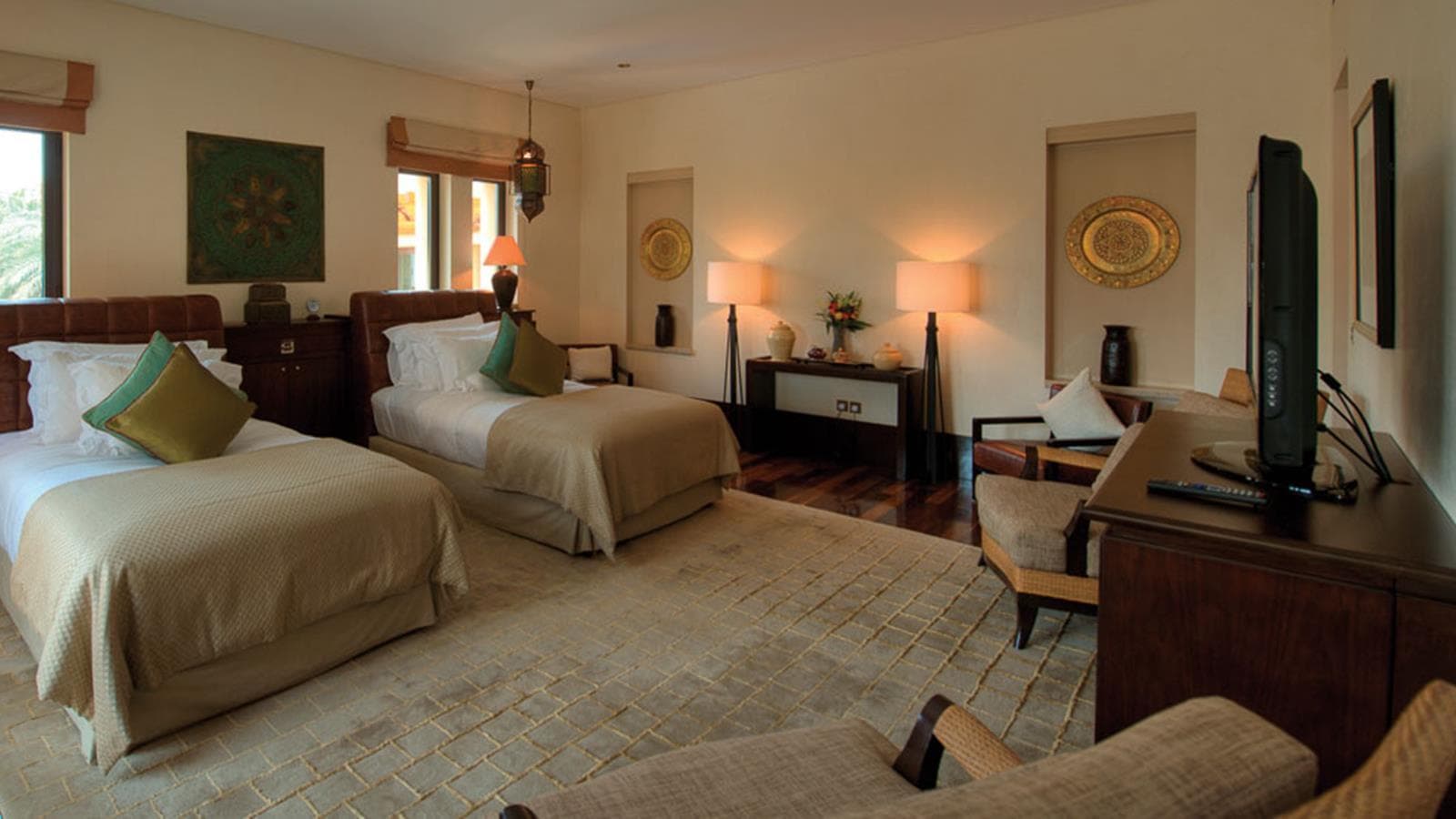 Malakiya villa 3-bedroom (370-531 кв.м): терраса с открытым персональным бассейном, балконы, гостиная с обеденной зоной, кухня, 3 спальни (две – с кроватью king-size, одна - с двумя отдельными кроватями), комната для прислуги, 3 ванные комнаты (каждая – с джакузи), гостевой туалет. Вид на сады, водоемы и территорию курорта. Гости данных номеров имеют особые привилегии.