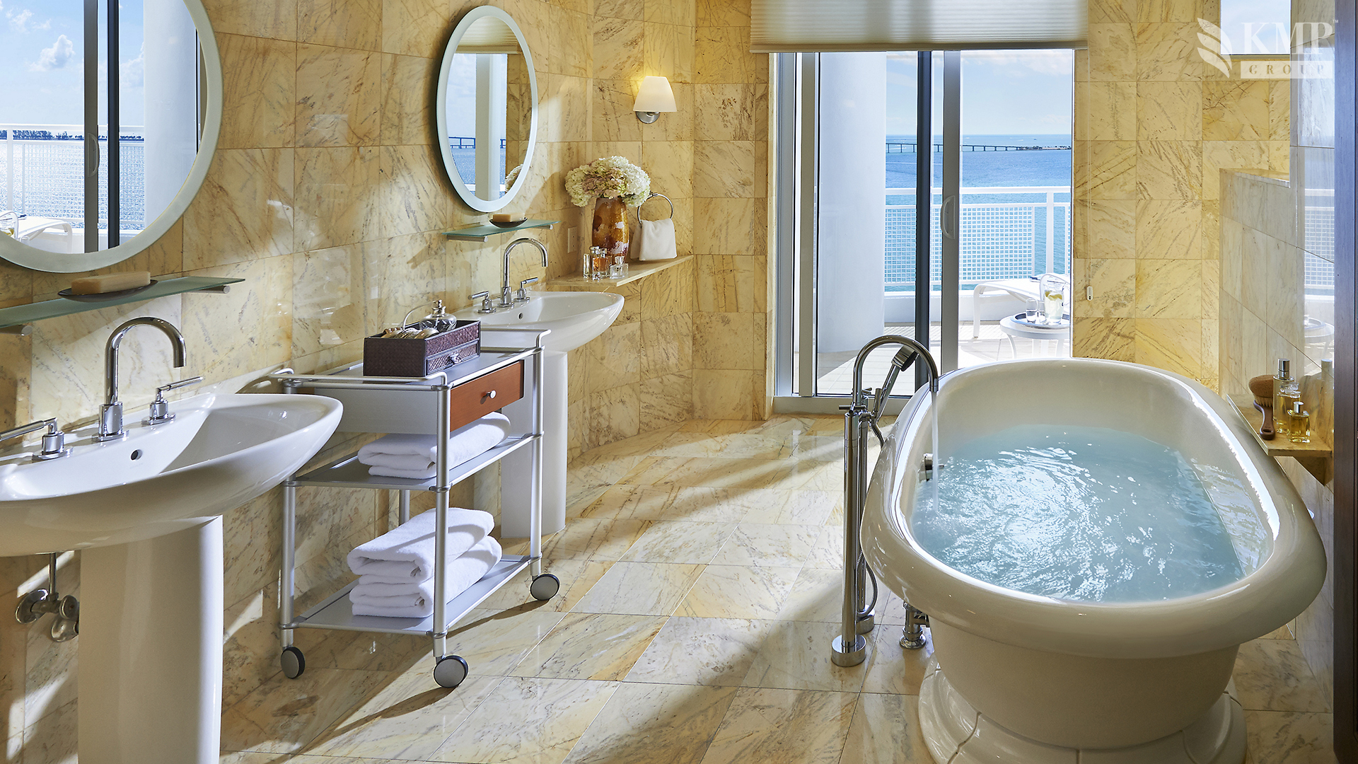 Biscayne suite (98 кв м): балкон, гостиная, спальня с кроватью king-size, ванная комната с ванной и душевой кабиной, гостевой туалет. Дополнительно: кофемашина. Расположены с шестого по шестнадцатый этаж. Вид на залив и город.