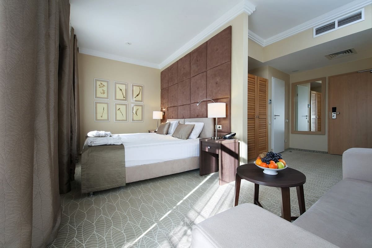 Suite (72 кв. м).Двухкомнатный номер «Люкс» с балконом и просторной гостиной, спальней и прихожей. Санузел оборудован ванной. Гости, проживающие в номере Suite, могут бесплатно и безлимитно посещать СПА-комплекс «Итальянские термы».
