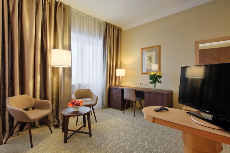 Studio (31 кв. м). Этот просторный светлый номер включает сразу две зоны. Изысканный интерьер выполнен в лучших традициях. Удобная мебель из натурального массива дуба, wi-fi и цифровое ТВ вместе с чудесным видом из окна подарят Вам комфортный отдых и снимут напряжение после длительных переговоров. На выбор гостя предоставляются номера с двумя кроватями (1х2м) или одной большой кроватью (2х2м). При проживании от трех дней — в подарок бесплатное разовое посещение spa-комплекса «Итальянские термы».