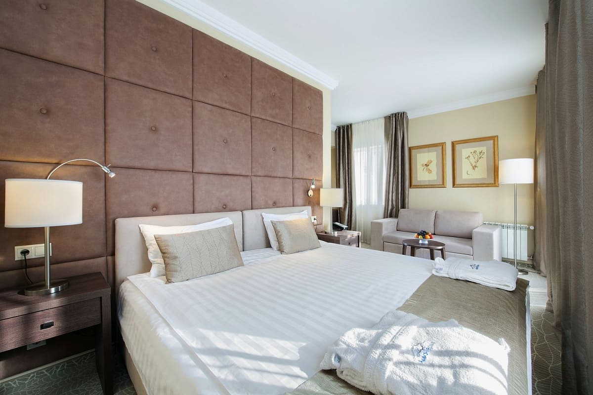 Junior Suite (35 кв. м). Просторный двухместный номер с балконом и ванной комнатой. При проживании от трех дней — в подарок бесплатное разовое посещение spa-комплекса «Итальянские термы».