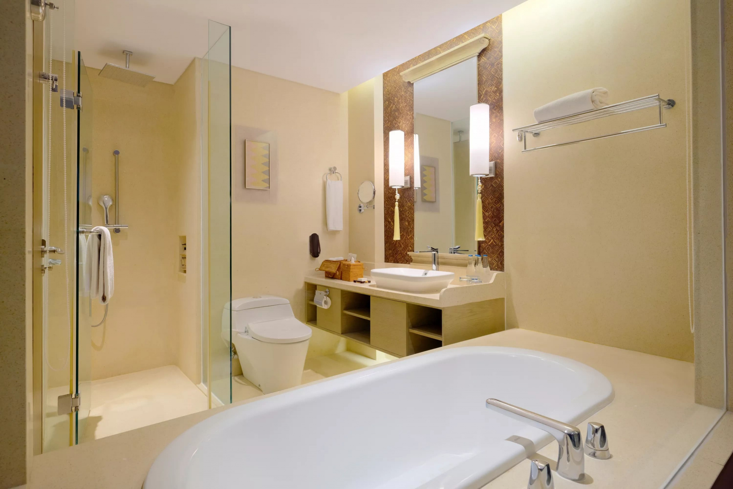 В номерах курортного отеля Mövenpick Resort & Spa Jimbaran Bali есть кондиционер, док-станция для iPod и телевизор с плоским экраном и 74 спутниковыми каналами. В каждом номере имеется собственная ванная комната с ванной, феном и бесплатными туалетно-косметическими принадлежностями. Гости смогут пользоваться купальными халатами и тапочками.