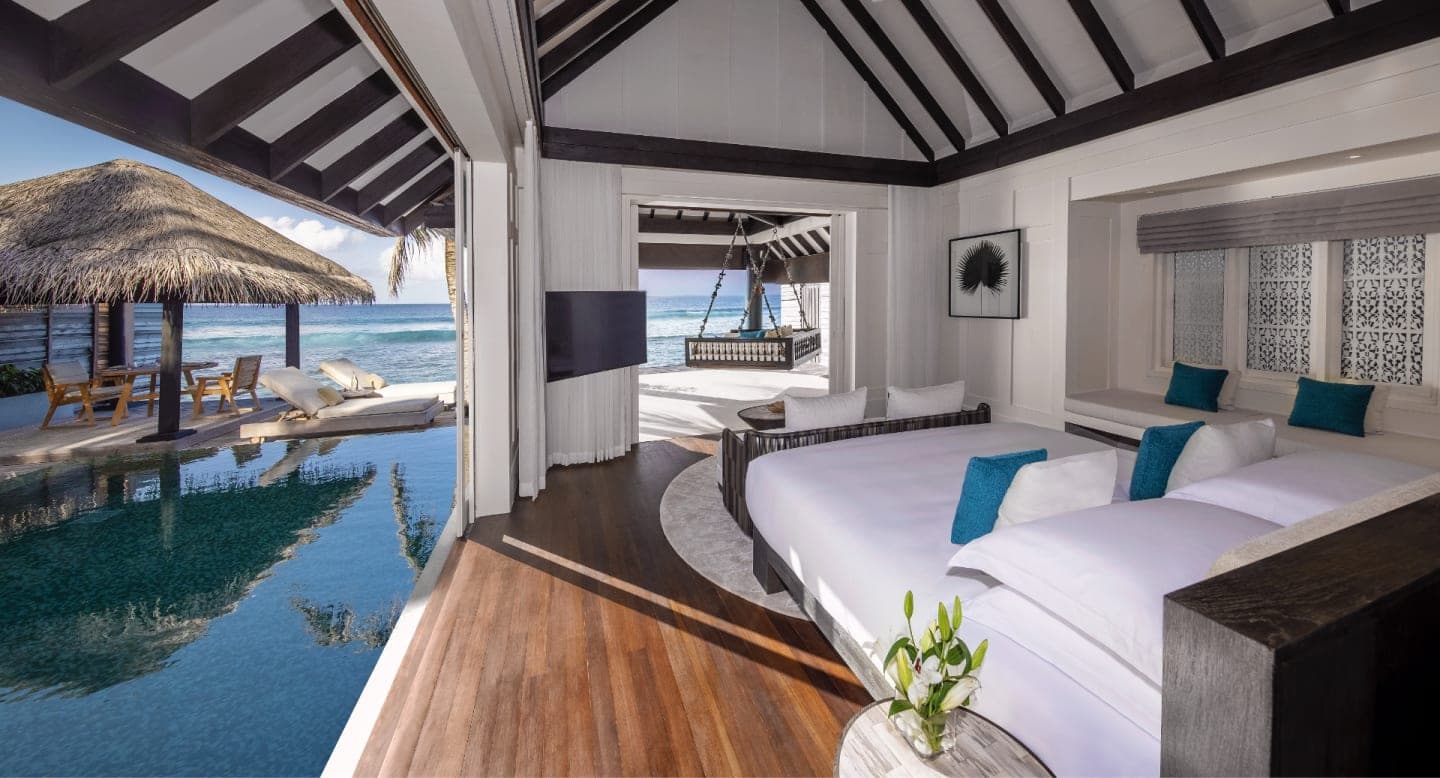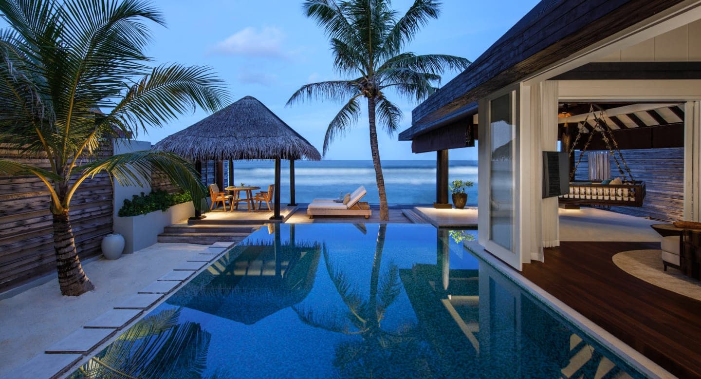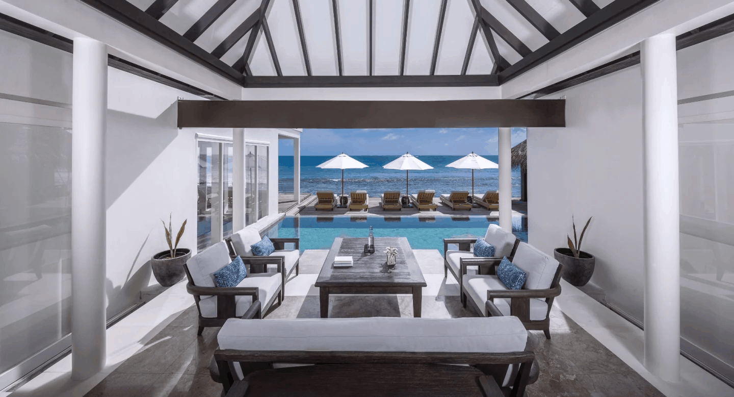 Прямой доступ к пляжу с белым песком и лагуне, большой панорамный бассейн, отдельная вилла со спальней с двуспальной кроватью и гостиной зоной, меблированной террасой, ванной, душевой и водопадом на открытом воздухе, ванной комнатой с душем. Гости могут бесплатно воспользоваться каяками и личной кабинкой для переодевания на берегу океана в нескольких минутах ходьбы от виллы. Предоставляется круглосуточный сервис. - 180 кв. м + 120 кв. м территории.