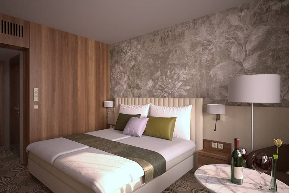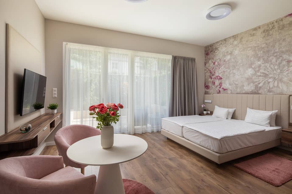 Здесь гостей круглый год ждет отдых в средиземноморских садах с великолепным пейзажным бассейном, площадь которого составляет 1000 кв. м, термальной купальней, напоминающей о Древнем Риме, и всевозможными оздоровительными удобствами и процедурами.