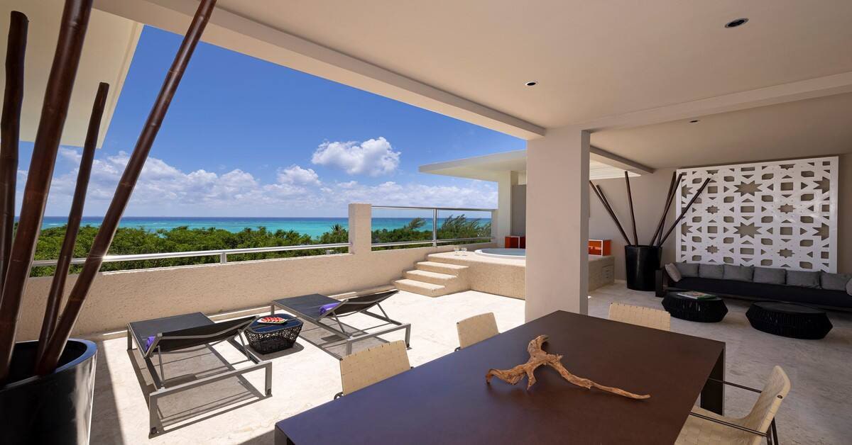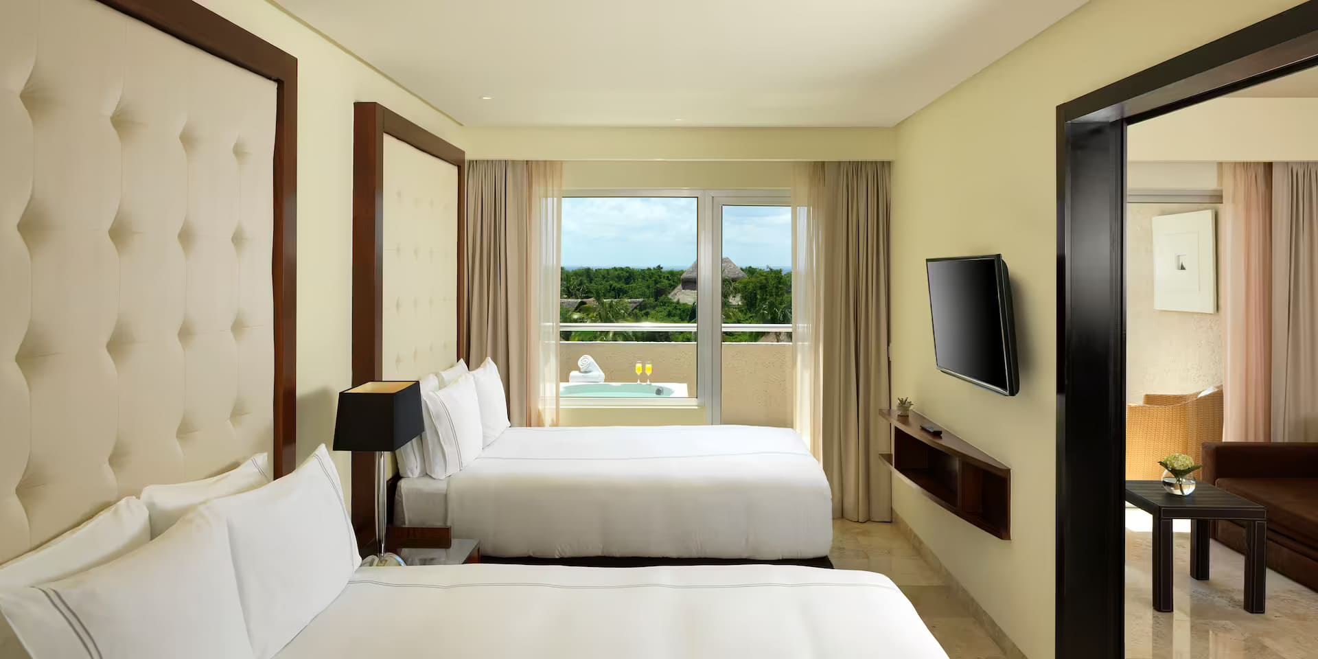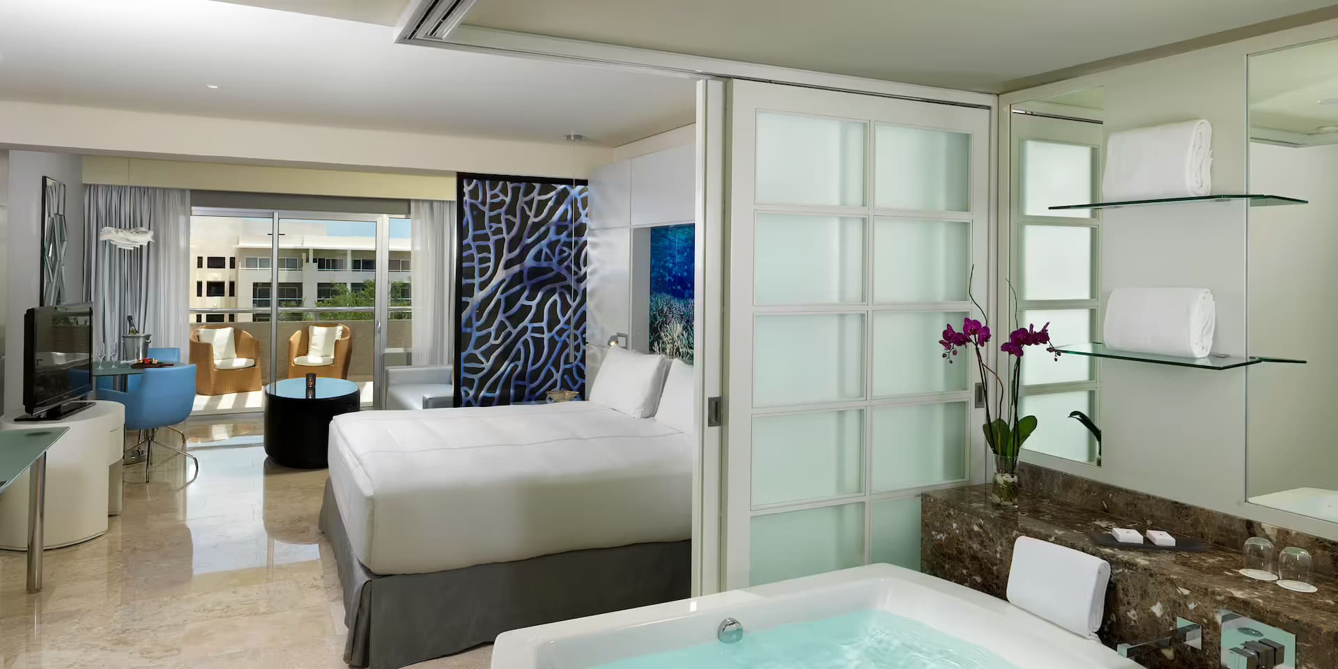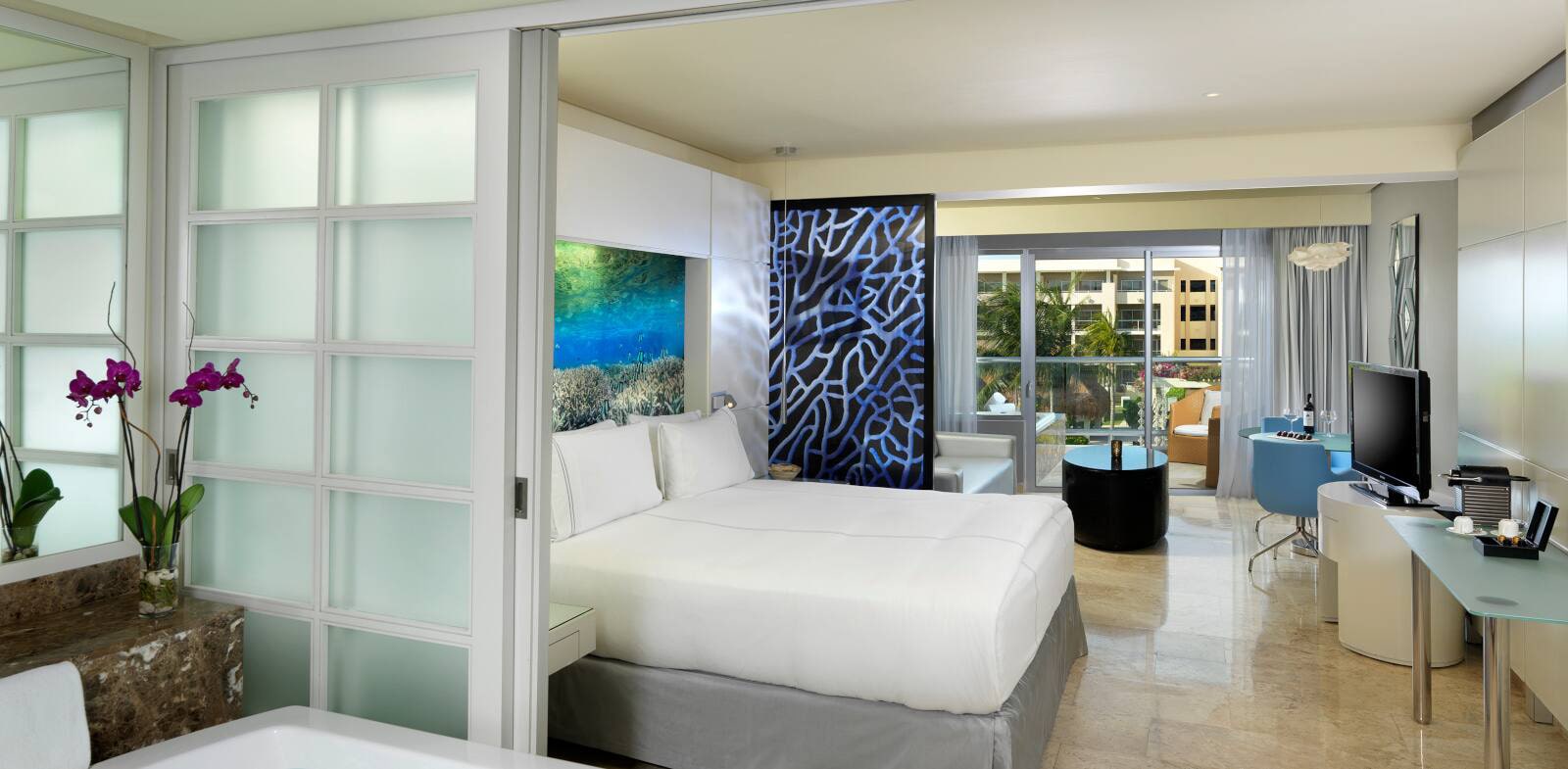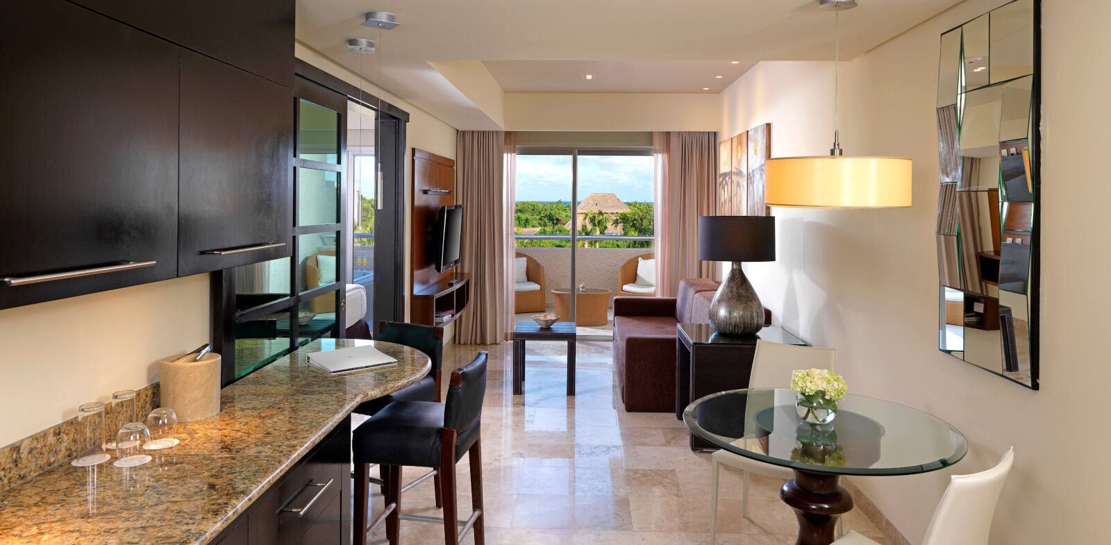 Здесь есть телевизор с плоским экраном (40”), CD- и DVD-плеер, кофемашина и мини-бар. Ванная комната с сенсорными включателями и душем «тропический дождь». Дополнительно в сьюте — утюг и гладильная доска. Самый роскошный номер — One-bedroom master suite (83 кв. м) с террасой (22 кв. м) и персональным джакузи.