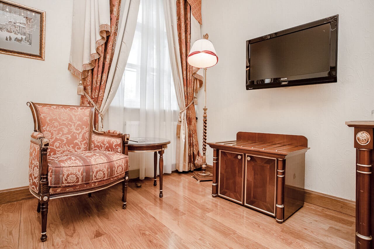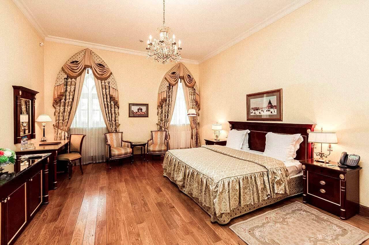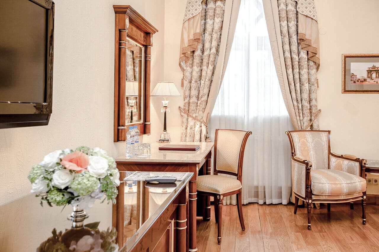 Представительский двухкомнатный люкс с одной спальней (60 кв. м): гостиная, спальня с кроватью king-size, ванная комната, гостевой туалет. Вид на исторический внутренний двор.