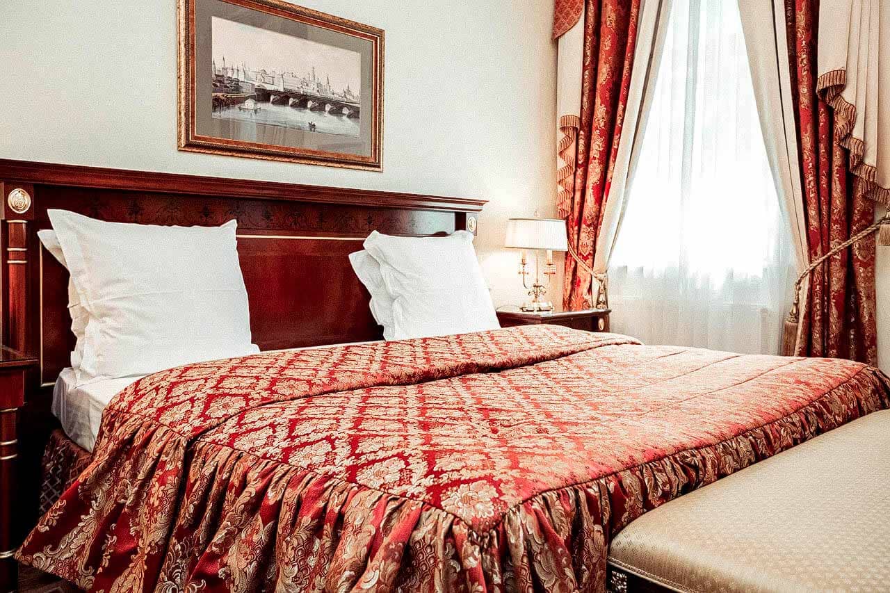 Стандартный номер с двуспальной кроватью (30 кв. м): спальня с кроватью king-size, ванная комната. Вид на правую или левую дворцовую аллею.