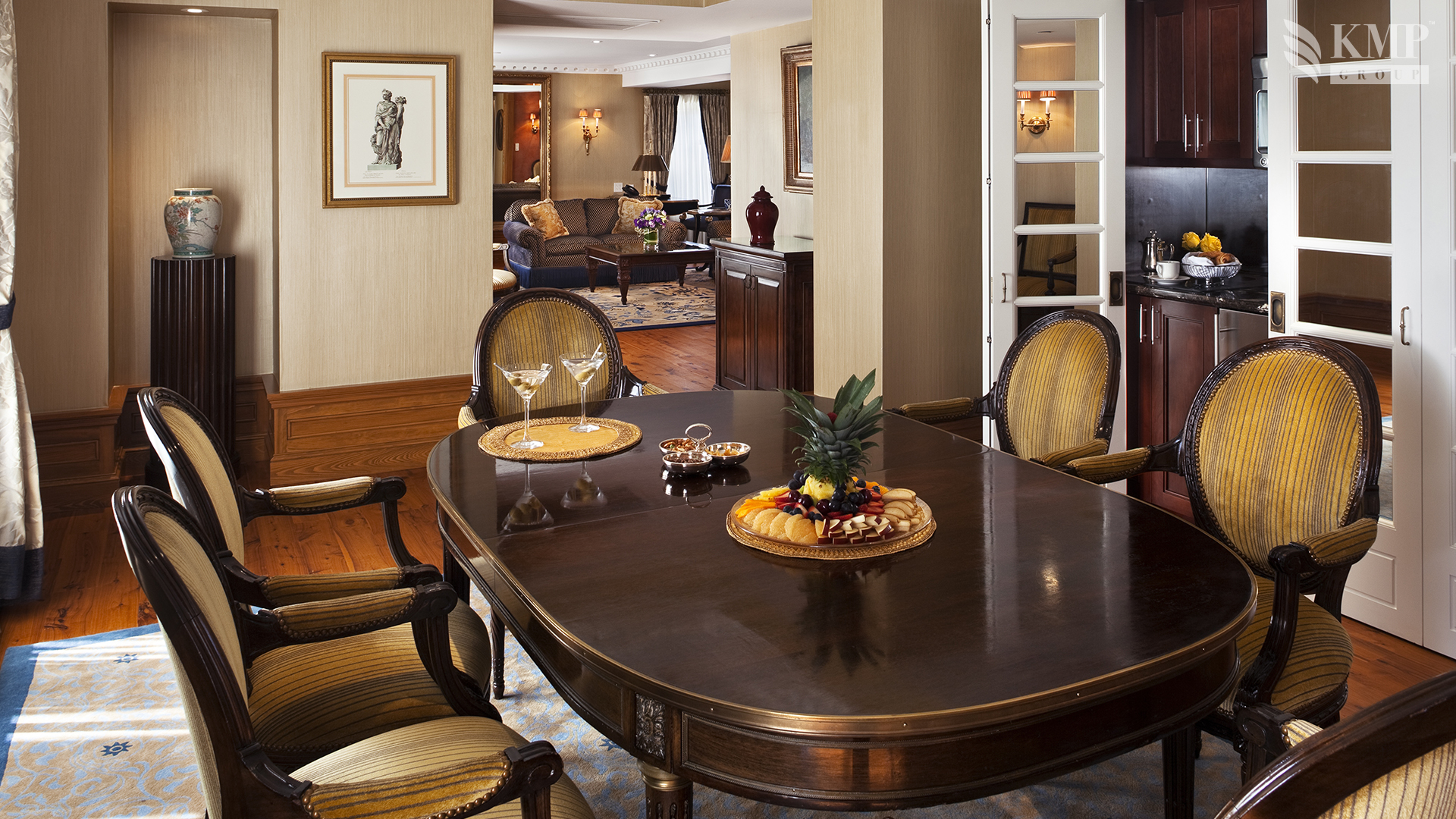 Penthouse suite (184 кв. м): двухэтажные номера. На первом этаже: гостиная с декоративным камином, столовая (стол на 12 персон), спальня. На втором этаже: терраса, спальня. Расположены на 17 и 18 этажах.
