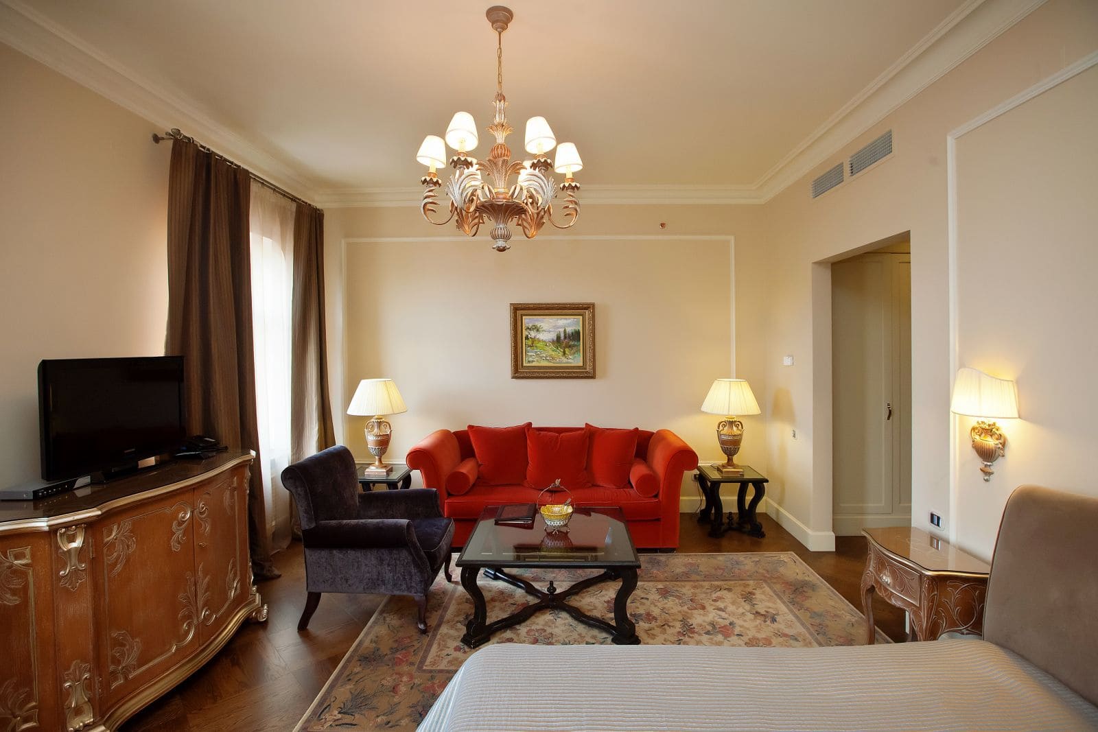 Делюкс (50 кв. м). Номер с размещением double или twin. Высокие потолки, классический дизайн интерьера, итальянская мебель и премиальный текстиль, качественная парфюмерия в ванной комнате и соответствующая пятизвездочному отелю техника. Здесь Вы ощутите комфорт, полноценный отдых и вдохновение на плодотворную работу.