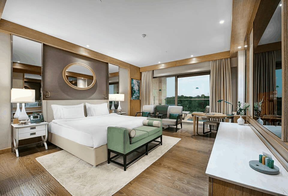 Просторные номера курортного отеля Regnum Carya выходят на собственный балкон или террасу. Все номера оснащены ЖК-телевизором со спутниковыми каналами. В некоторых люксах установлена гидромассажная ванна.