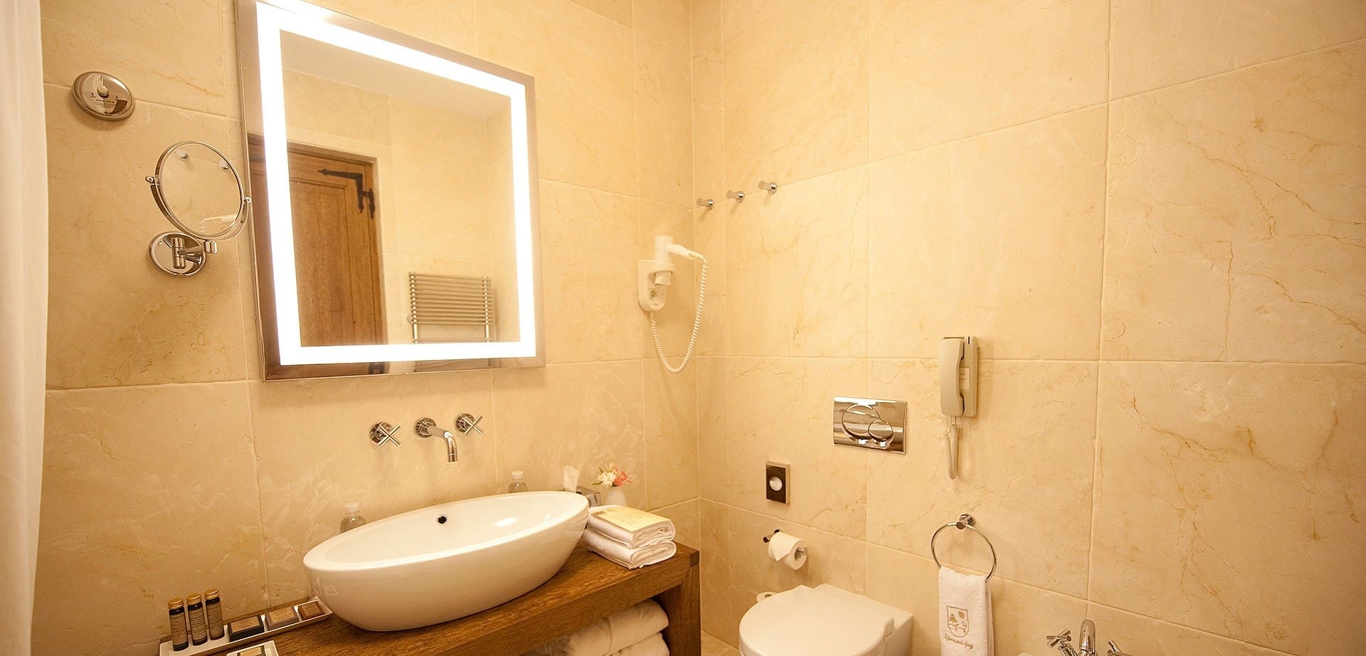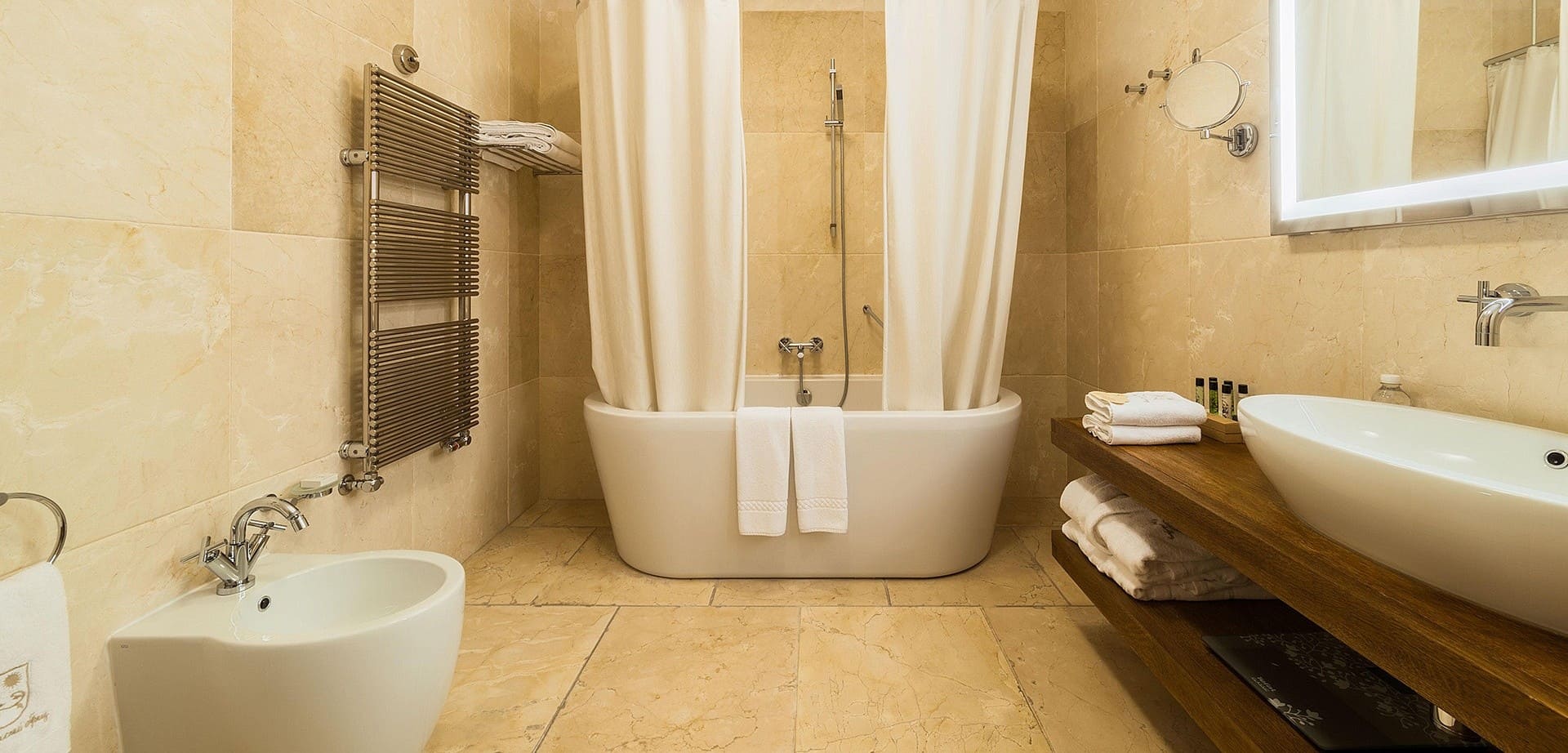В ванной: ванна/душ, подогреваемый пол, биде, фен, телефон и весы.