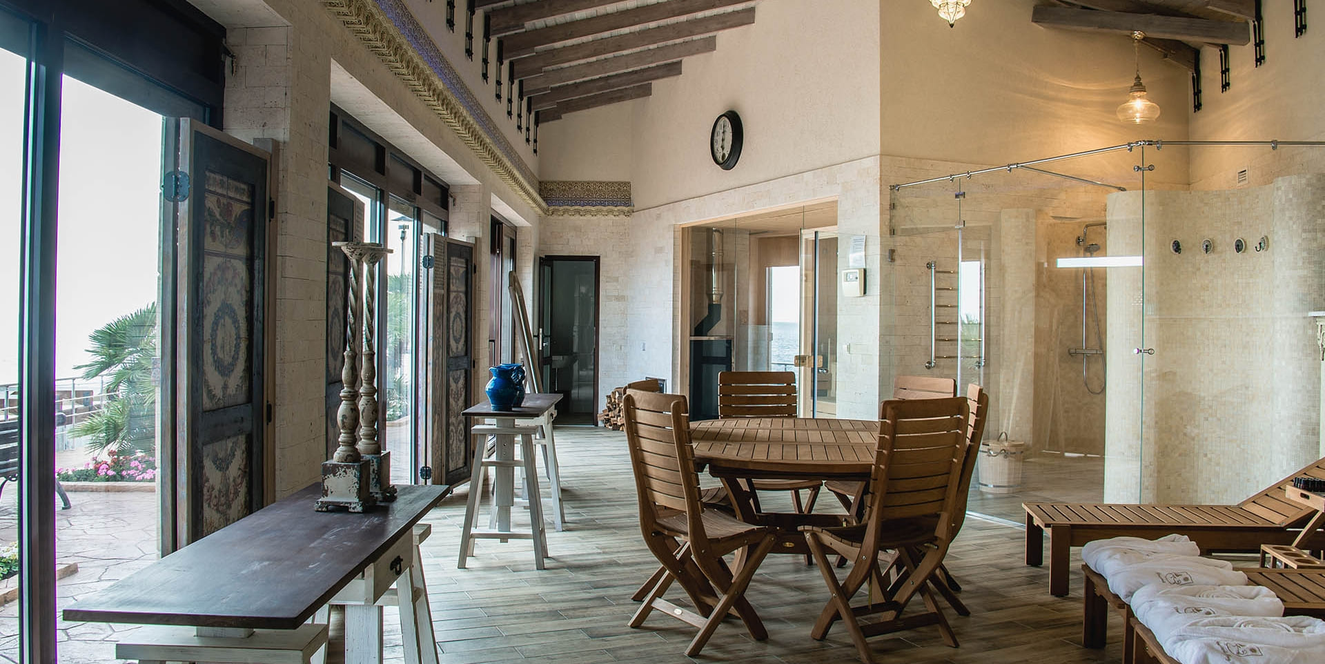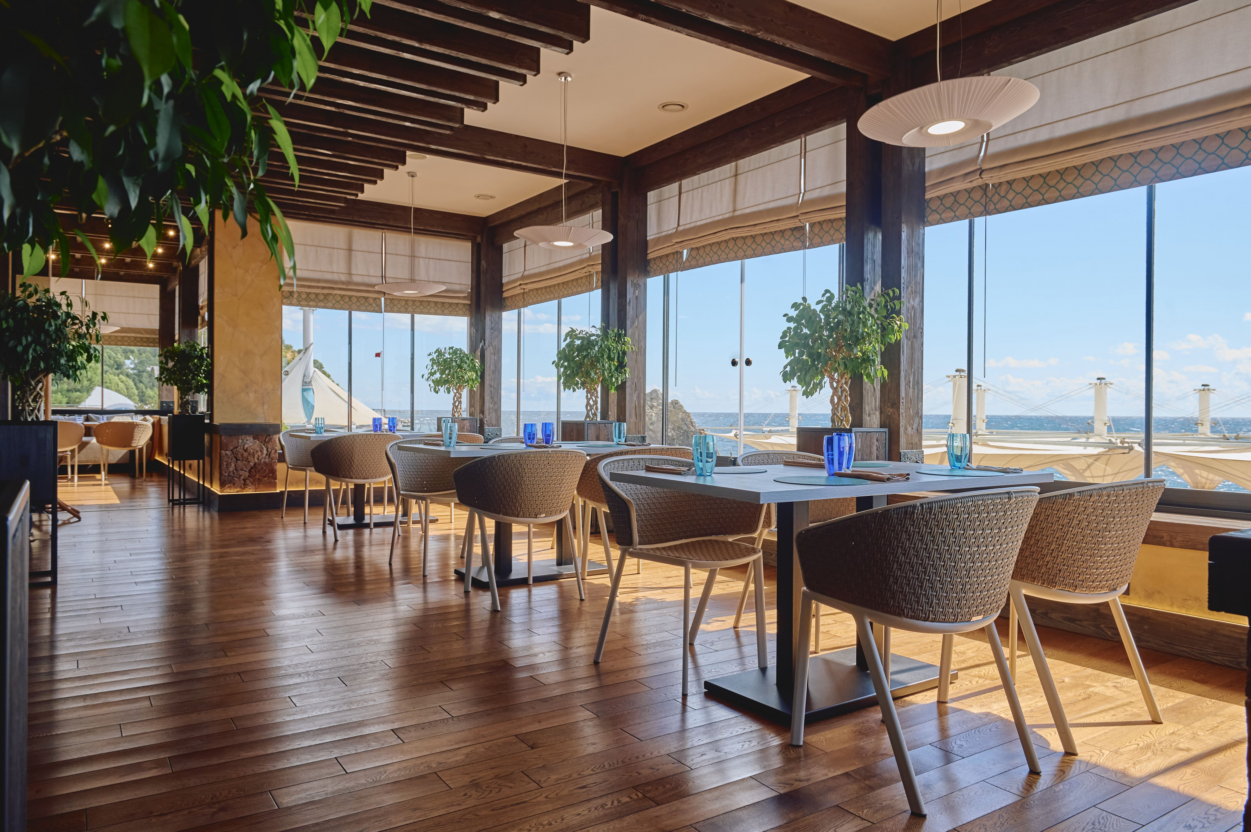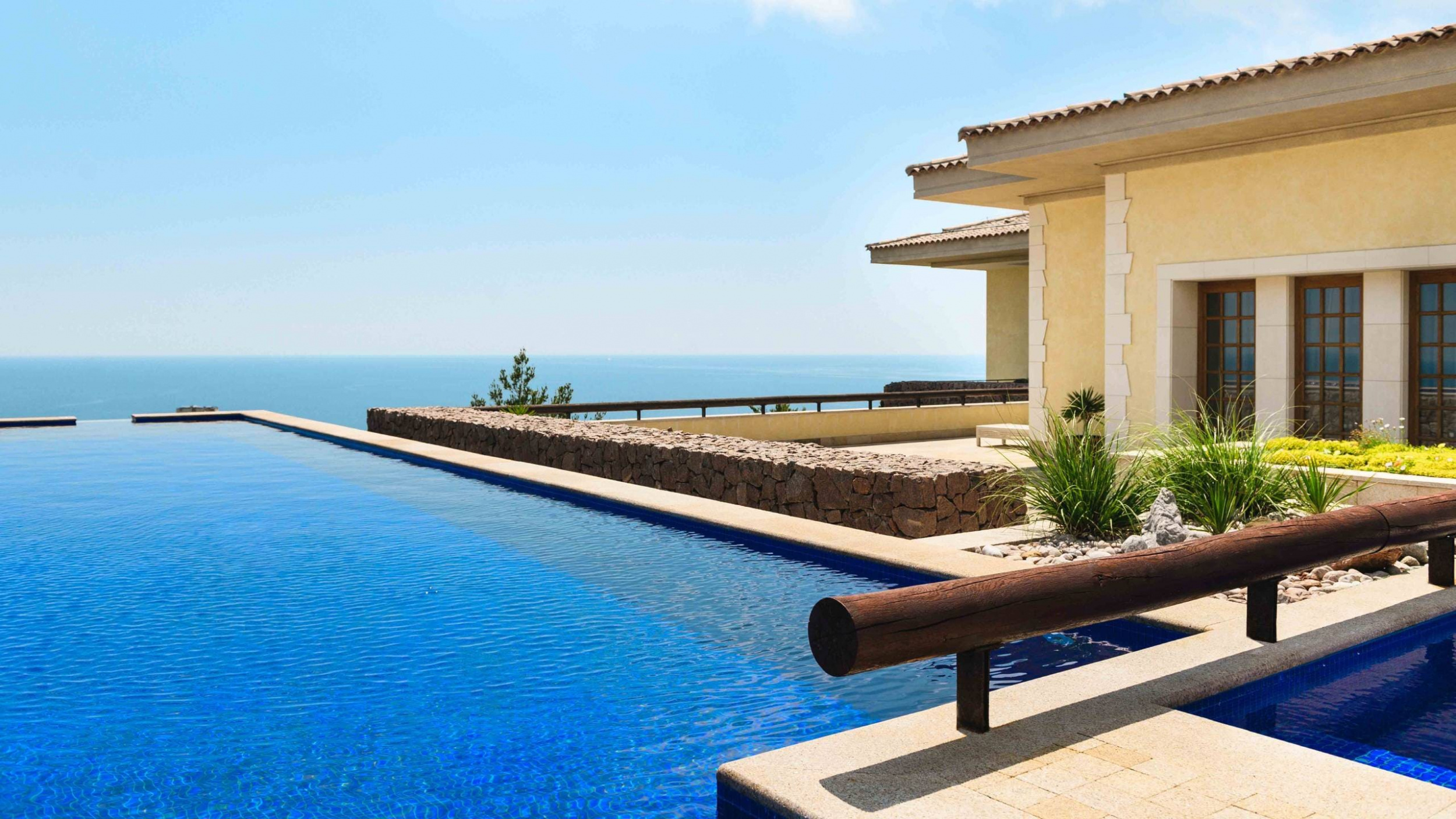 Вилла «Вишневый сад» (300 кв.м.) В номере: система климат контроля, полы с подогревом, плазменные ТВ гостиной и каждой спальне, сейфы в каждой спальной комнате, оборудование на кухне: холодильник, плита, кофе машина, посуда. 1 этаж — холл, кухня, гардеробная и санузел. 2 этаж — рабочий кабинет, 4 спальни, каждая имеет отдельную ванную комнату и выход к открытому бассейну.