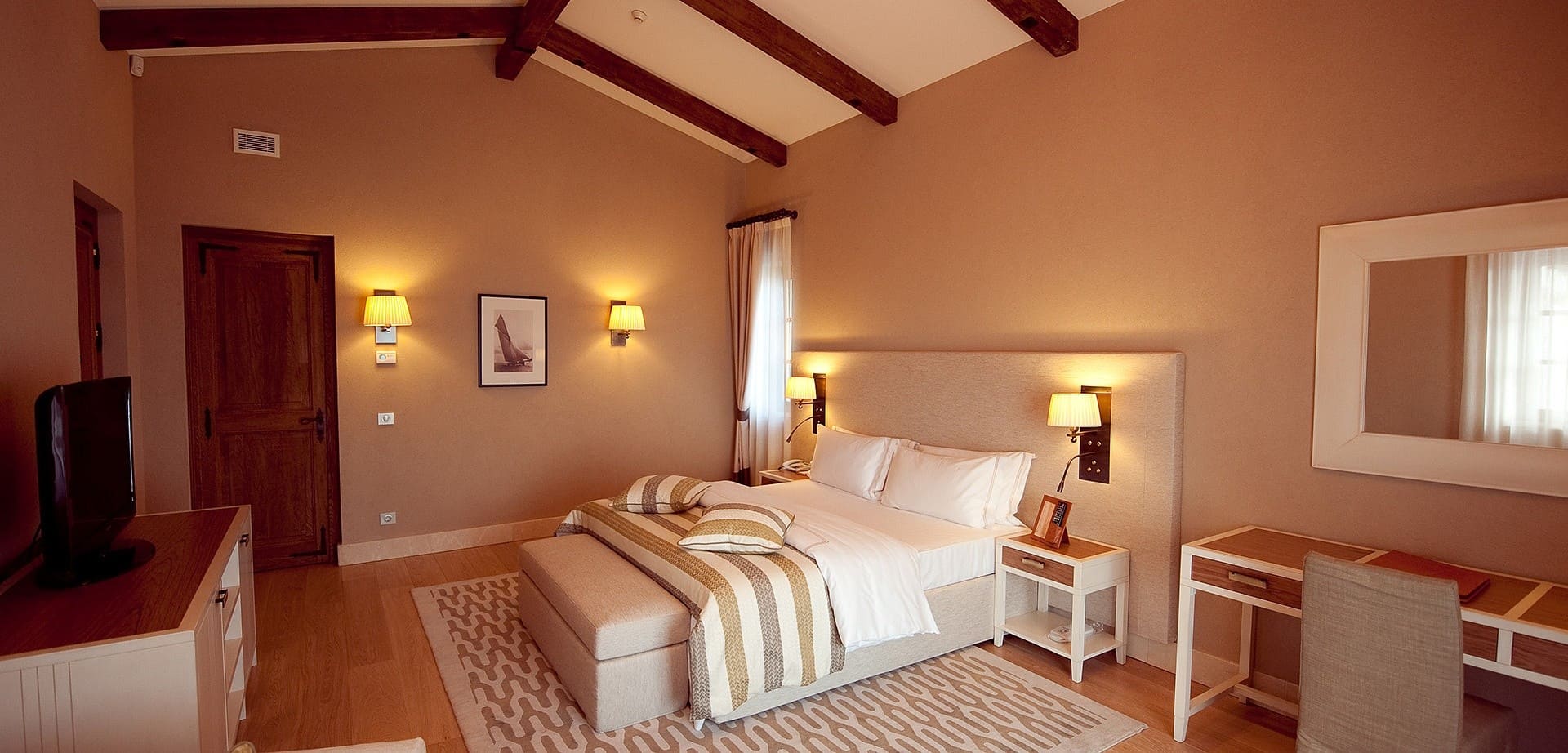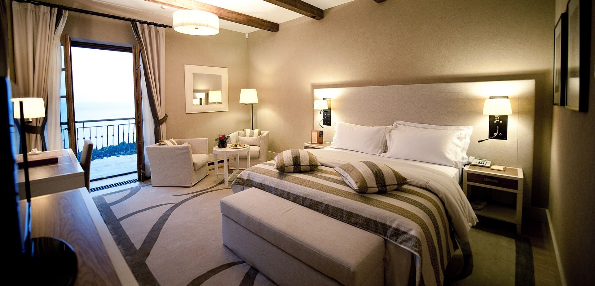 Номер «Люкс» (130 кв.м.) Номер разделен на гостевую и спальную зоны, с ванной комнатой. В номере панорамные окна, через которые открывается вид на море и парк. В номере: двуспальная кровать. В ванной: ванна, подогреваемый пол, биде, фен, телефон и весы.