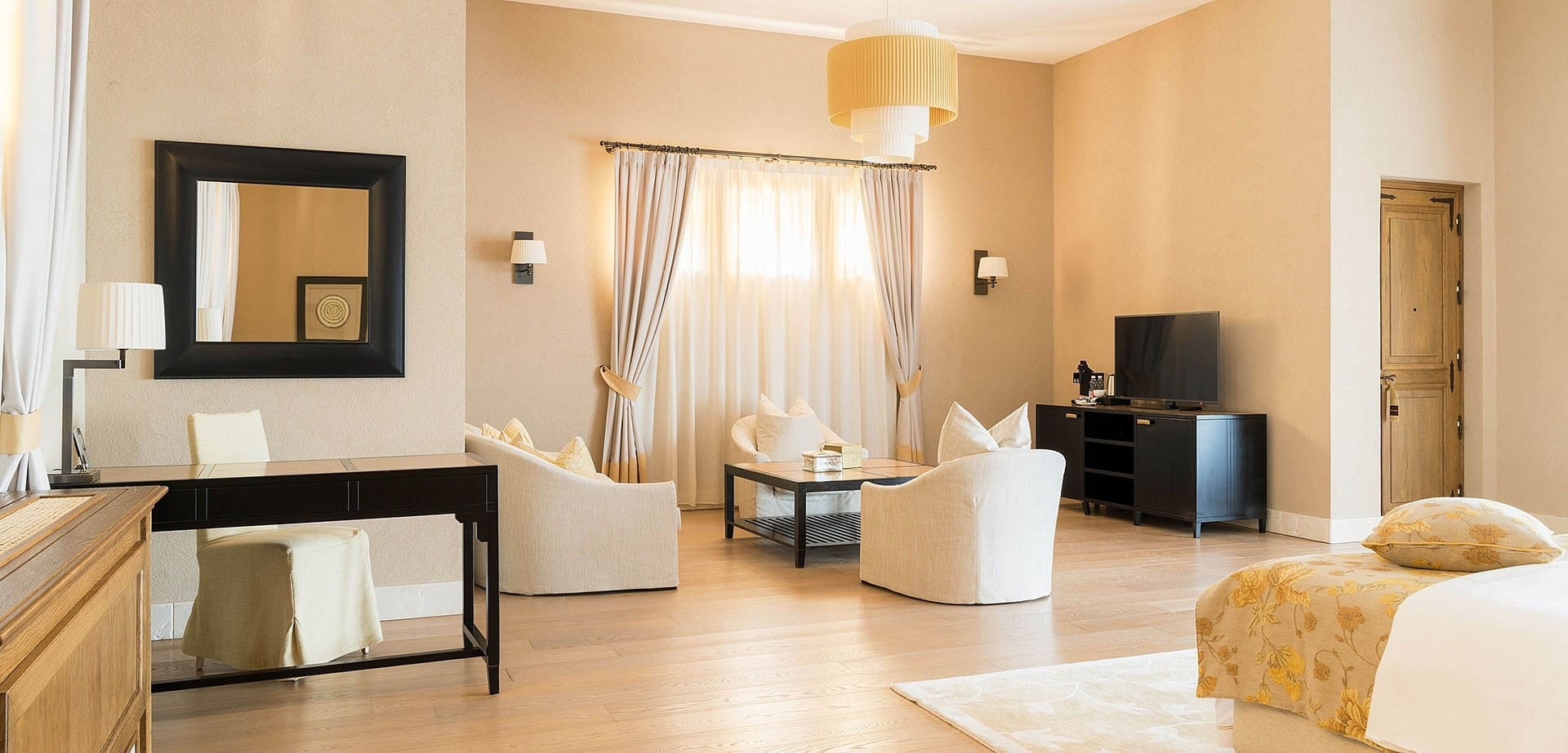 Семейный Люкс (130 кв.м.) Номер разделен на гостевую и спальную зоны, с ванной комнатой. В номере панорамные окна, через которые открывается вид на море и парк. В номере: двуспальная кровать. В ванной: ванна, подогреваемый пол, биде, фен, телефон и весы.