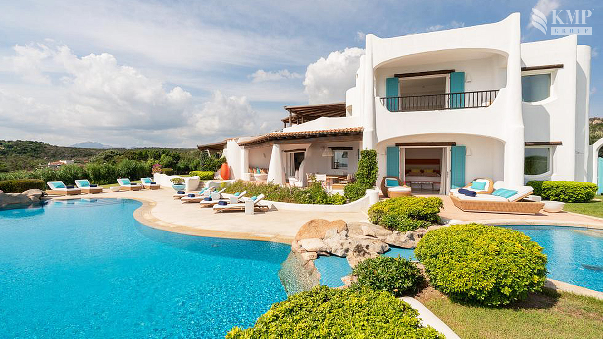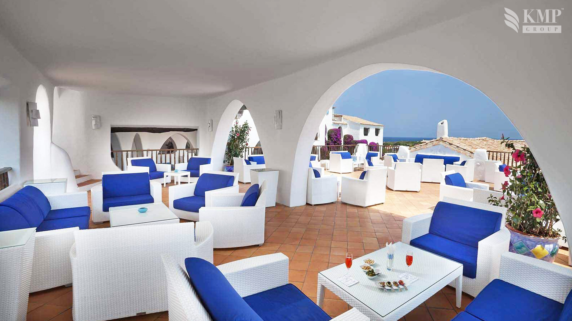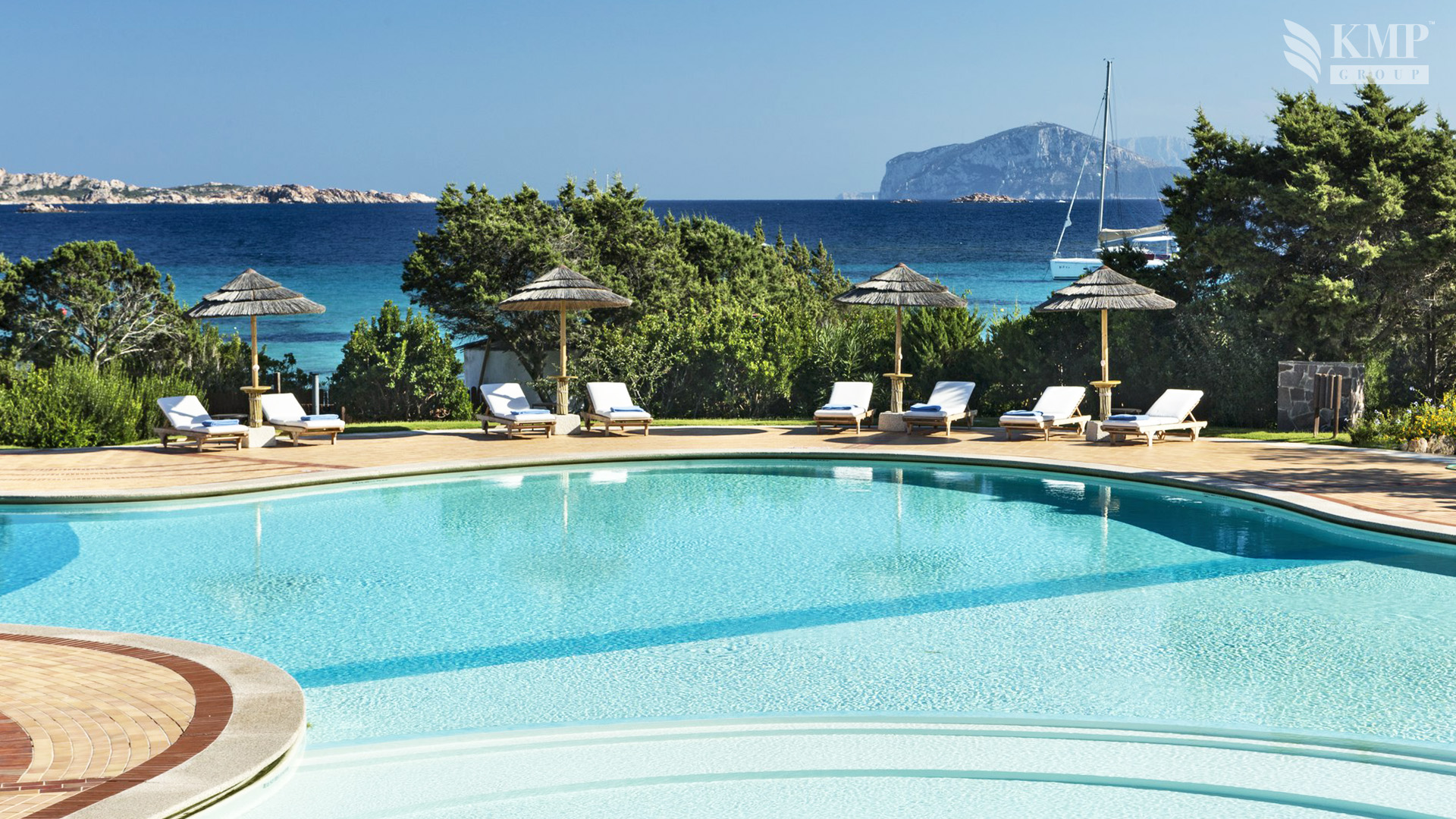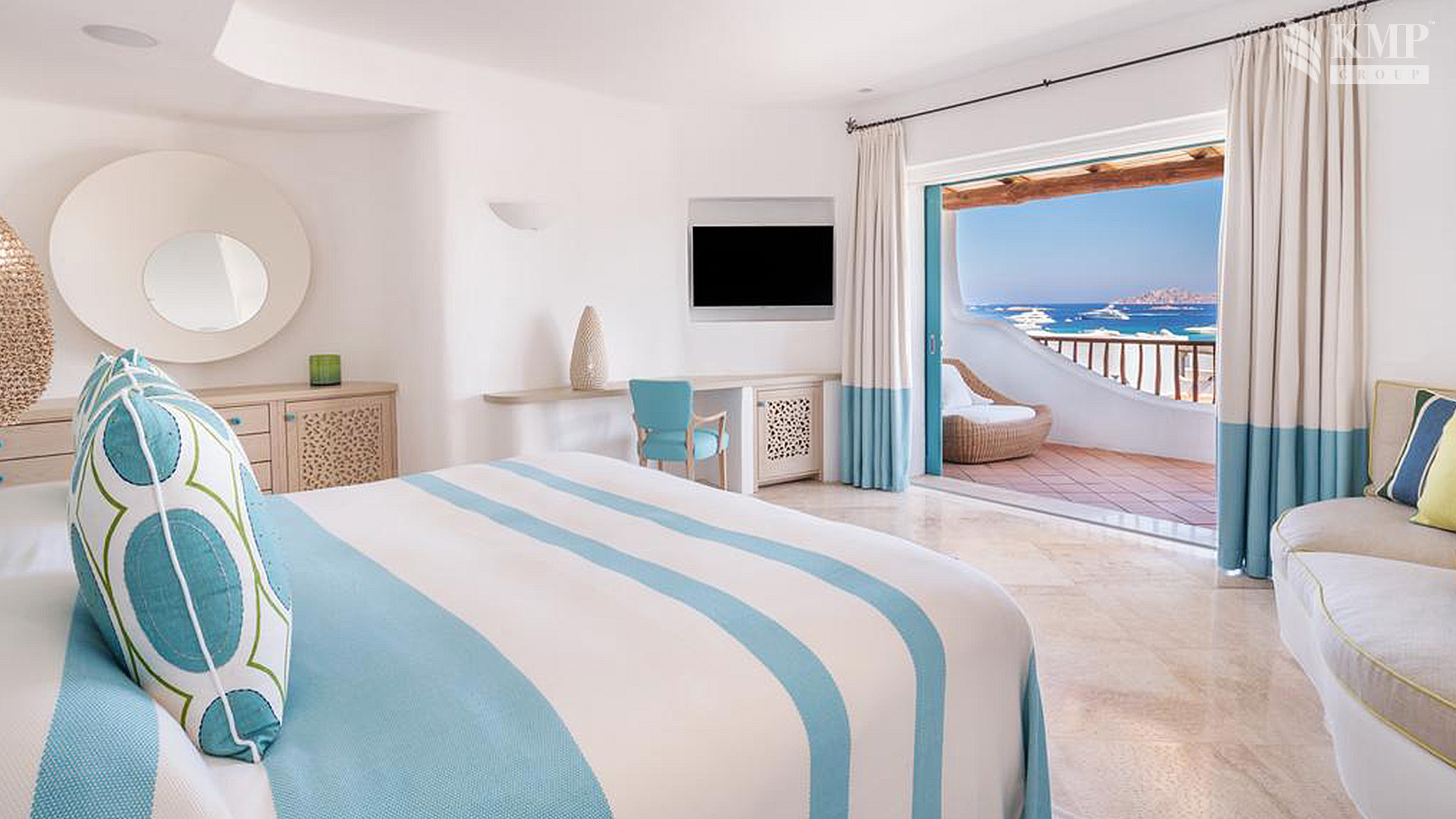 Unique royal suite (75 кв. м). 2 террасы (одна – 35 кв. м с джакузи на открытом воздухе), прихожая, гостиная, столовая (стол на 6 персон), спальня, 2 ванные комнаты с душевыми кабинами с функцией «тропический дождь». Дополнительно: спутниковое телевидение. Собственный лифт. Расположен на последнем этаже. Вид на море, остров Mortorio и сад. Возможно объединение с номером Unique presidential suite.