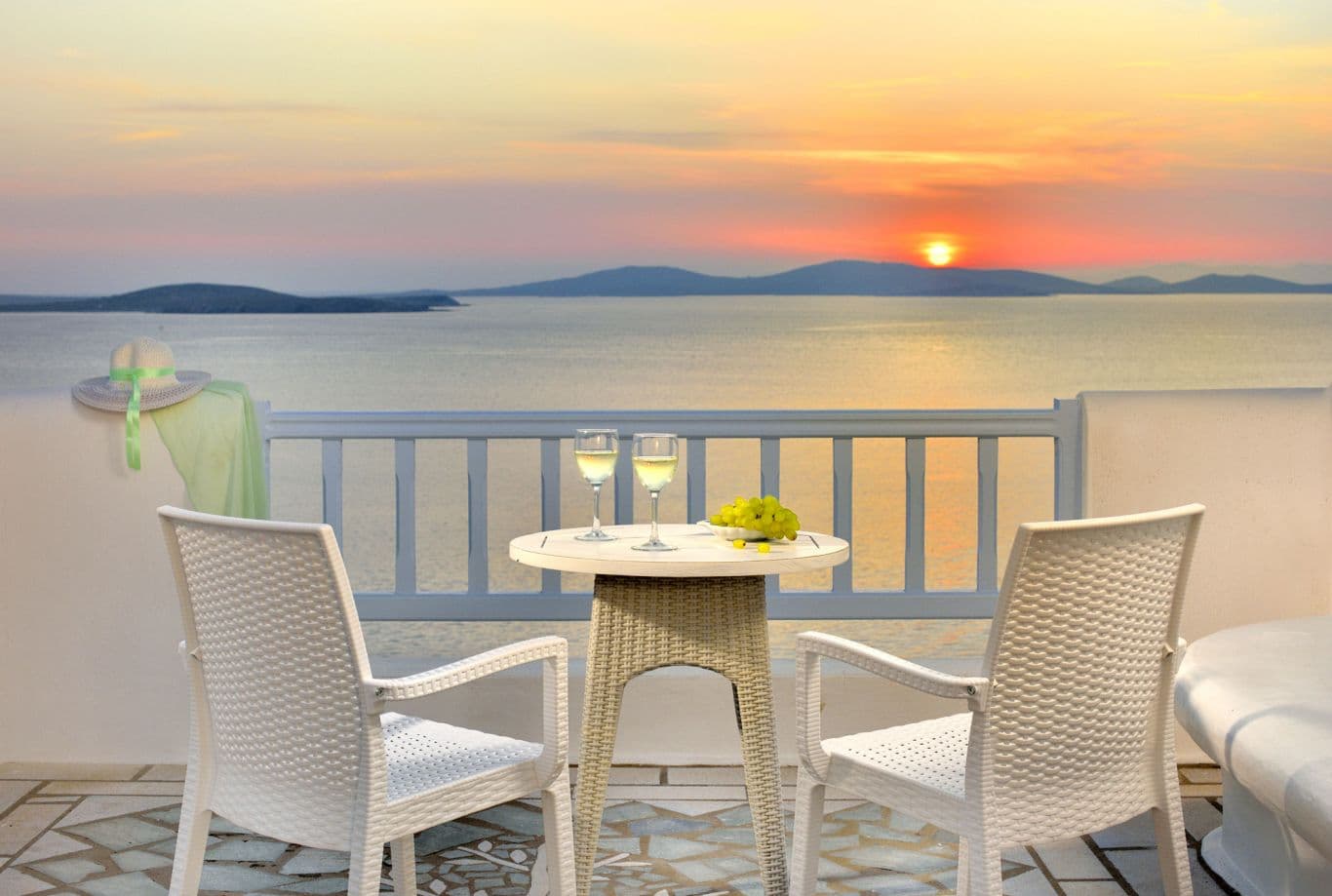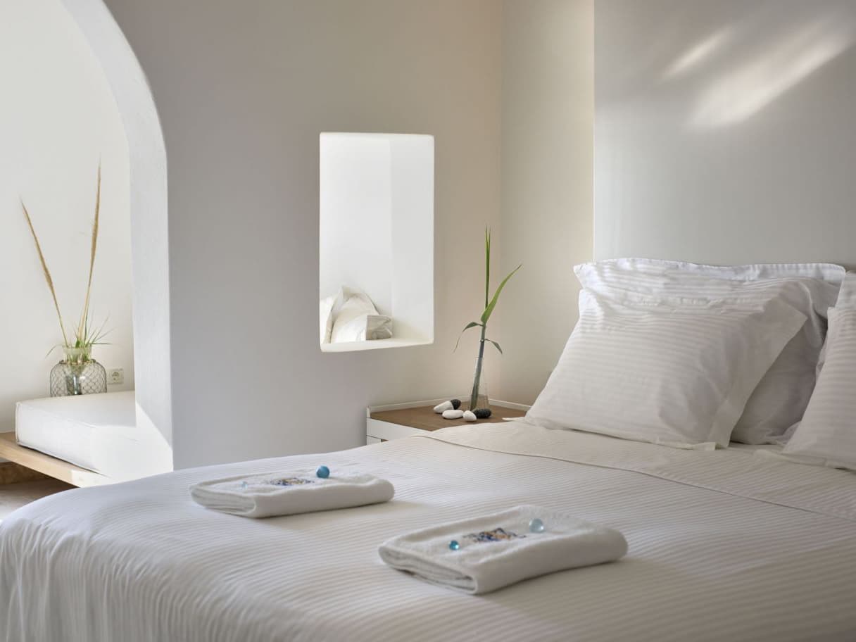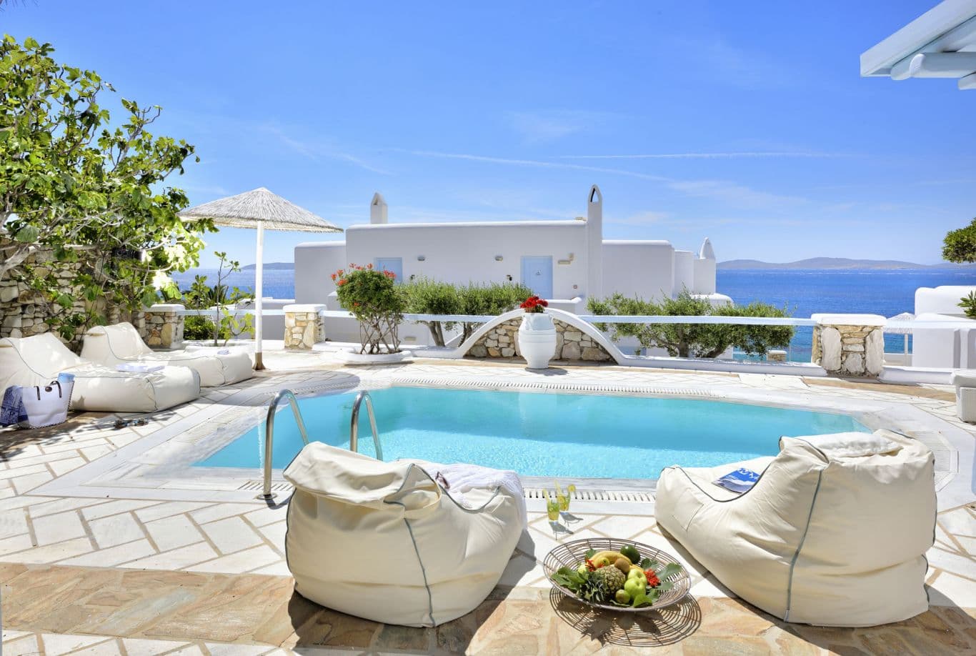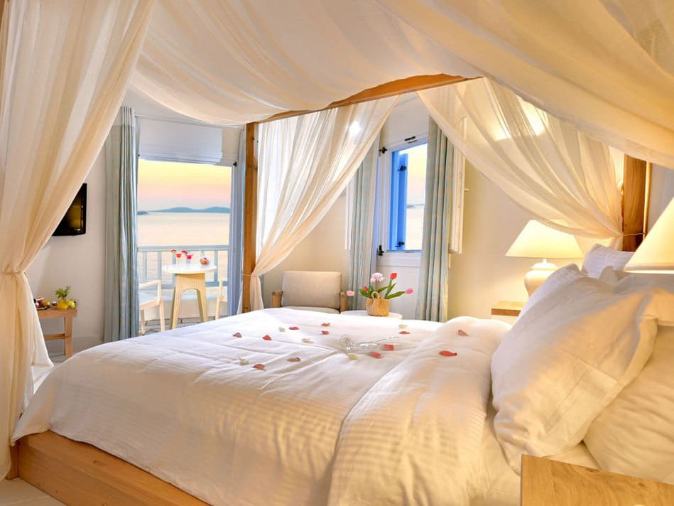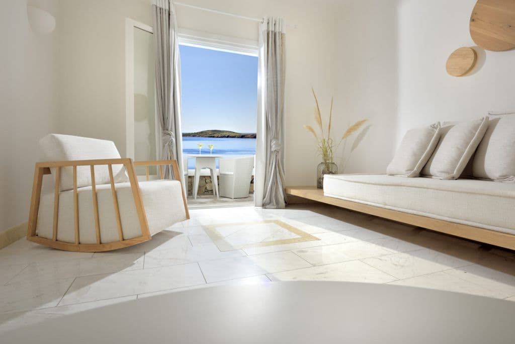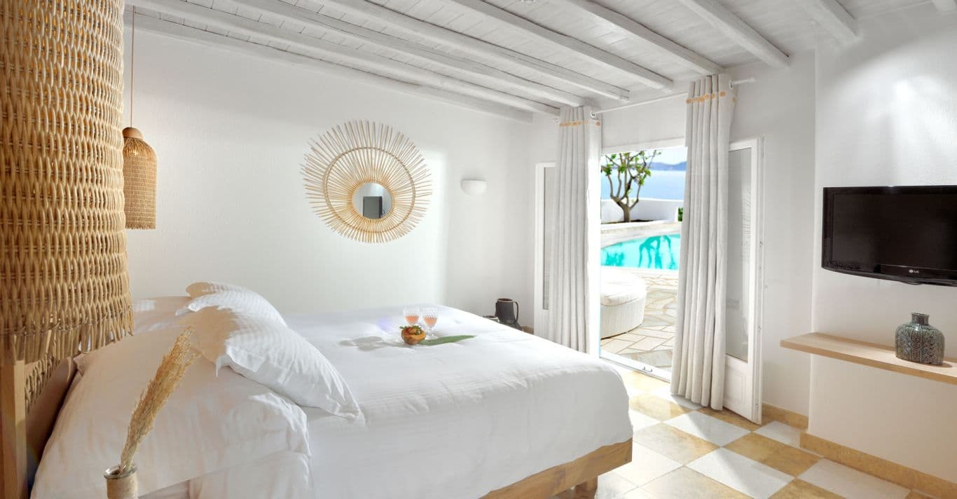 На юго-западном побережье острова, на собственном песчаном пляже. В 4 километрах от города Миконос, в 4 километрах от аэропорта.