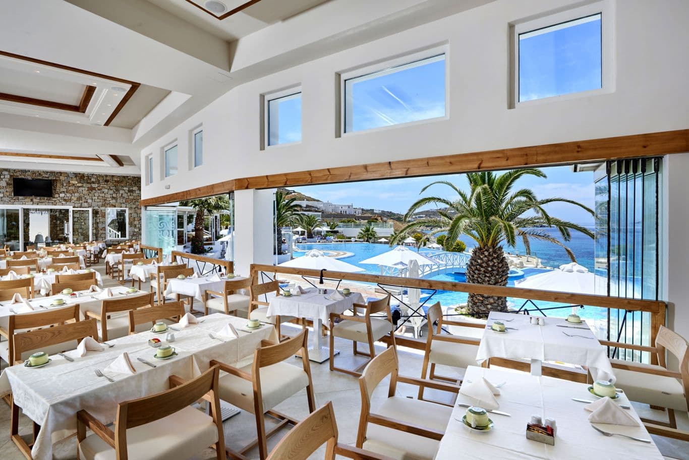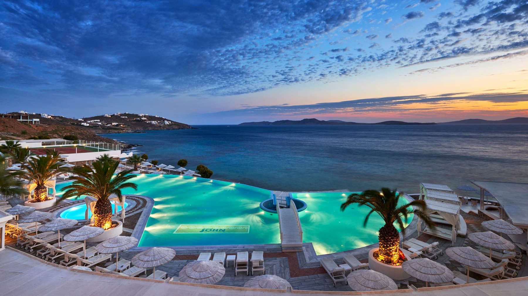 Saint John Hotel расположен в одном из уеденных уголков острова Миконос. Отель был создан специально для путешественников, привыкших к отдыху класса люкс, и бизнес-поездок. На просторной территории отеля (20 000 кв. м) расположились изысканные рестораны, великолепные бассейны, SPA-центр, конференц-залы, оснащенные современным оборудованием. В Saint John Hotel находится самый большой на острове бассейн с морской водой, на каждой вилле есть собственный бассейн. С белого песчаного пляжа отеля открывается прекрасный вид на Делос – «остров богов», родину Апполона и Артемиды. Тренажерный зал, теннисный корт, бизнес-центр, 3 конференц-зала (до 850 человек), Wi-Fi доступ в Интернет, детская игровая площадка.