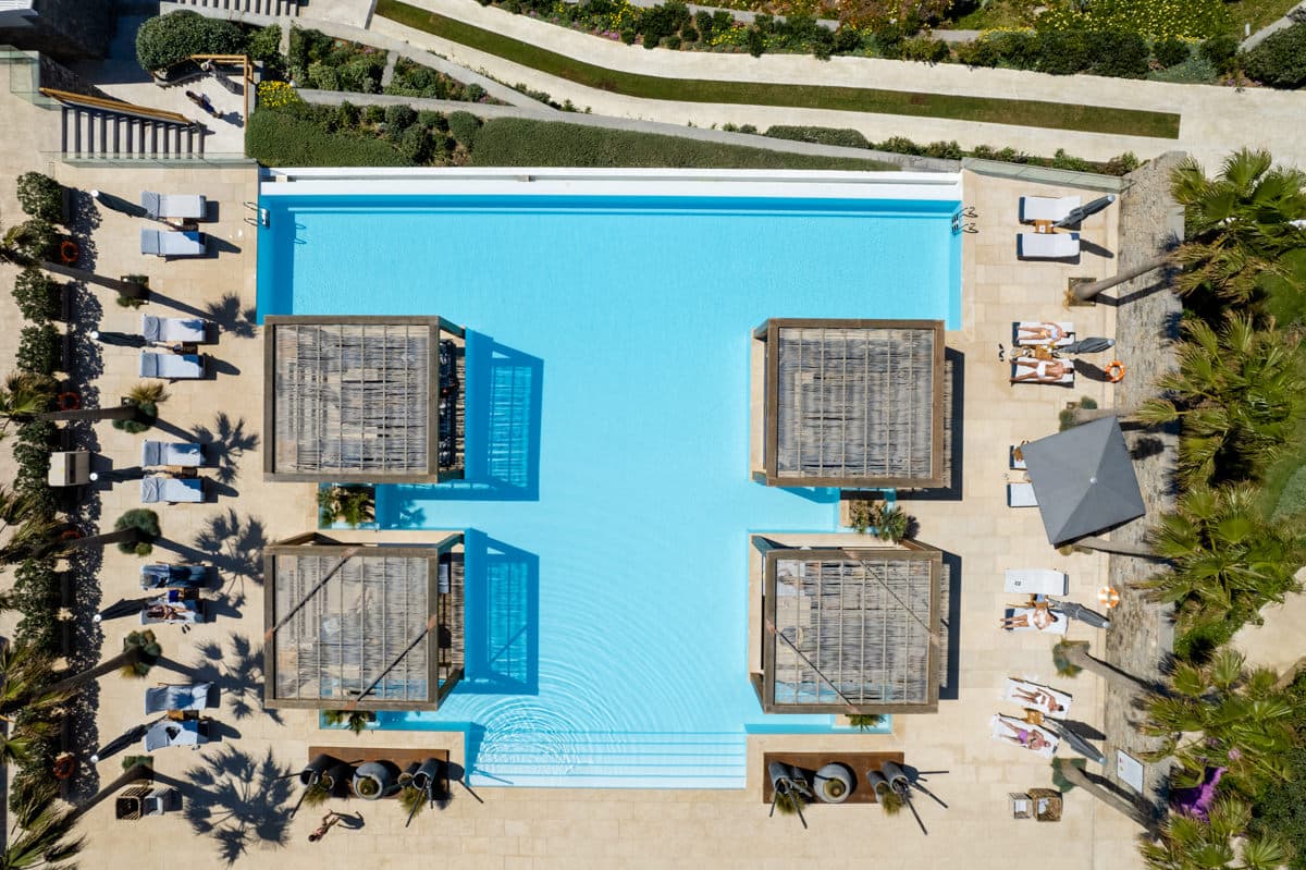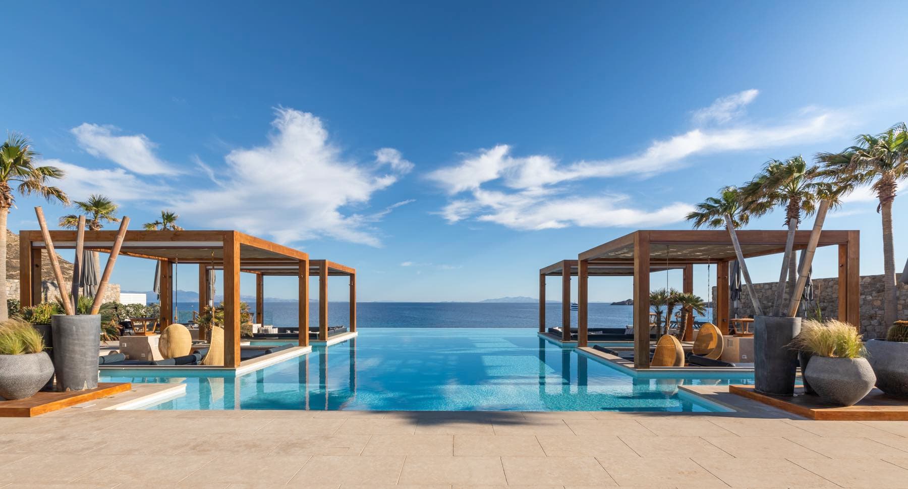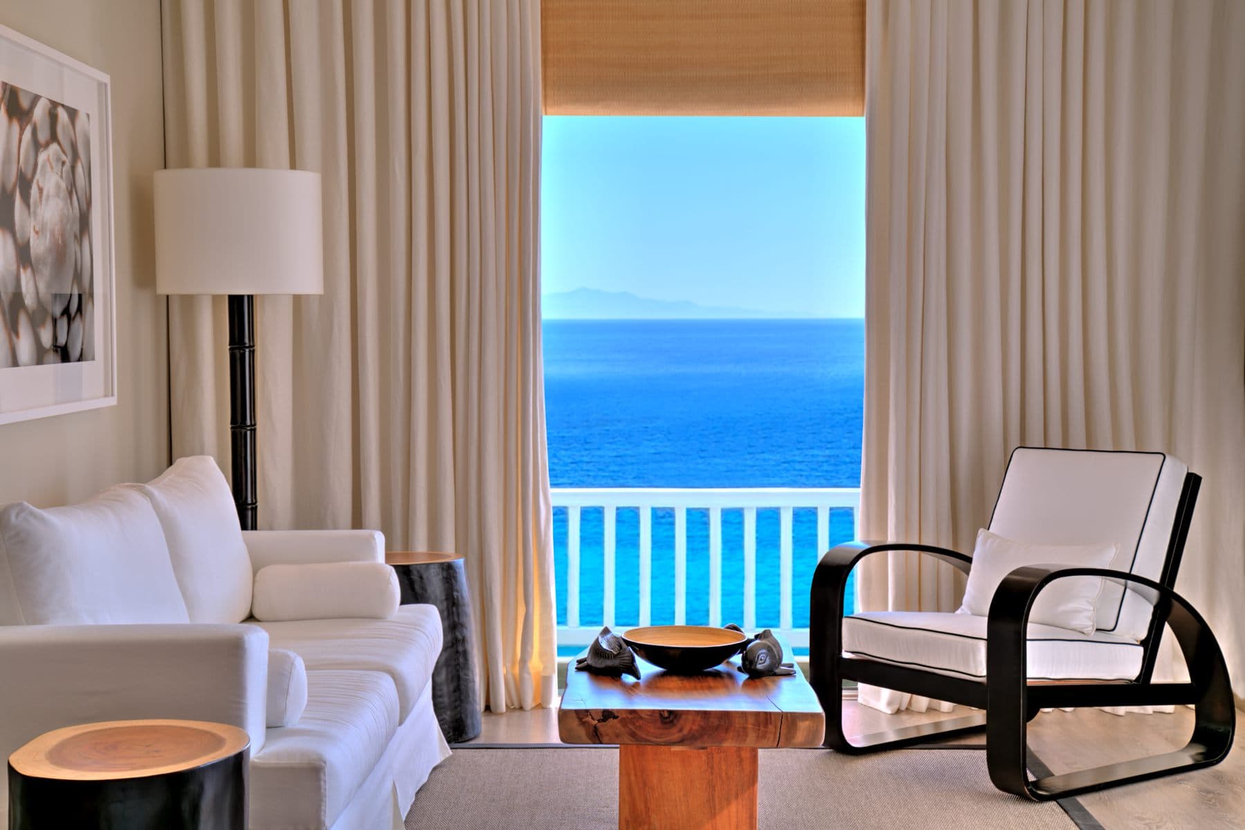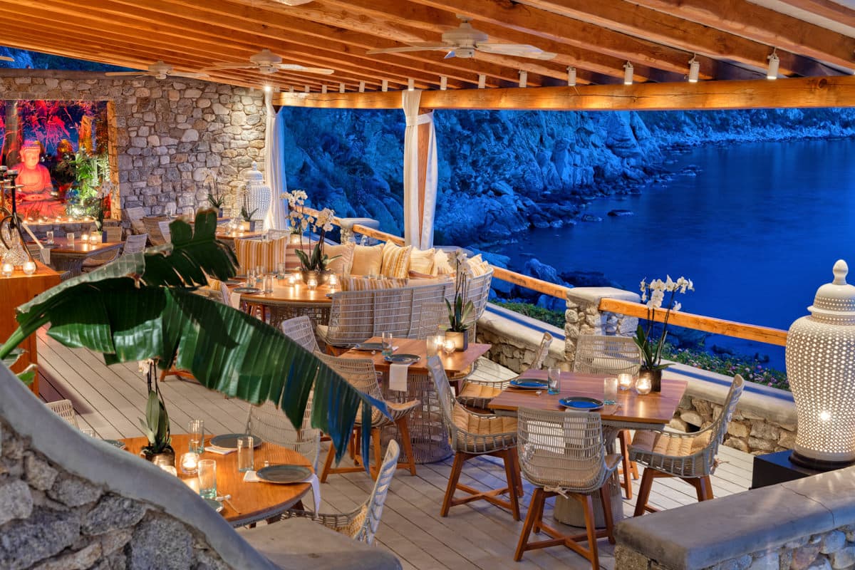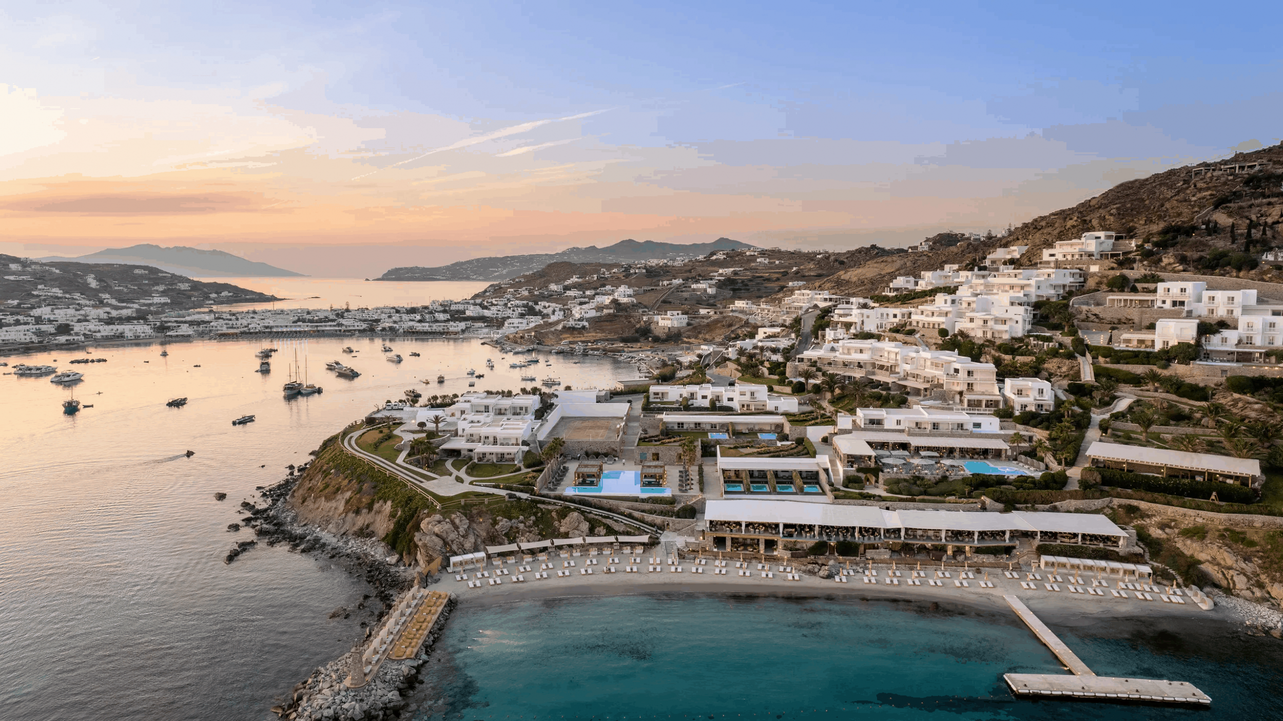 Отель расположен на уединенном полуострове на собственном песчаном пляже, в 3 километрах от города Миконос, в 30 минутах перелета от Афин или в 3 часах езды на катере от порта Пирей (Афины).