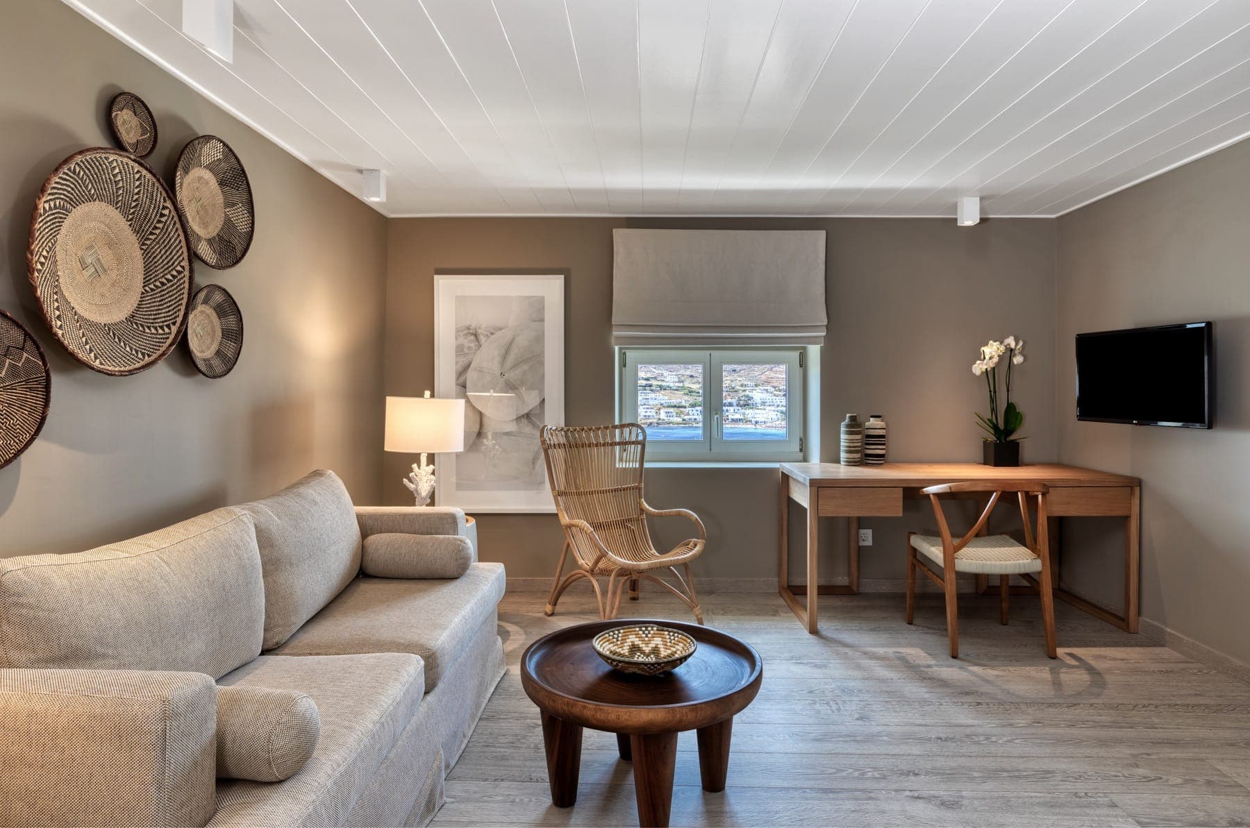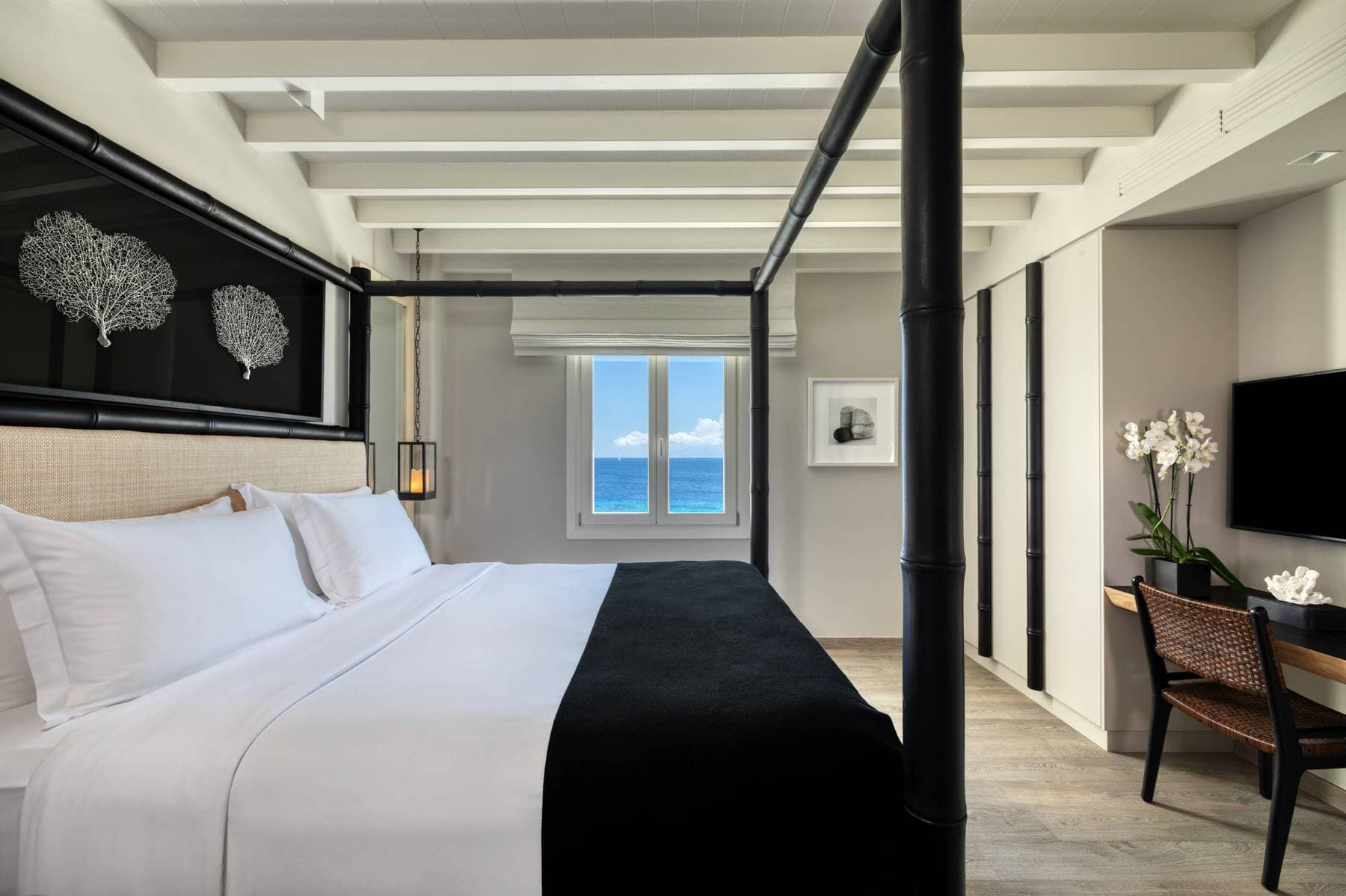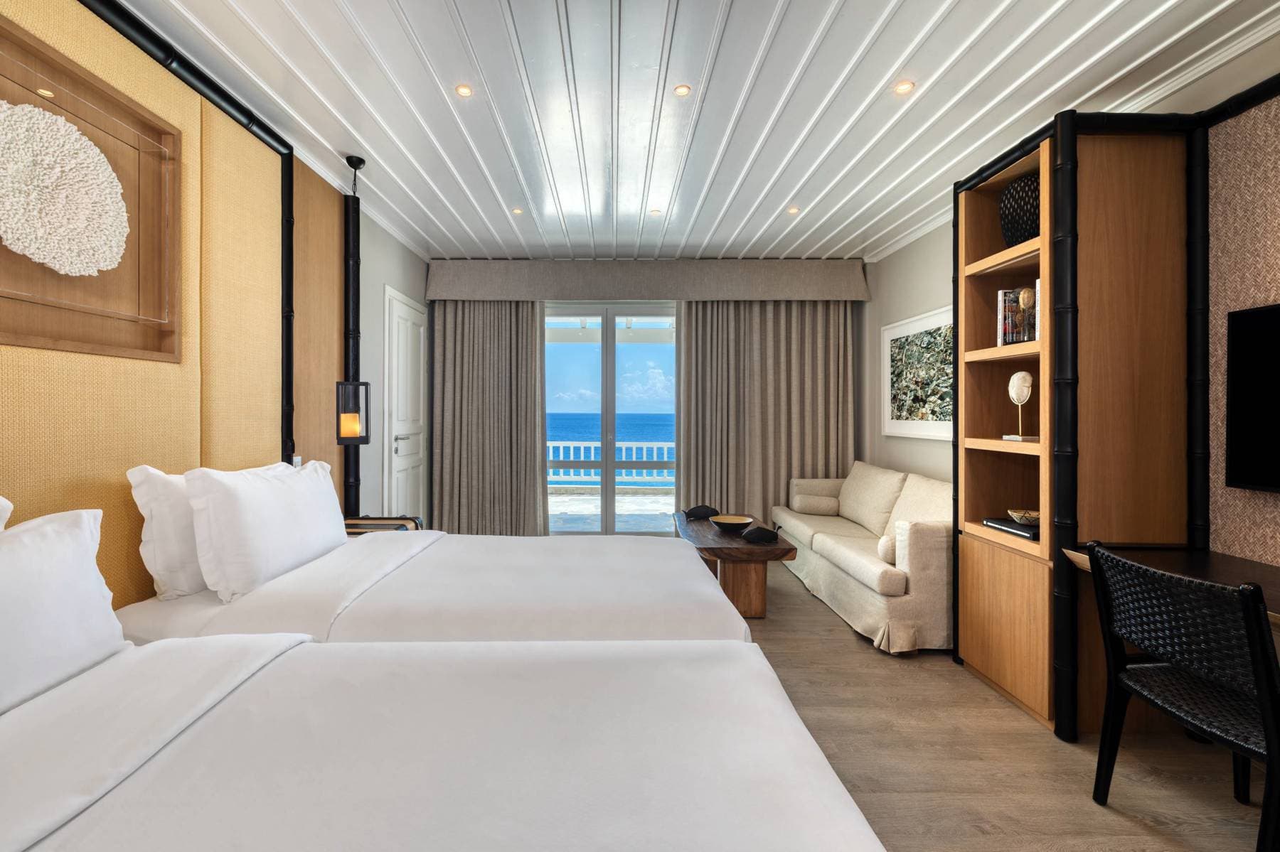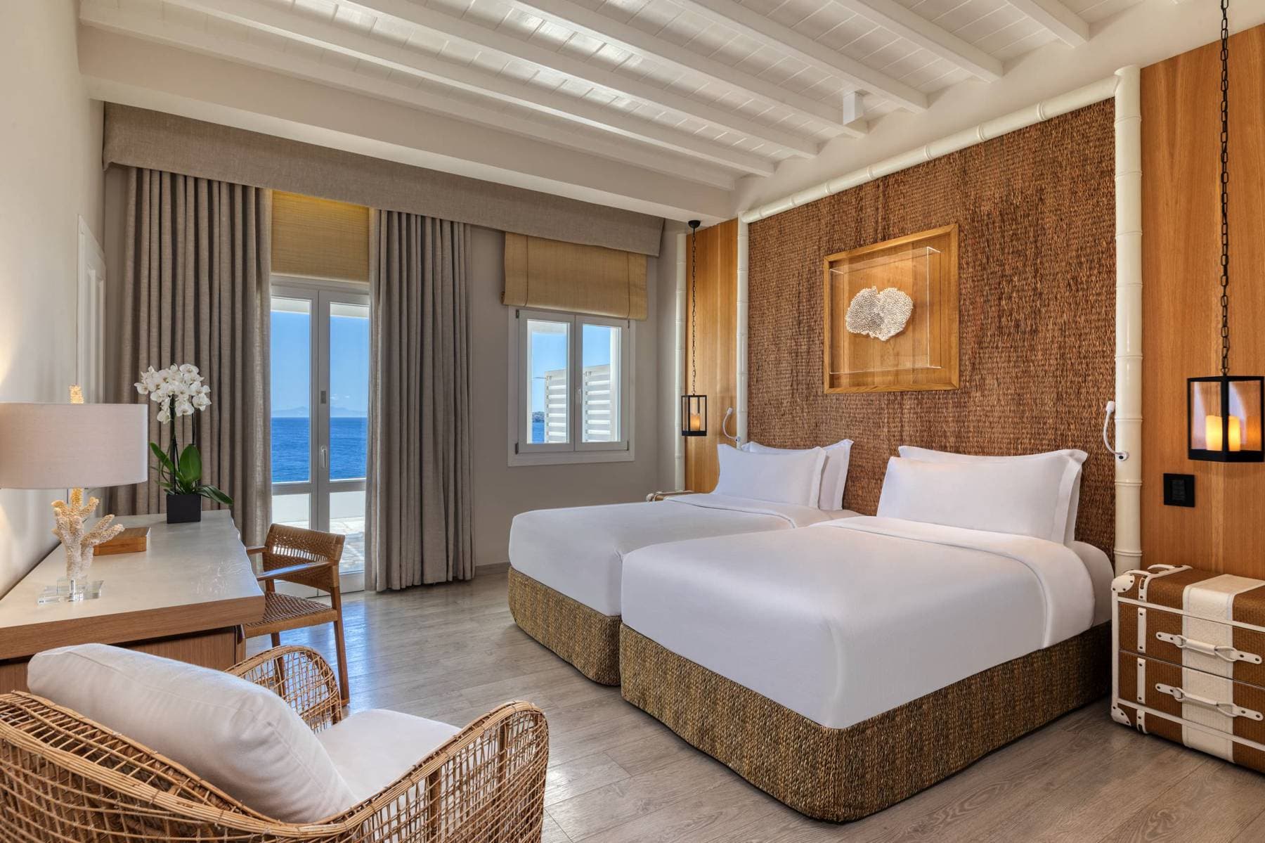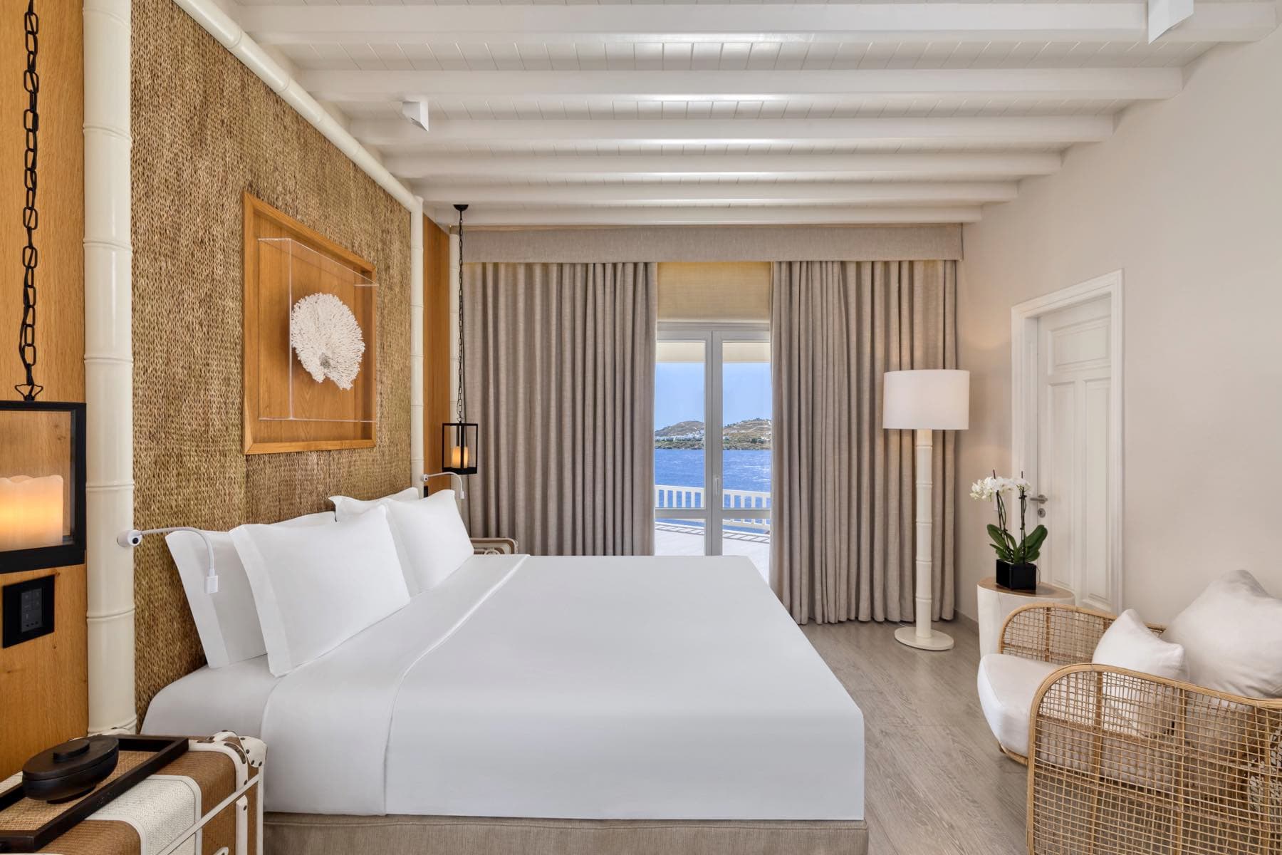 Отель расположен на уединенном полуострове на собственном песчаном пляже, в 3 километрах от города Миконос, в 30 минутах перелета от Афин или в 3 часах езды на катере от порта Пирей (Афины).