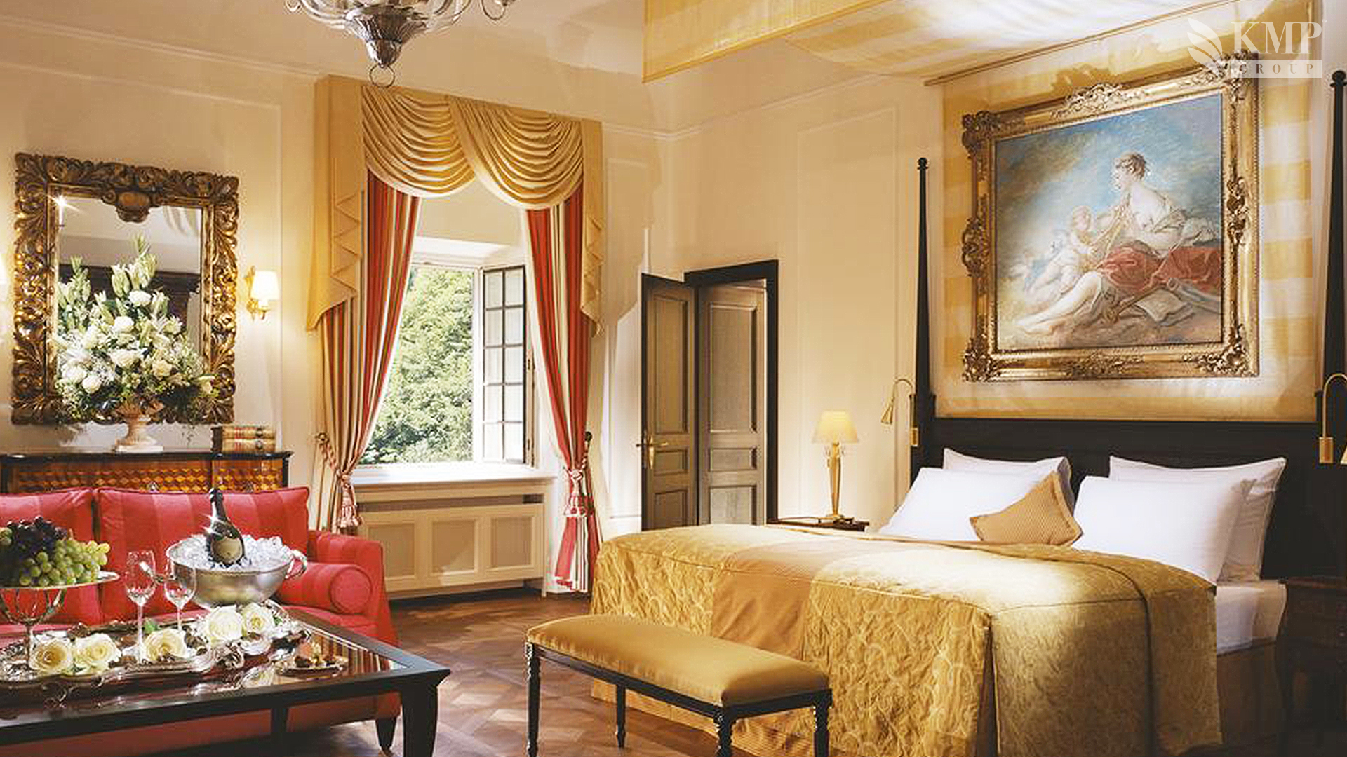 Mozart Suite (240 кв. м). Спальня с удобной кроватью, ванная комната, оборудованная гидромассажной ванной, душем и сауной, расположились на нижнем ярусе двухуровневого номера. Этажом выше гостей ждет терраса, гостиная и мини-кухня. Также есть камин, фортепьяно и персональный лифт. Из окон открывается вид на озеро. Предоставляются услуги личного камердинера.