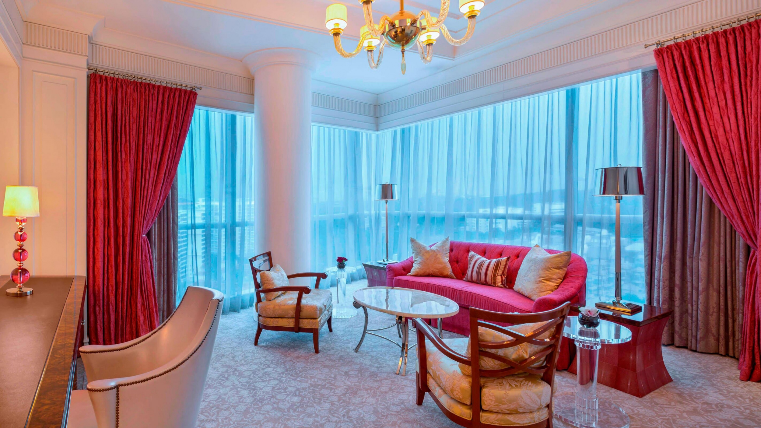 Presidential suite. Терраса, прихожая, гостиная с роялем, столовая (стол на 12 персон), кухня, кабинет, спальня с кроватью king-size, тренажерный зал, 2 ванные комнаты (одна – с джакузи и душевой кабиной с функцией гидромассажа). Дополнительно: парная. Панорамный вид на город и ботанические сады.