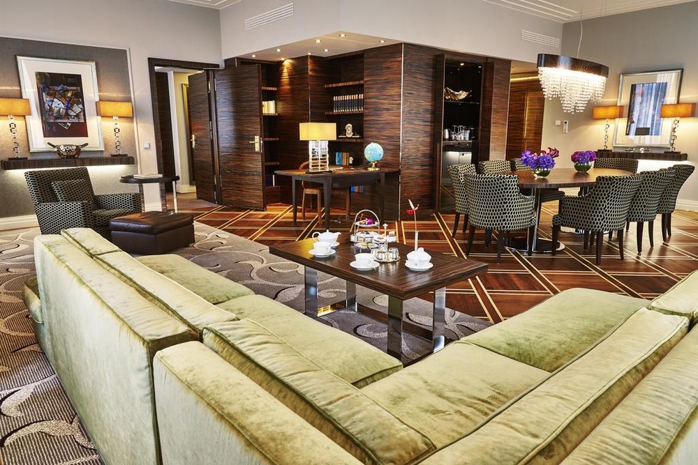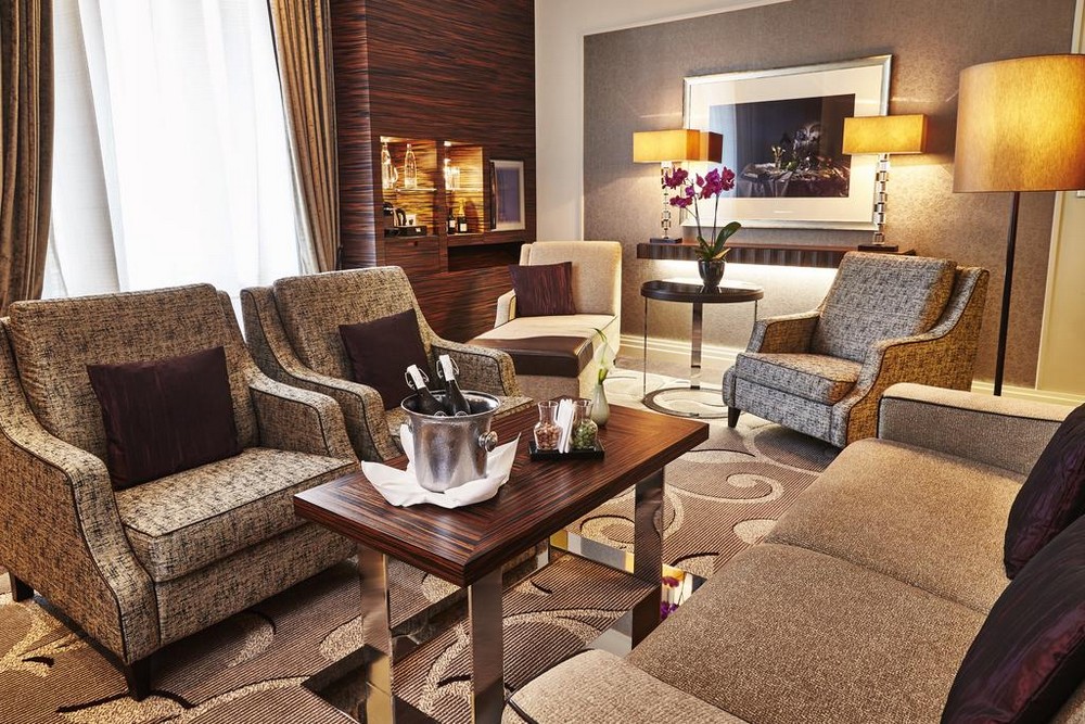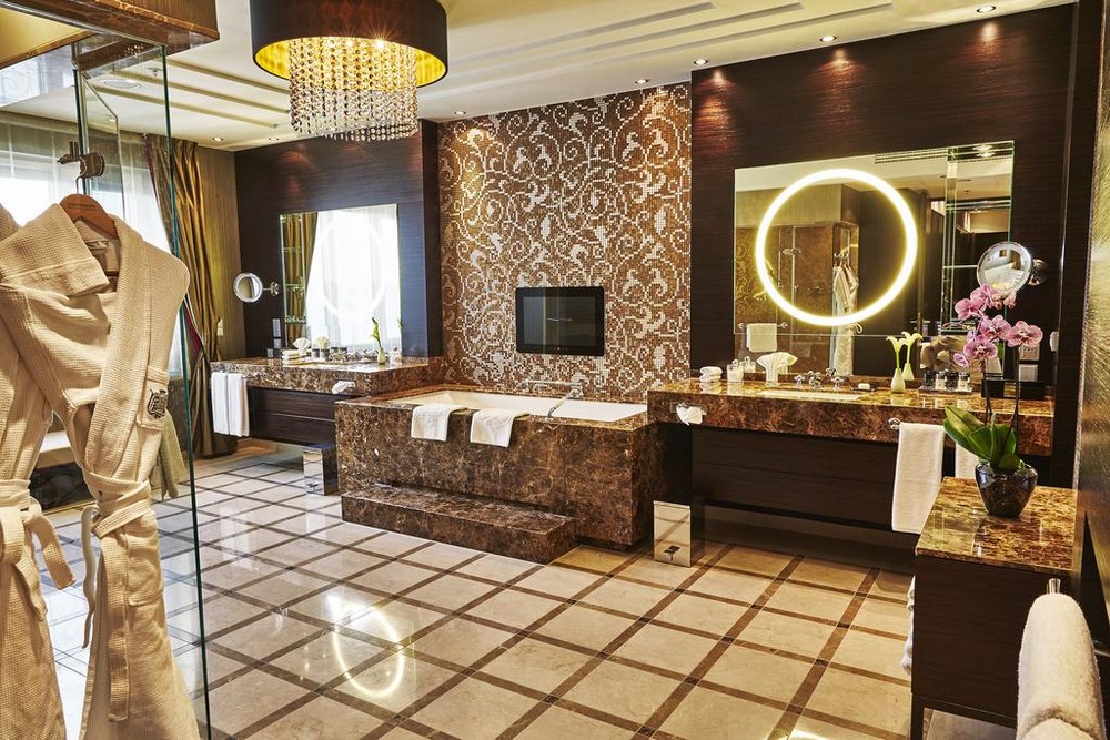 Deluxe suite (120 кв.м). Гостиная с обеденной зоной, спальня, гардеробная, ванная комната с ванной и душевой кабиной с функцией "тропический дождь", гостевой туалет. Дополнительно: кофемашина Nespresso. Вид на город.