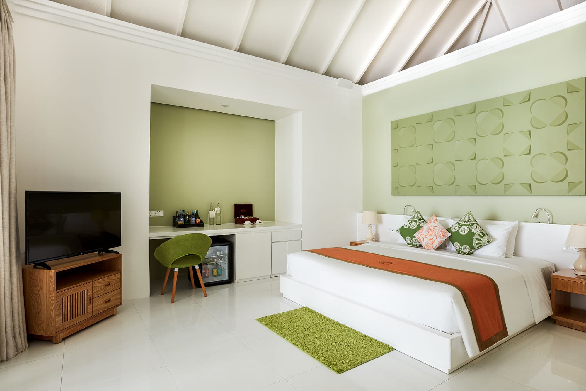 Виллы оборудованы телевизором с плоским экраном и каналами китайского телевидения, DVD-плеером и мини-баром. В некоторых виллах есть собственная терраса для загара и гидромассажная ванна с видом на Индийский океан.