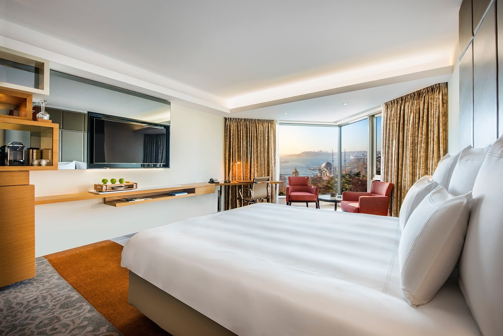 Panorama suite (88 кв. м): спальня с гостиной зоной (кровать king-size), ванная комната с ванной/душем. Дополнительно: аудиосистема Bose, док-станция для iPod, DVD-плеер, факс, принтер, копир. Панорамный вид на пролив Босфор.